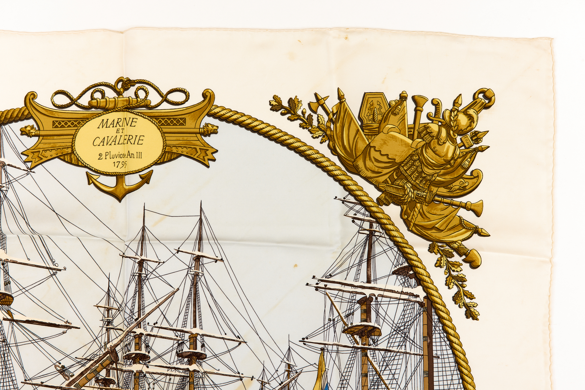 Hermes Silk Scarf Carre 90 “Marine et Cavalerie” White Silk Scarf Brand : HERMESDesign by Philippe Ledoux Issued 1967Item : ScarfSize : 88.5cm * 88.5cmMaterial : 100% SilkCondition Score: B-C*For reference. The condition shown in the image takes precedence.*Please see the last two photos to see if the tag is still attached
