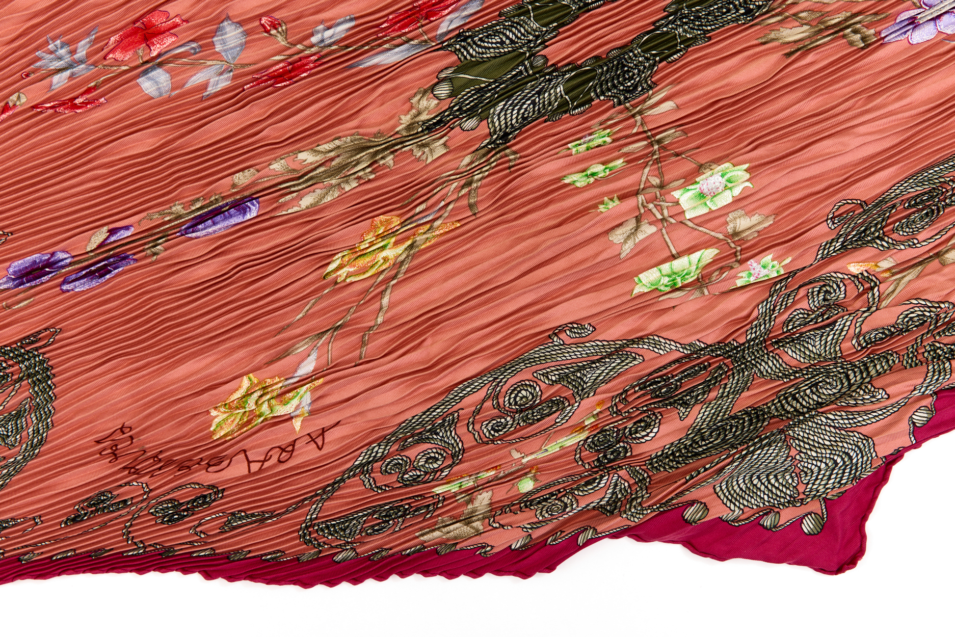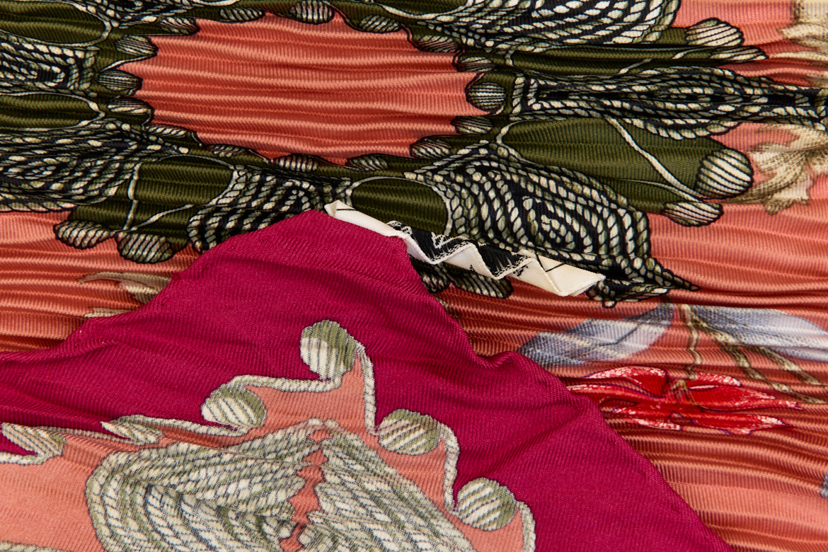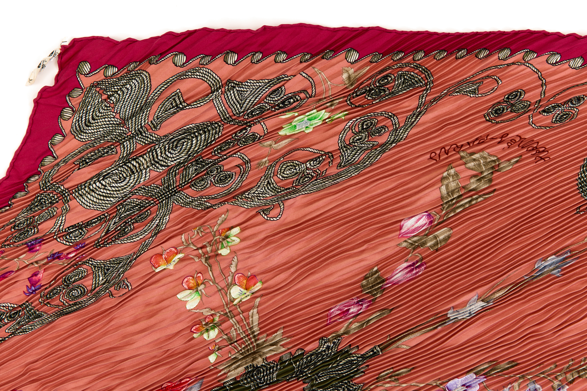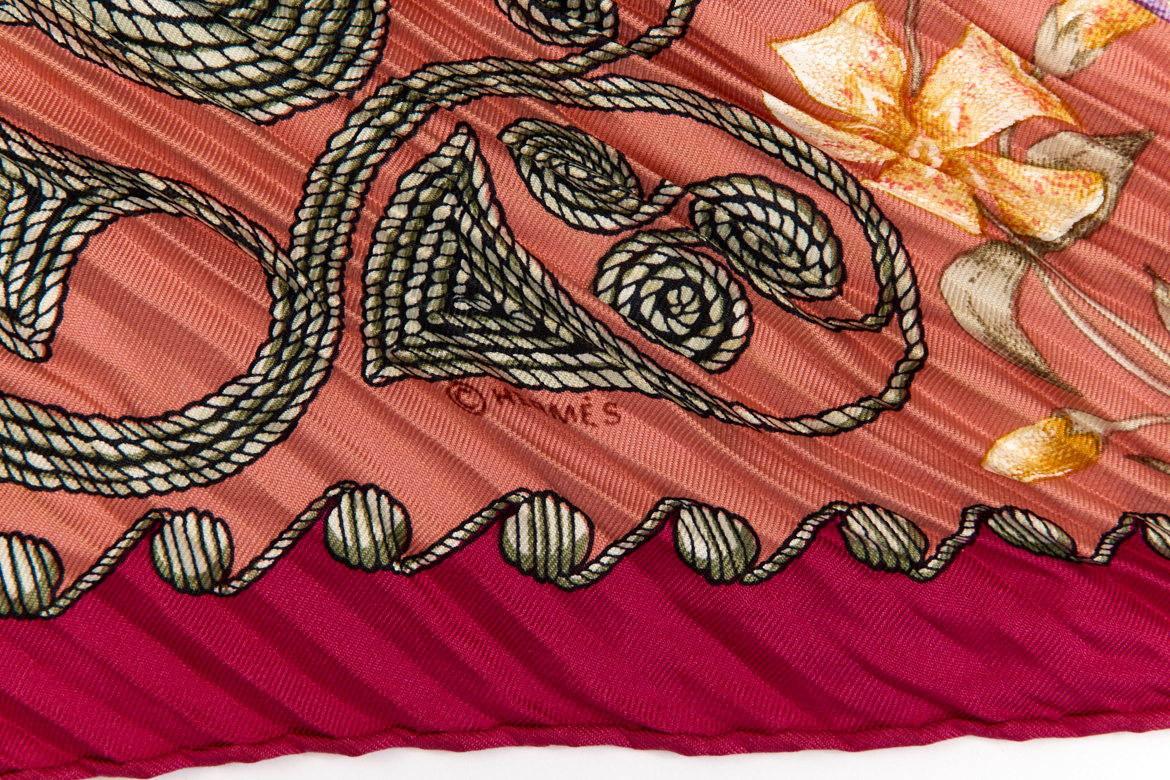 Hermes Silk Scarf Carre 90 “ARABESQUES” Pink,Red Silk Pleats Scarf