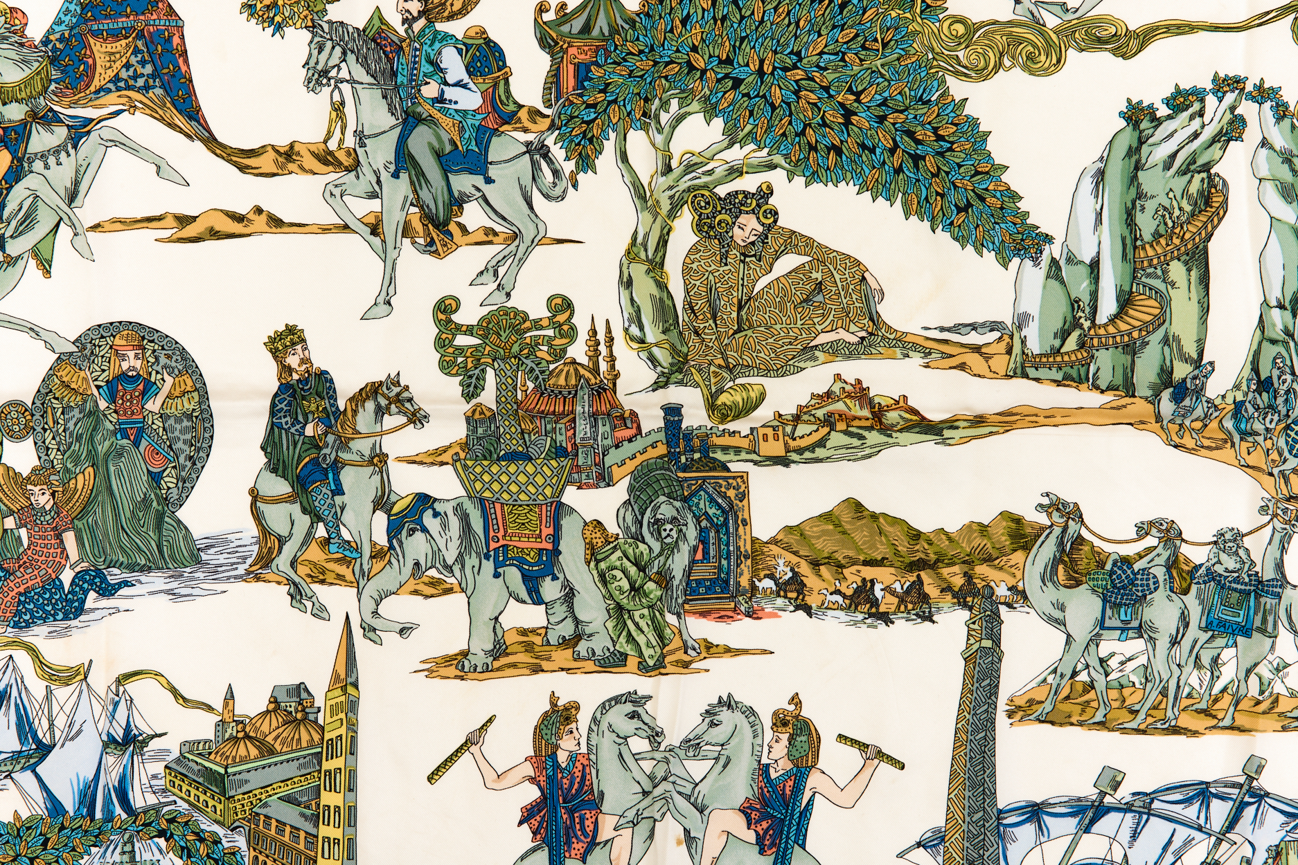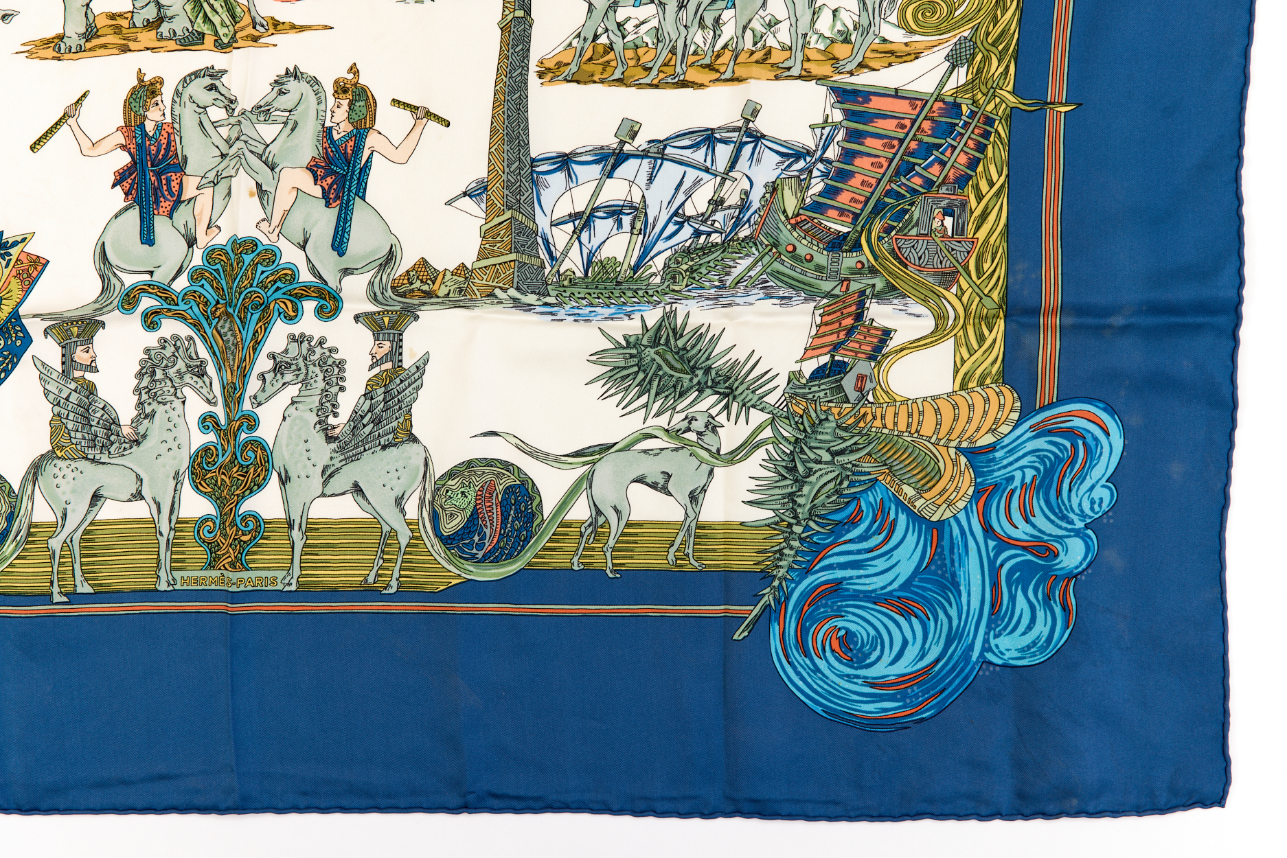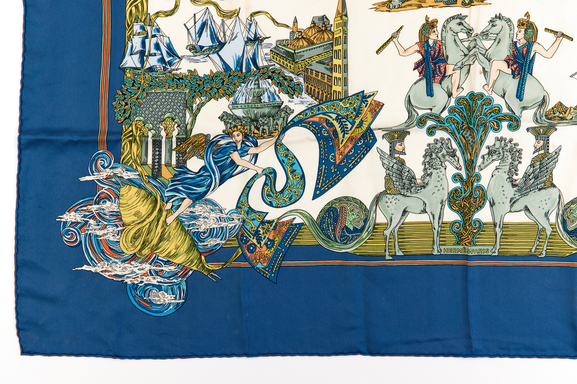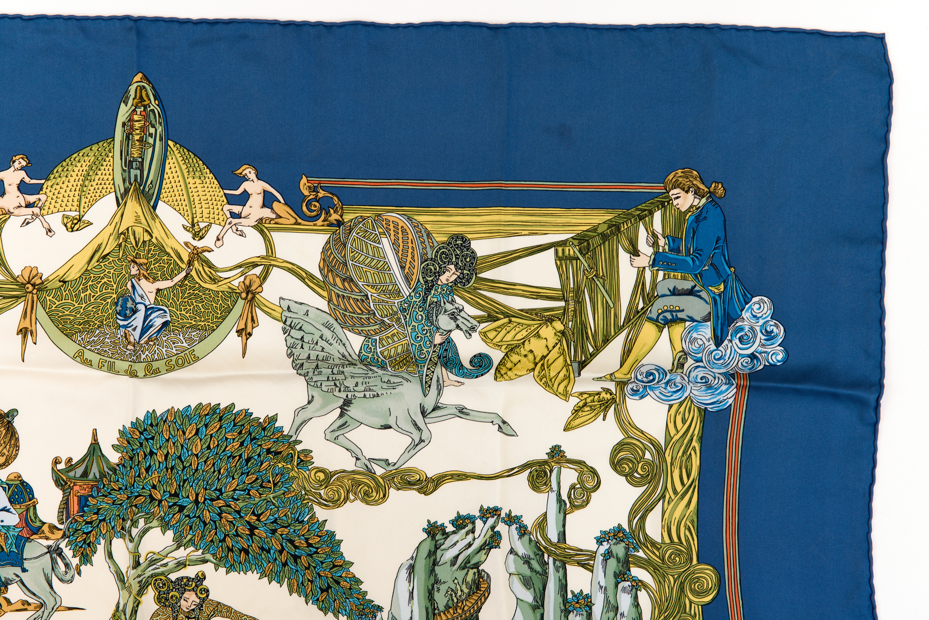 Hermes Silk Scarf Carre 90 “Au FIL de la SOIE” Blue Silk Scarf