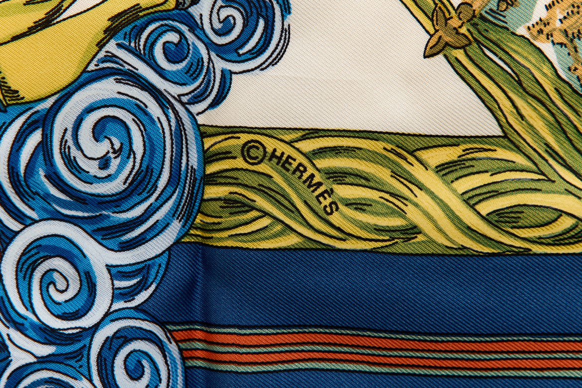 Hermes Silk Scarf Carre 90 “Au FIL de la SOIE” Blue Silk Scarf Brand : HERMESDesign by Annie Faivre Issued 1995Item : ScarfSize : 88.5cm * 88.5cmMaterial : 100% SilkCondition Score: B*For reference. The condition shown in the image takes precedence.*Please see the last two photos to see if the tag is still attached