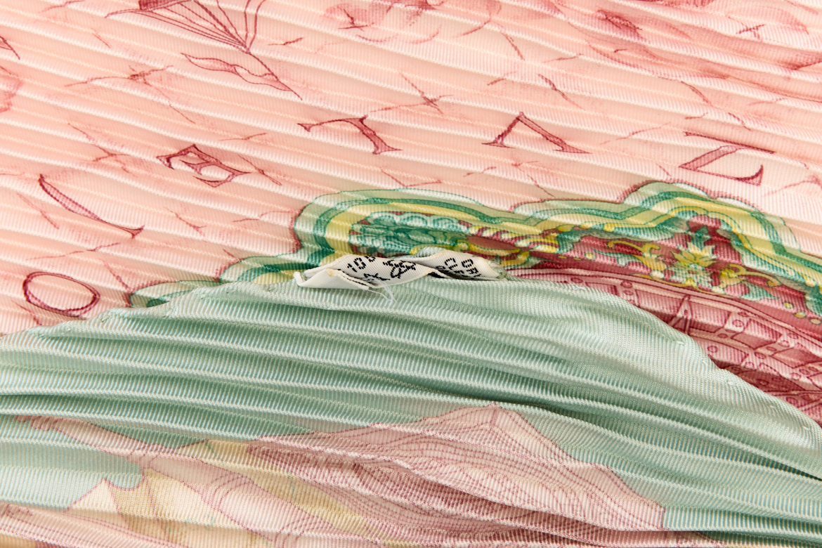 Hermes Silk Scarf Carre 90 “AZVLEJOS” Green Silk Pleats Scarf with Box Brand : HERMESDesign by Catherine Baschet Issued 1992Item : ScarfSize : 88.5cm * 88.5cmMaterial : 100% SilkCondition Score: B+*For reference. The condition shown in the image takes precedence.*Please see the last two photos to see if the tag is still attached