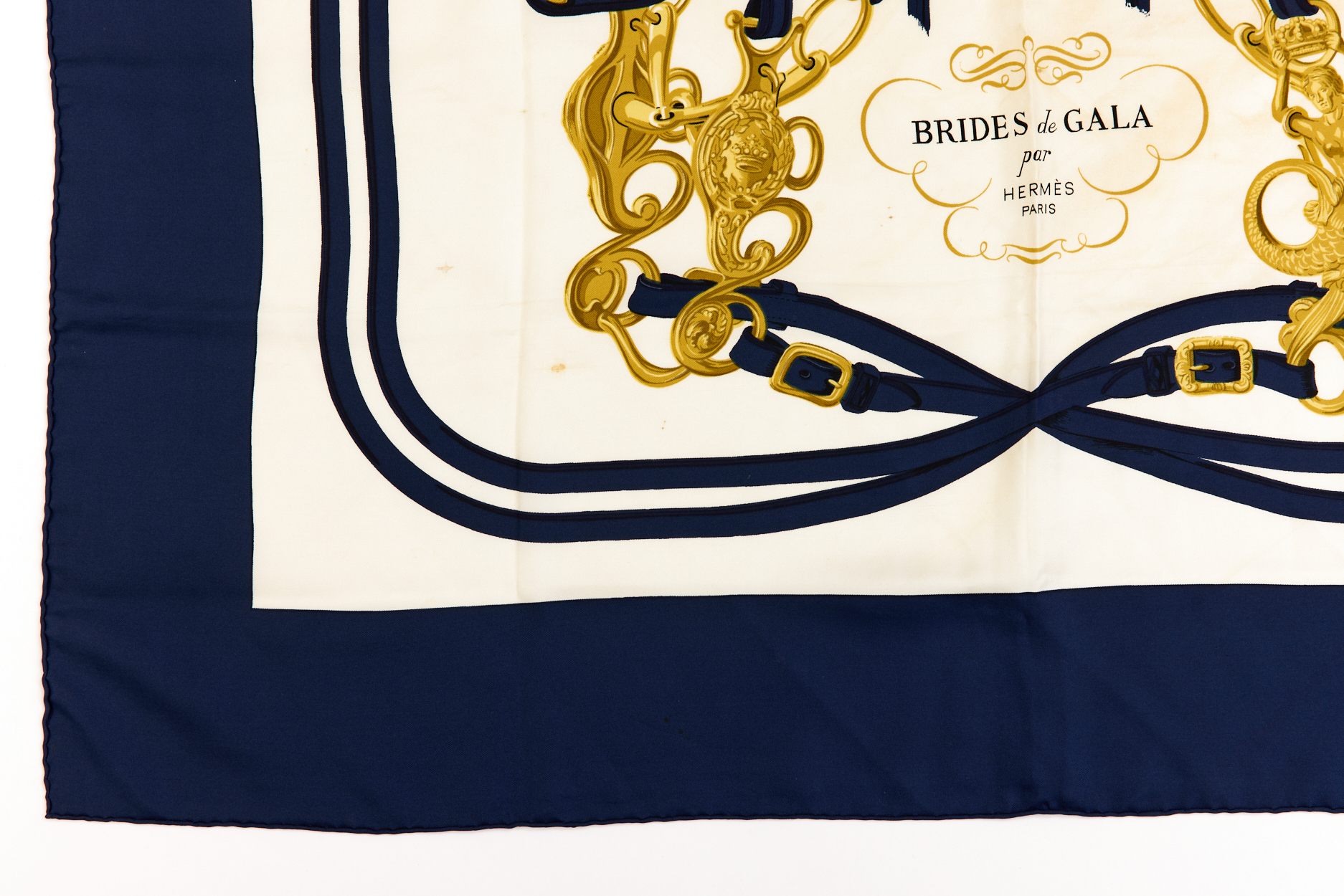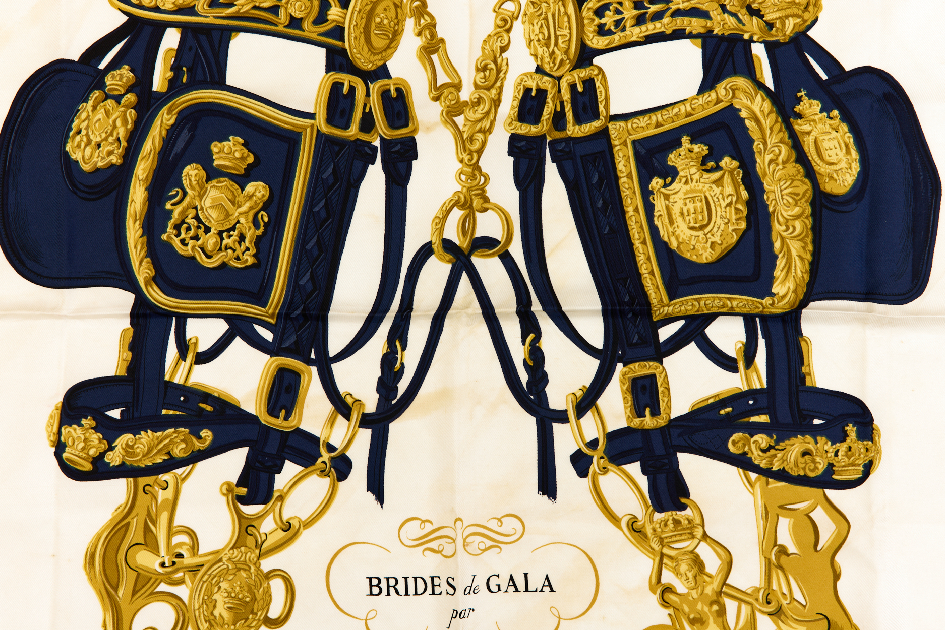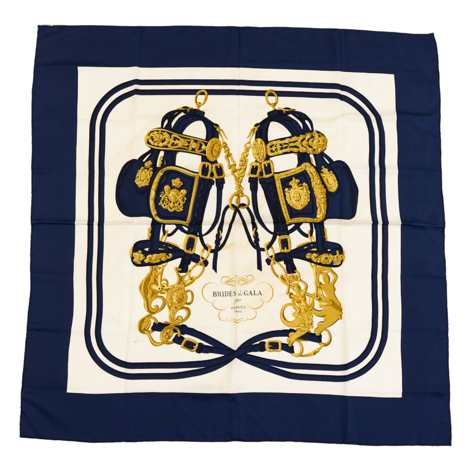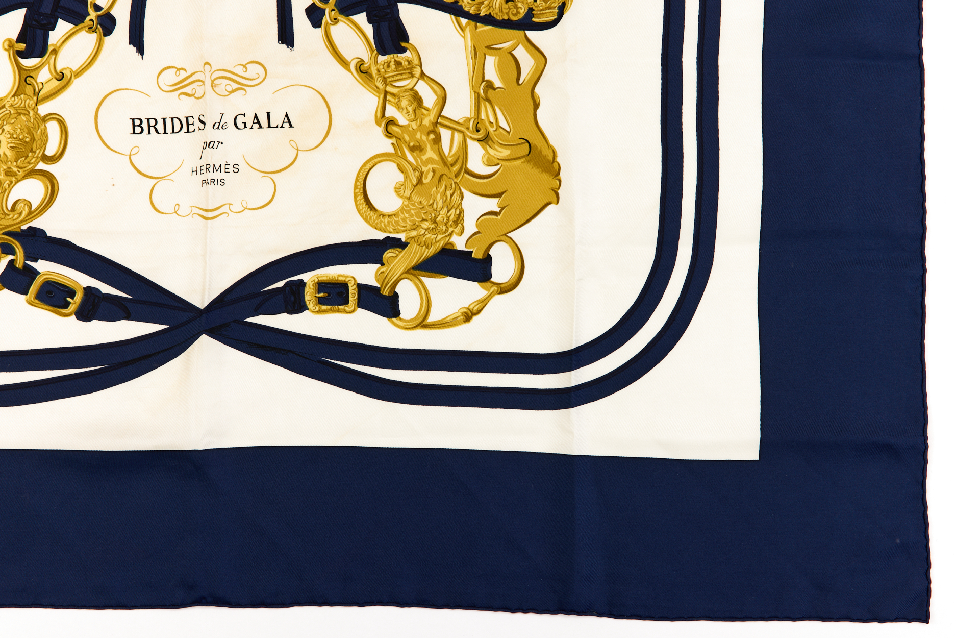 Hermes Silk Scarf Carre 90 “BRIDES de GALA” Blue Silk Scarf Brand : HERMESDesign by Hugo Grygkar Issued 1957Item : ScarfSize : 88.5cm * 88.5cmMaterial : 100% SilkCondition Score: B*For reference. The condition shown in the image takes precedence.*Please see the last two photos to see if the tag is still attached