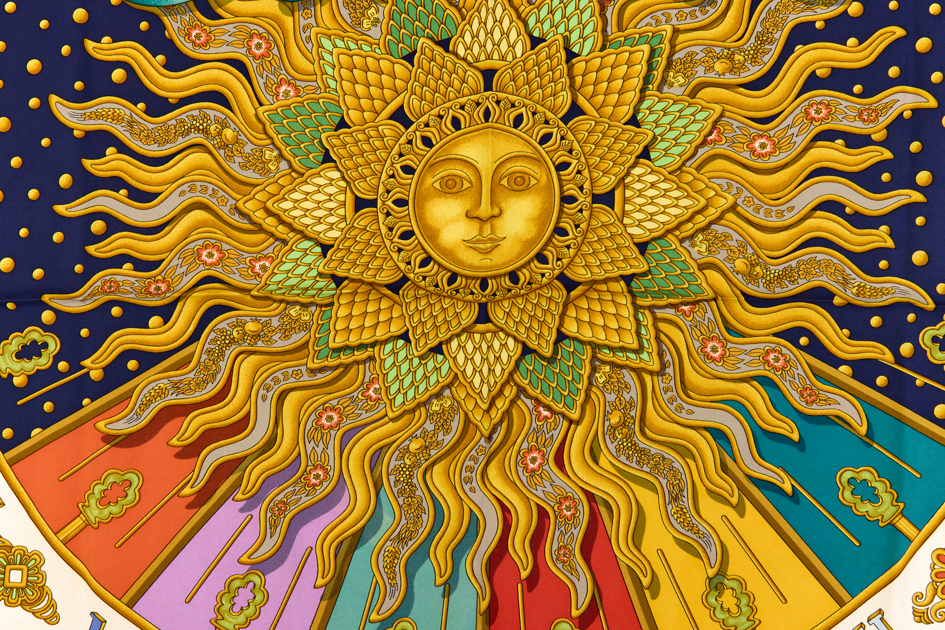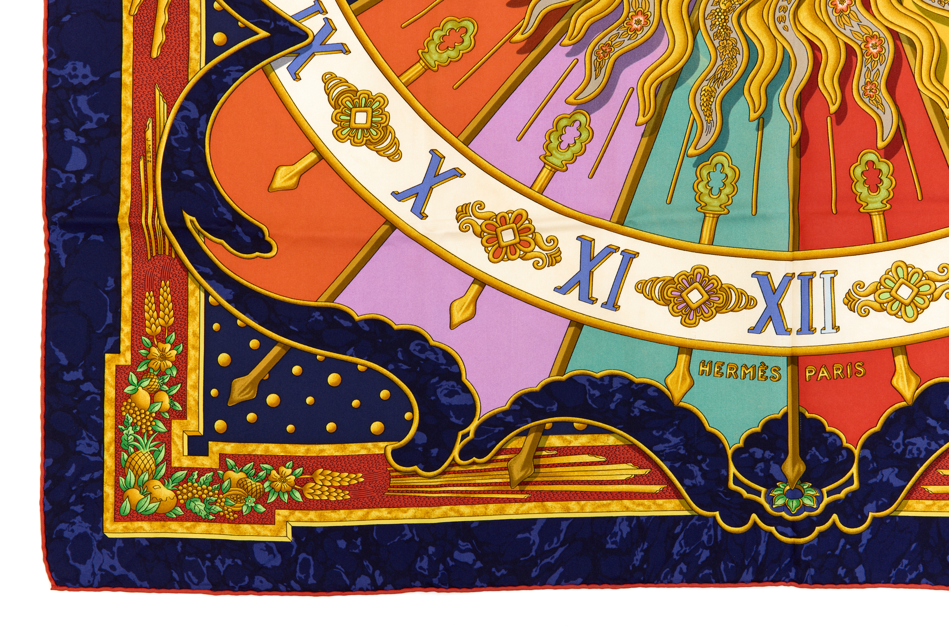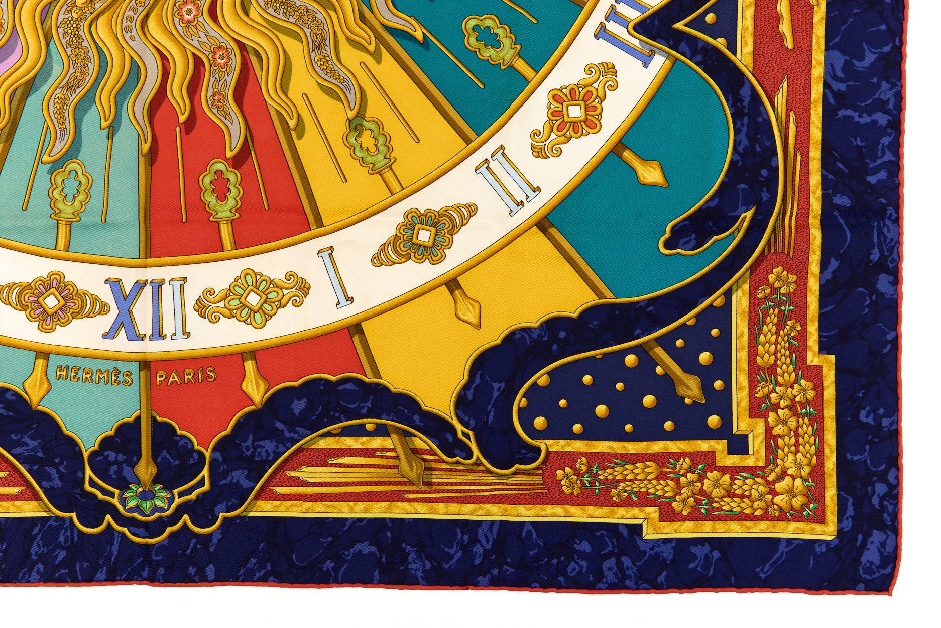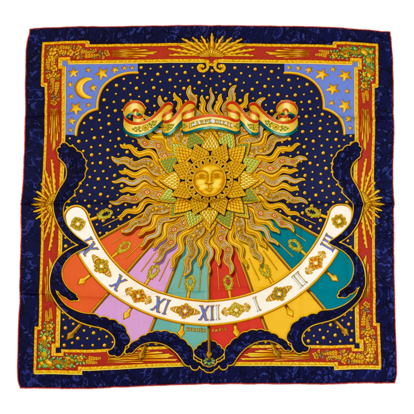 Hermes Silk Scarf Carre 90 “CARPE DIEM” Blue Silk Scarf Brand : HERMESDesign by Joachim Metz Issued 1994Item : ScarfSize : 88.5cm * 88.5cmMaterial : 100% SilkCondition Score: A-B+*For reference. The condition shown in the image takes precedence.*Please see the last two photos to see if the tag is still attached