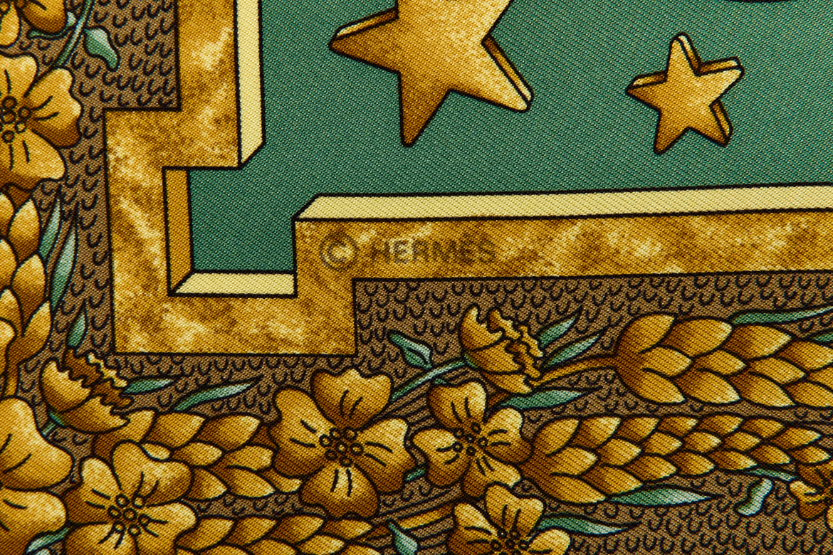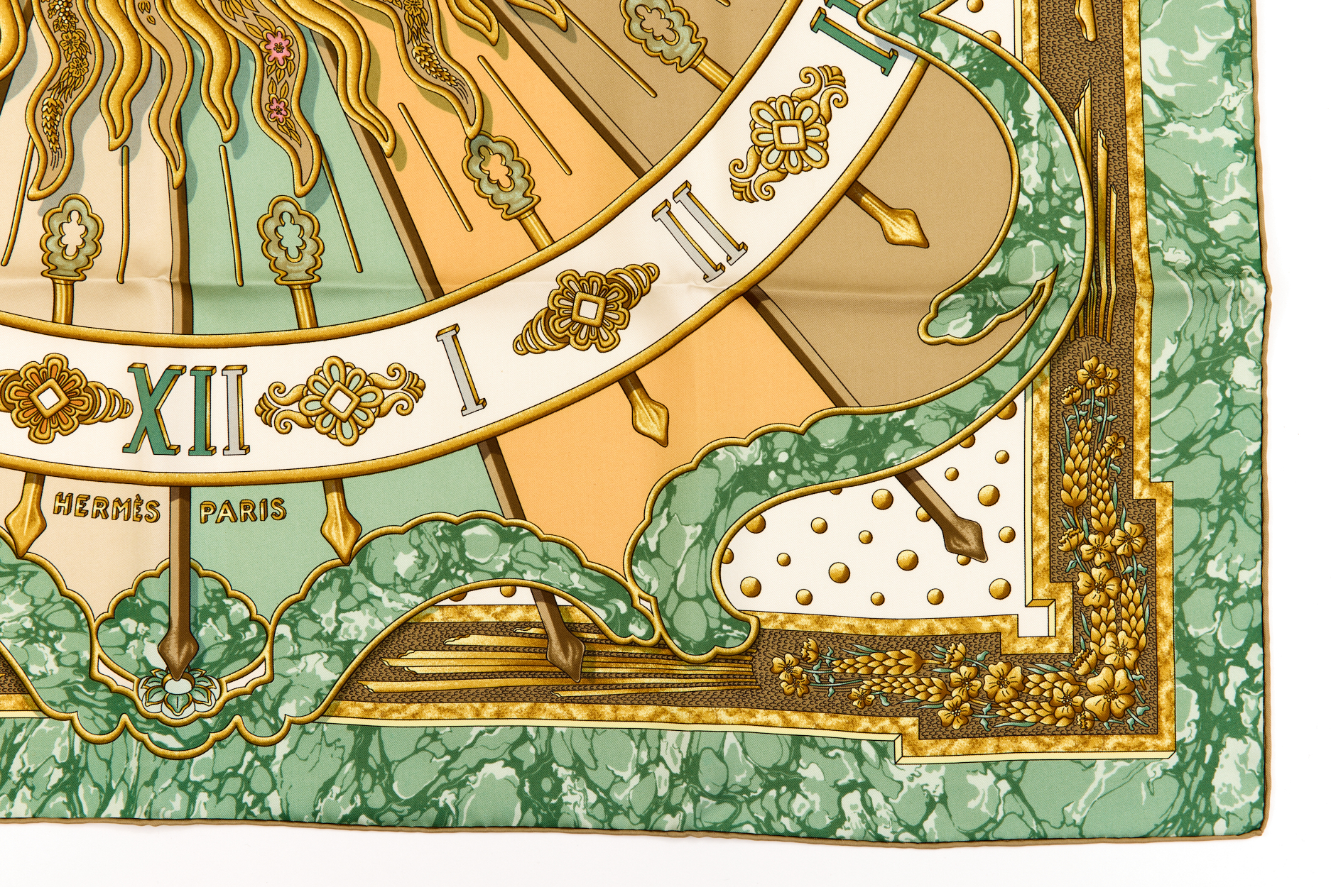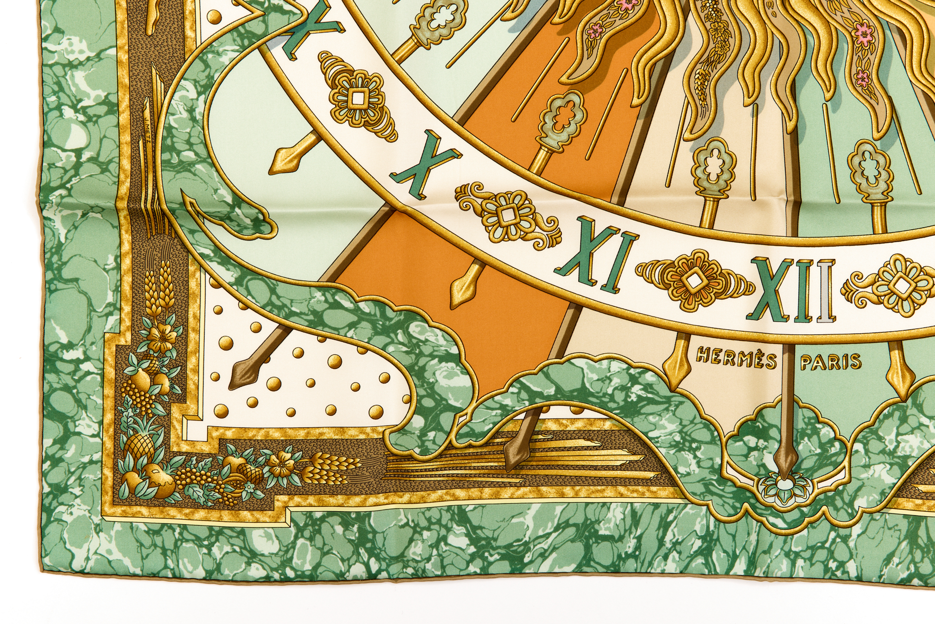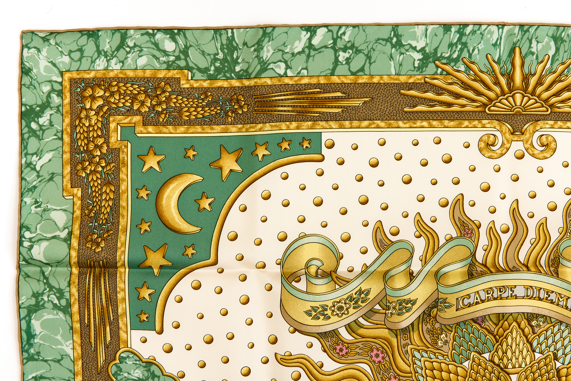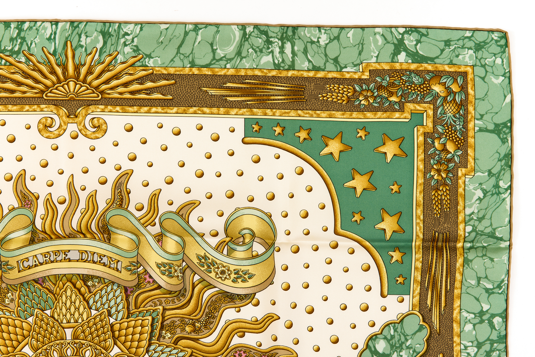 Hermes Silk Scarf Carre 90 “CARPE DIEM” Green Silk Scarf