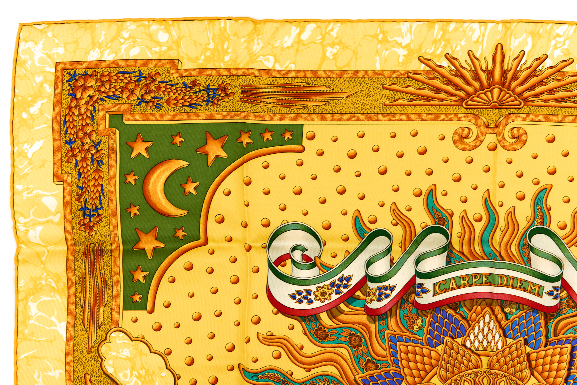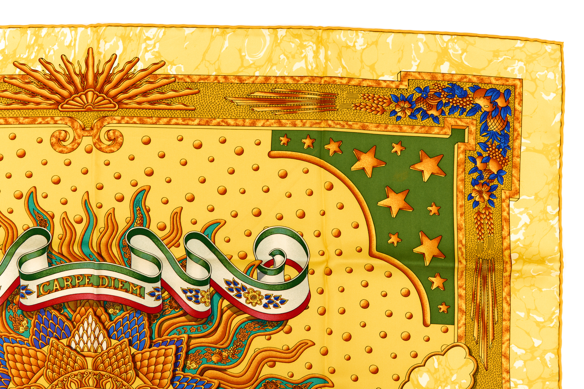 Hermes Silk Scarf Carre 90 “CARPE DIEM” Yellow Silk Scarf