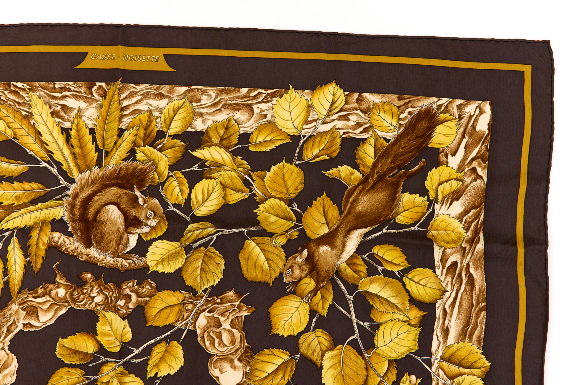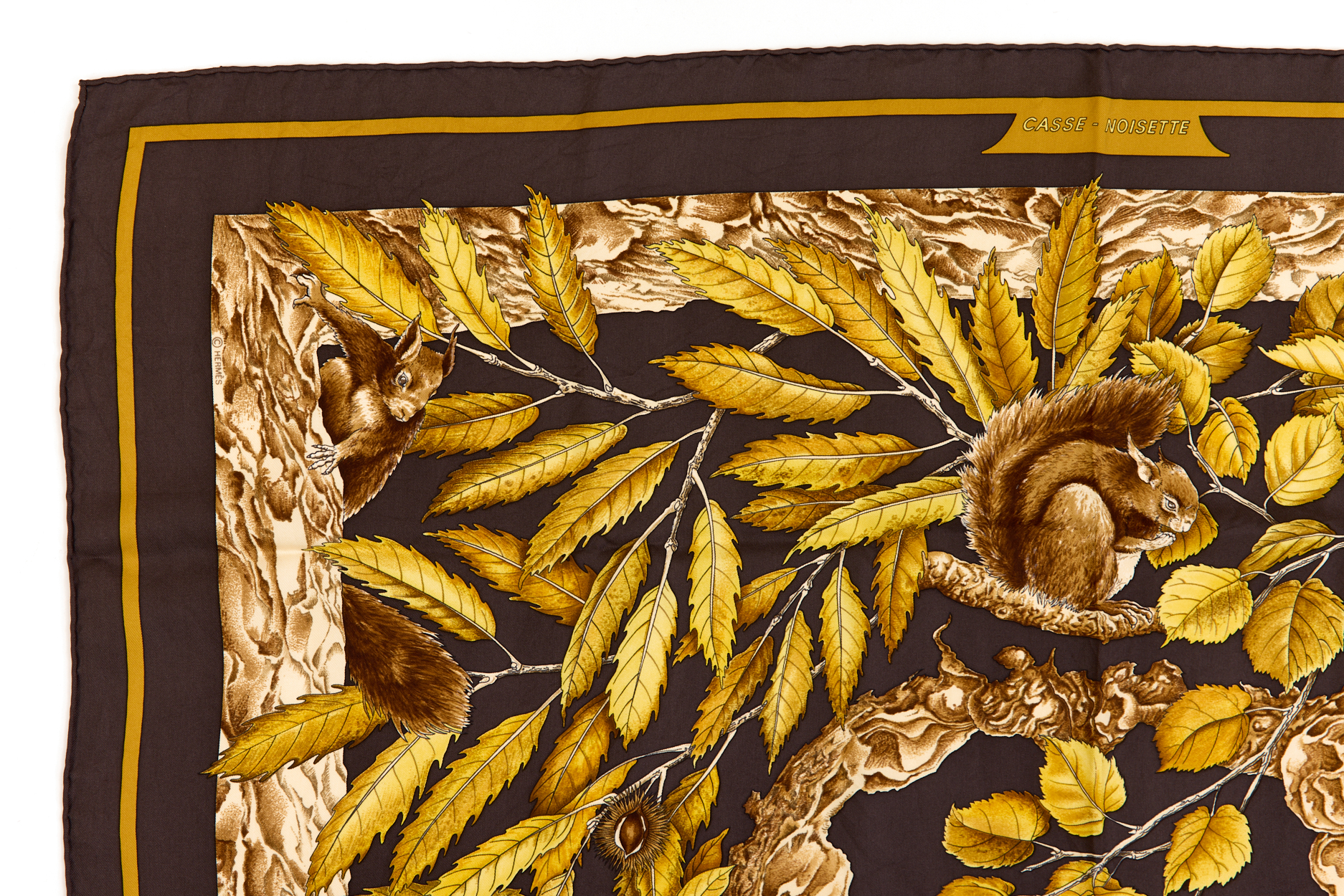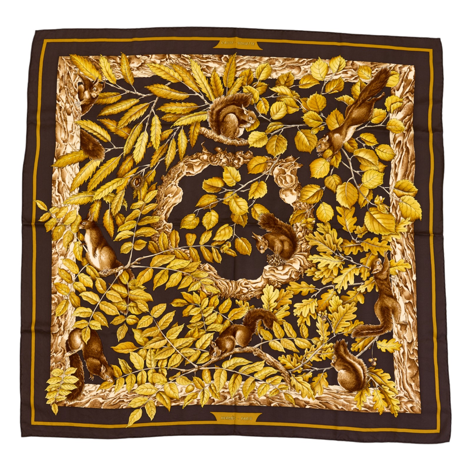 Hermes Silk Scarf Carre 90 “Casse Noisette Squirrel” Brown Silk Scarf