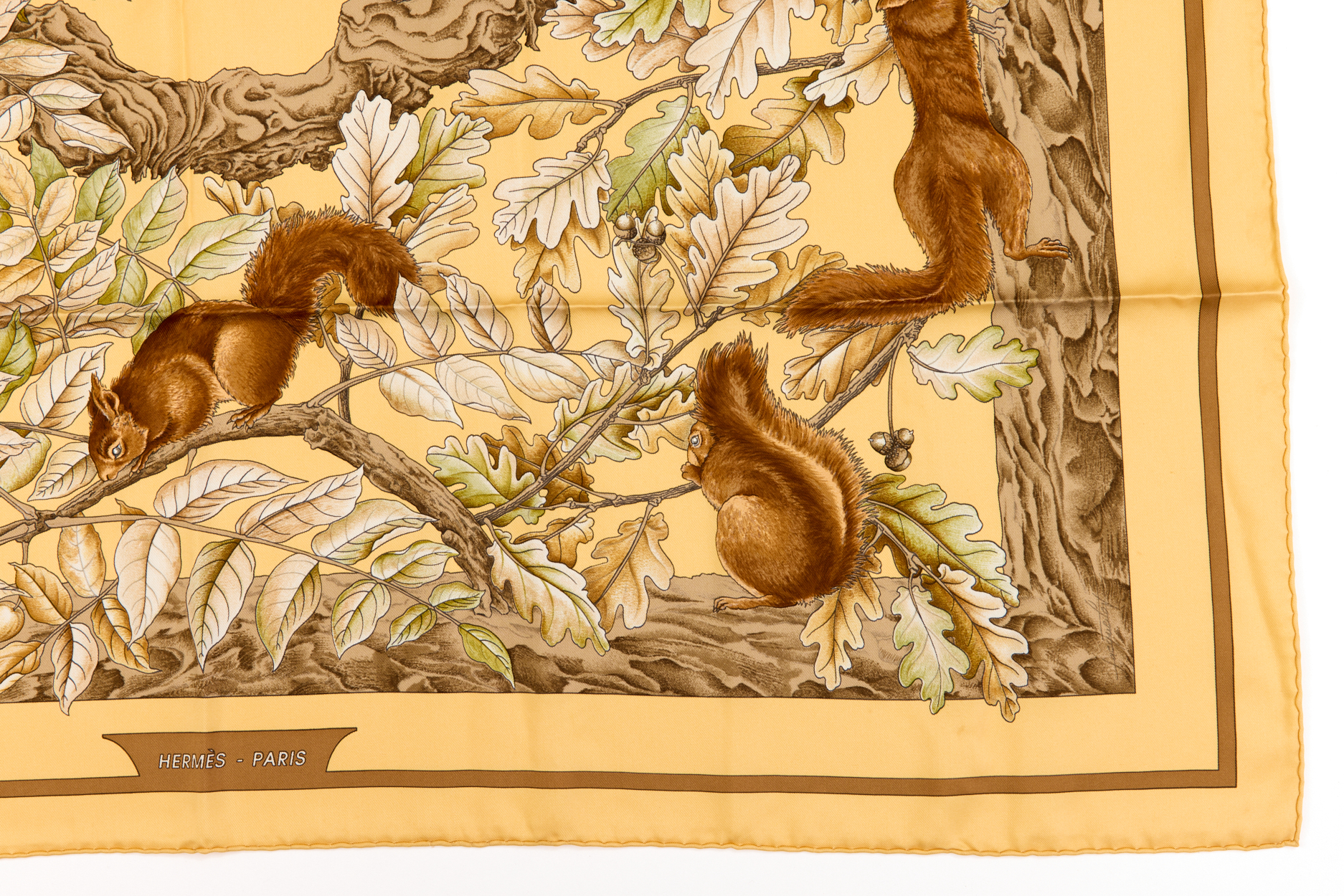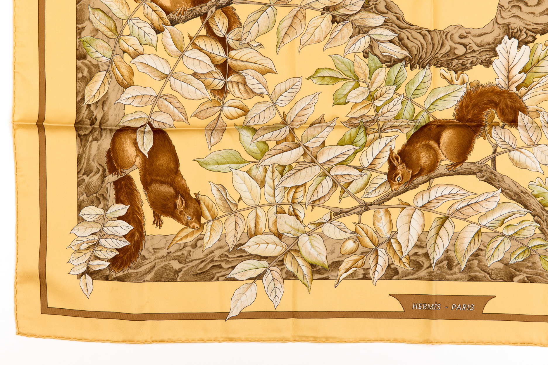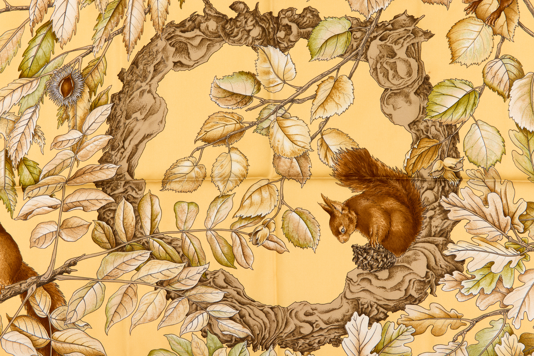 Hermes Silk Scarf Carre 90 “Casse Noisette Squirrel” Yellow Silk Scarf