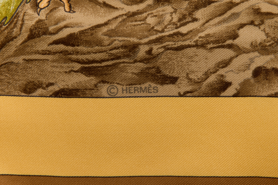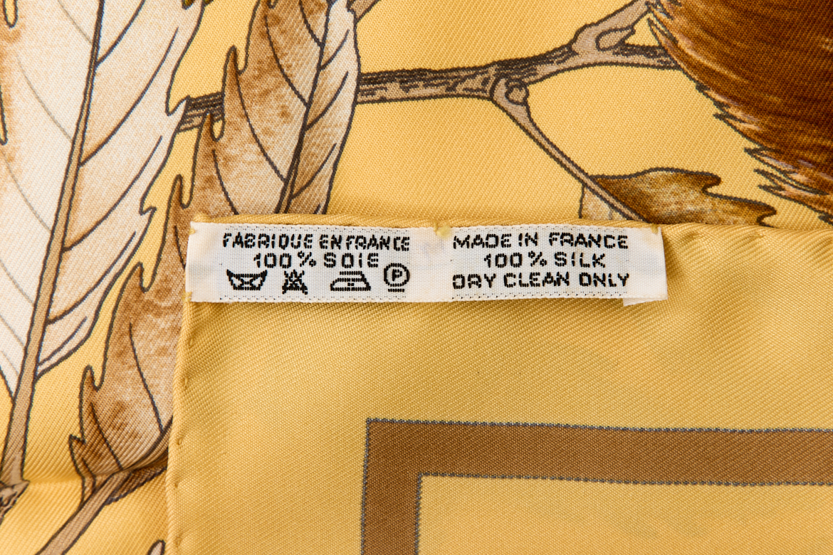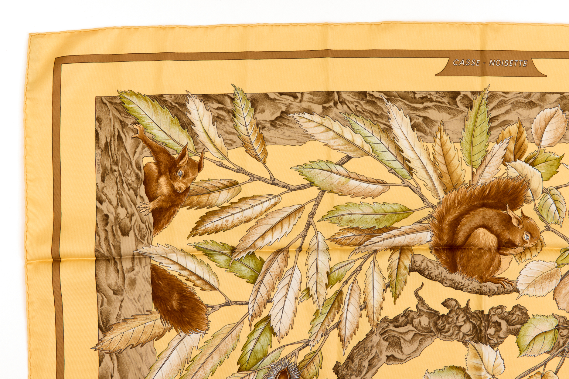 Hermes Silk Scarf Carre 90 “Casse Noisette Squirrel” Yellow Silk Scarf