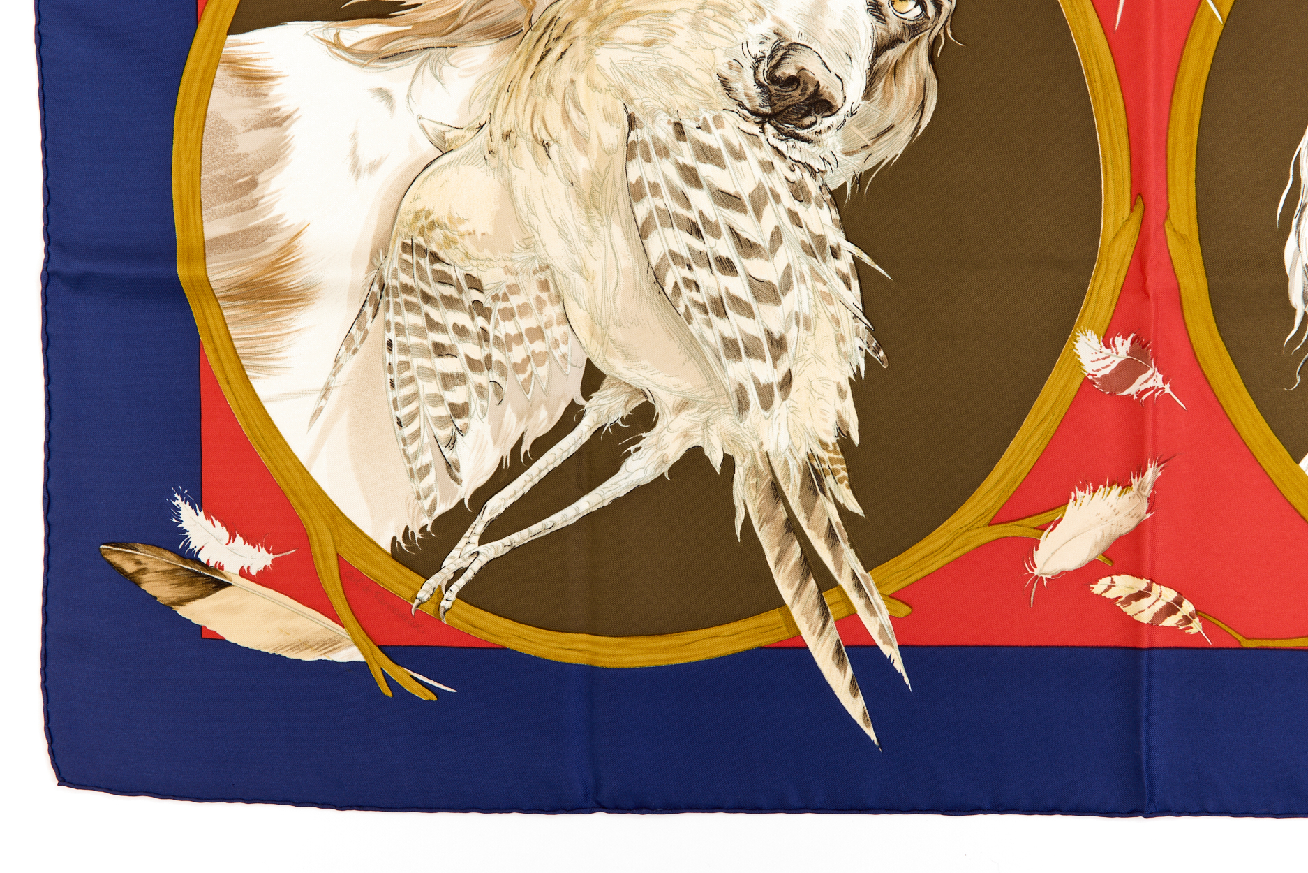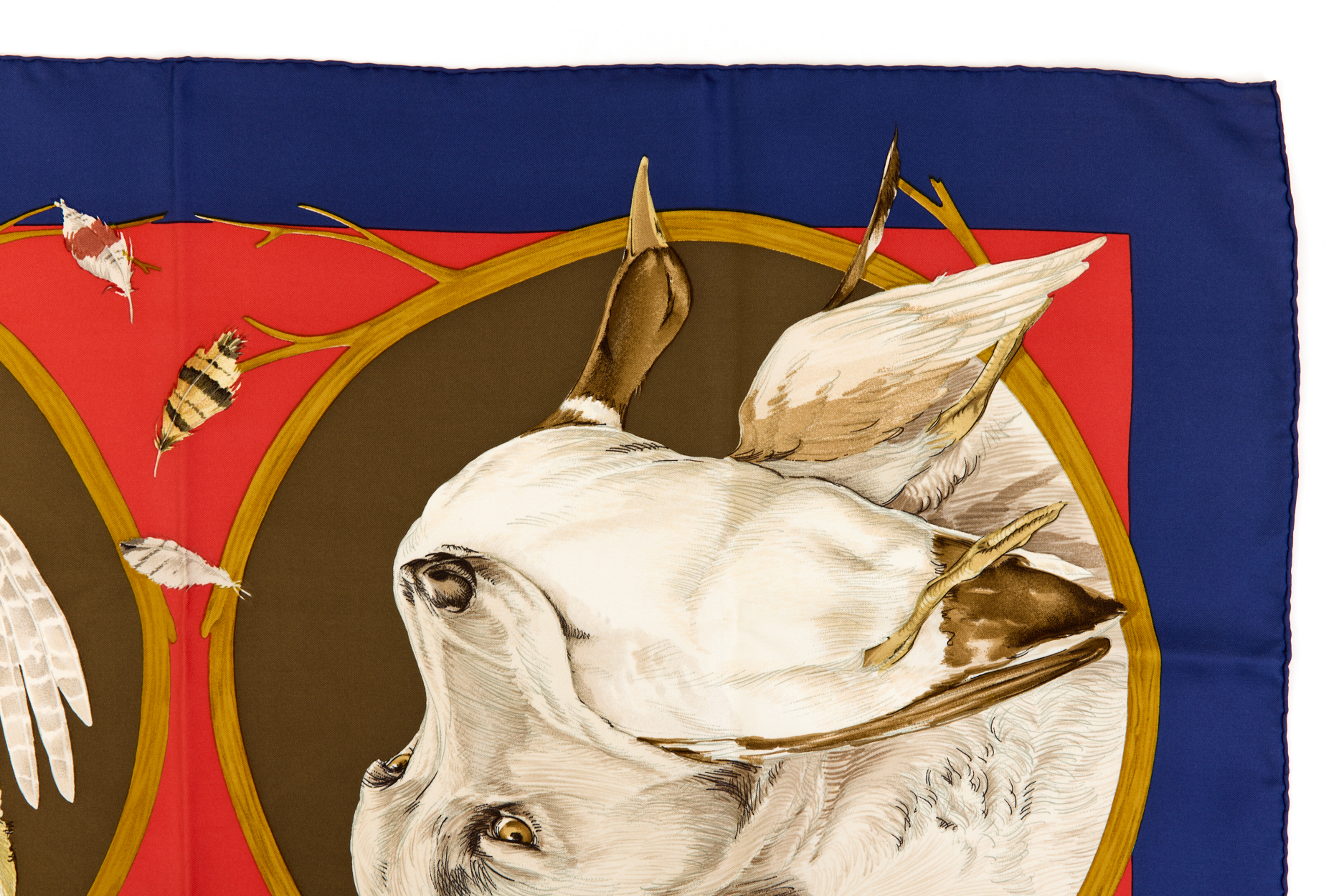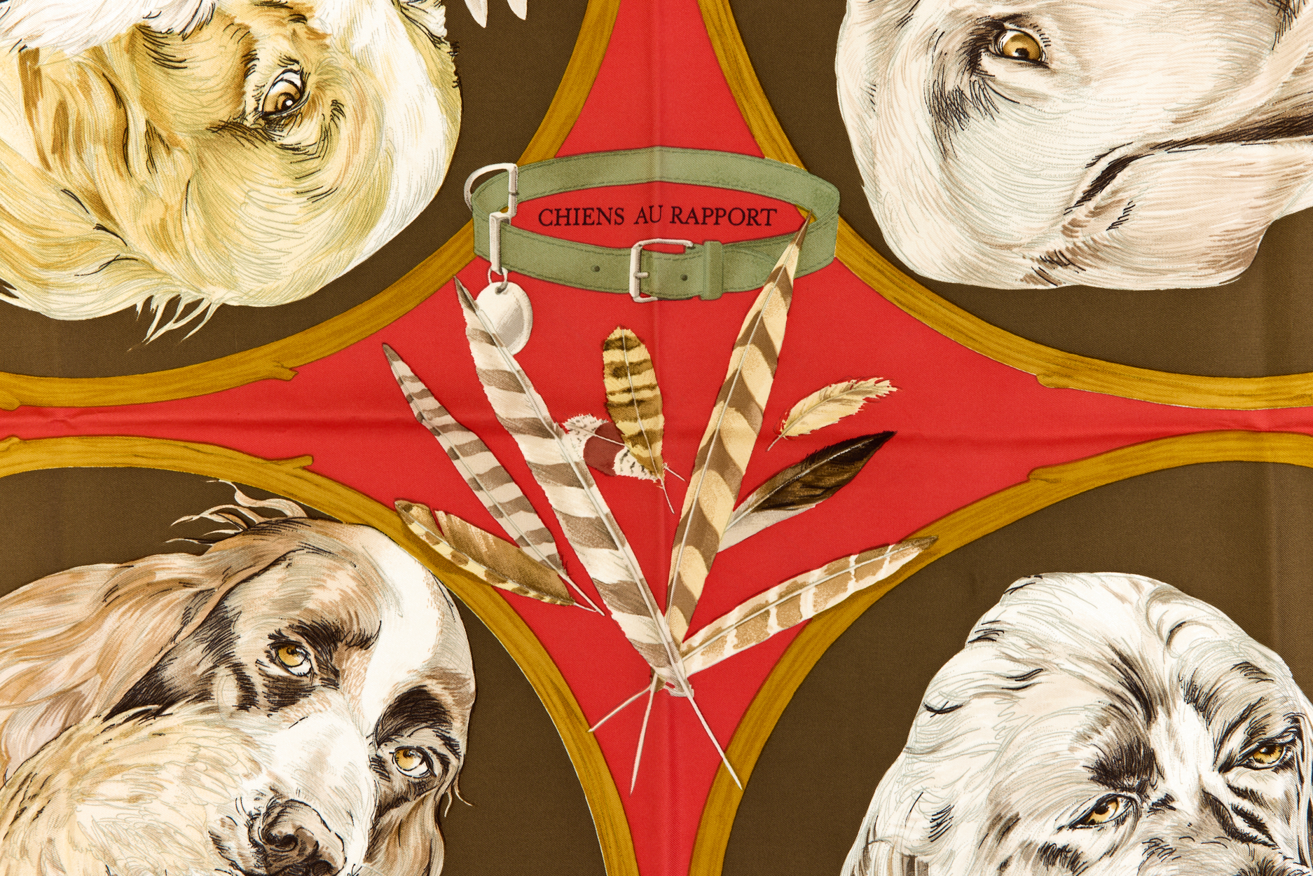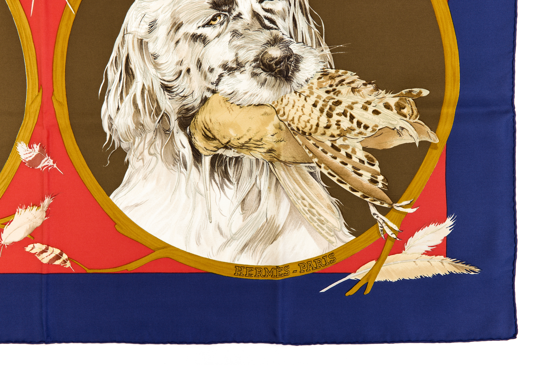 Hermes Silk Scarf Carre 90 “CHIENS AU RAPPORT” Blue Silk Scarf Brand : HERMESDesign by Carl De Parcevaux Issued 1987Item : ScarfSize : 88.5cm * 88.5cmMaterial : 100% SilkCondition Score: B+*For reference. The condition shown in the image takes precedence.*Please see the last two photos to see if the tag is still attached