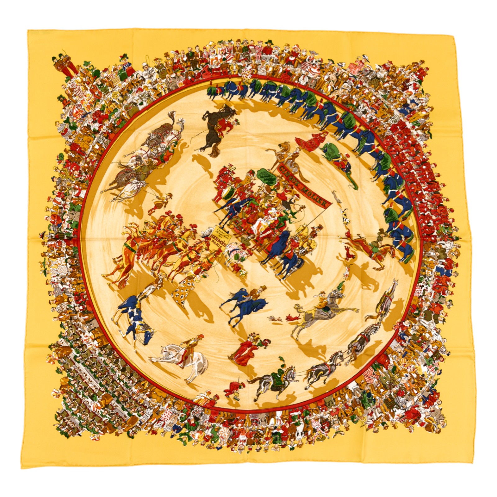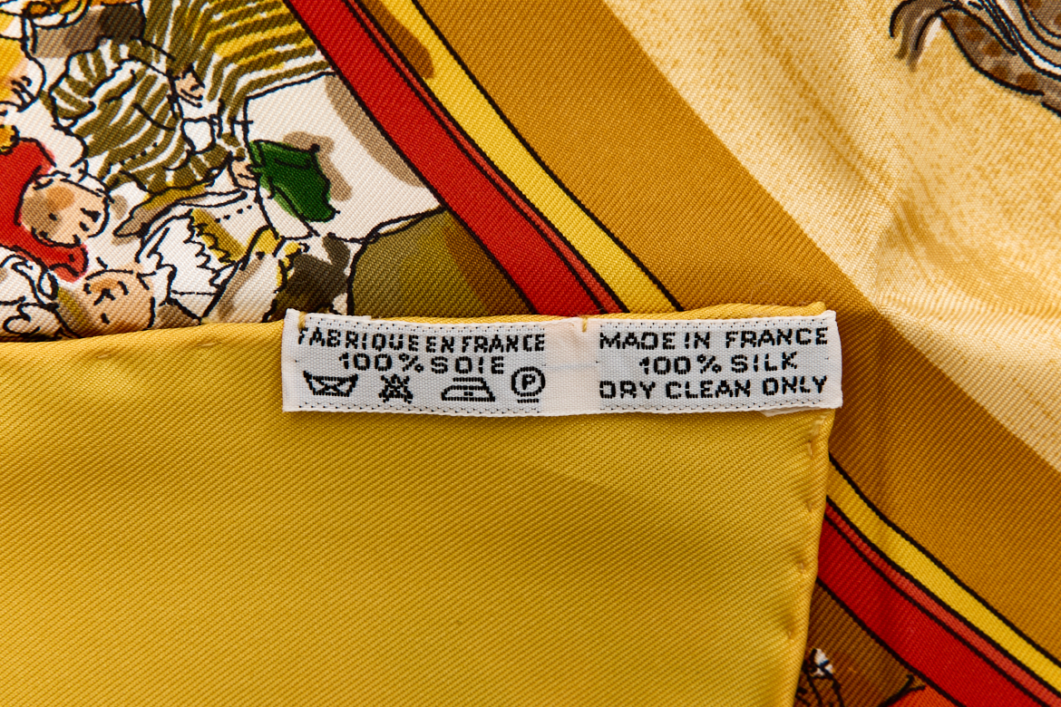 Hermes Silk Scarf Carre 90 “CIRQUE MOLIER” Yellow Silk Scarf Brand : HERMESDesign by Philippe Ledoux Issued 1983Item : ScarfSize : 88.5cm * 88.5cmMaterial : 100% SilkCondition Score: A-B+*For reference. The condition shown in the image takes precedence.*Please see the last two photos to see if the tag is still attached