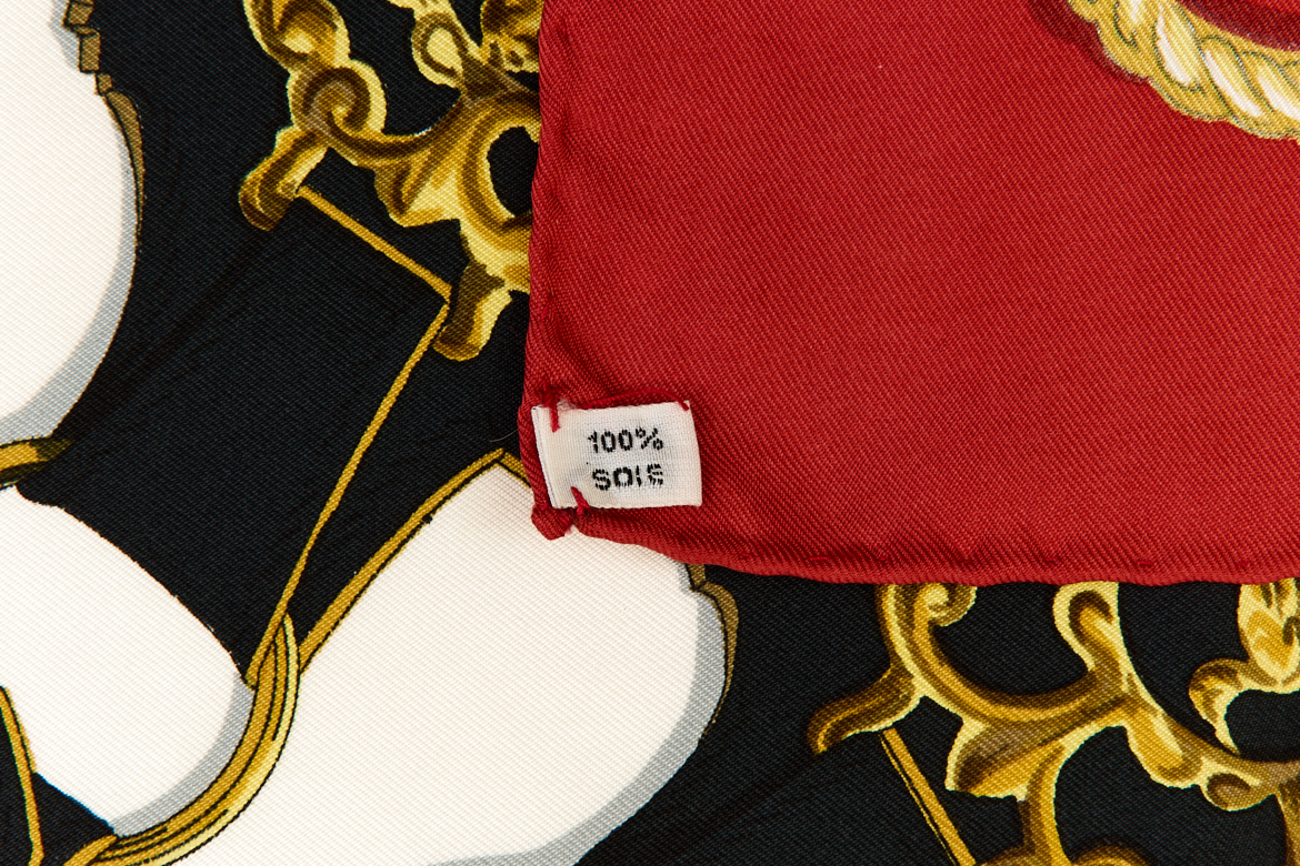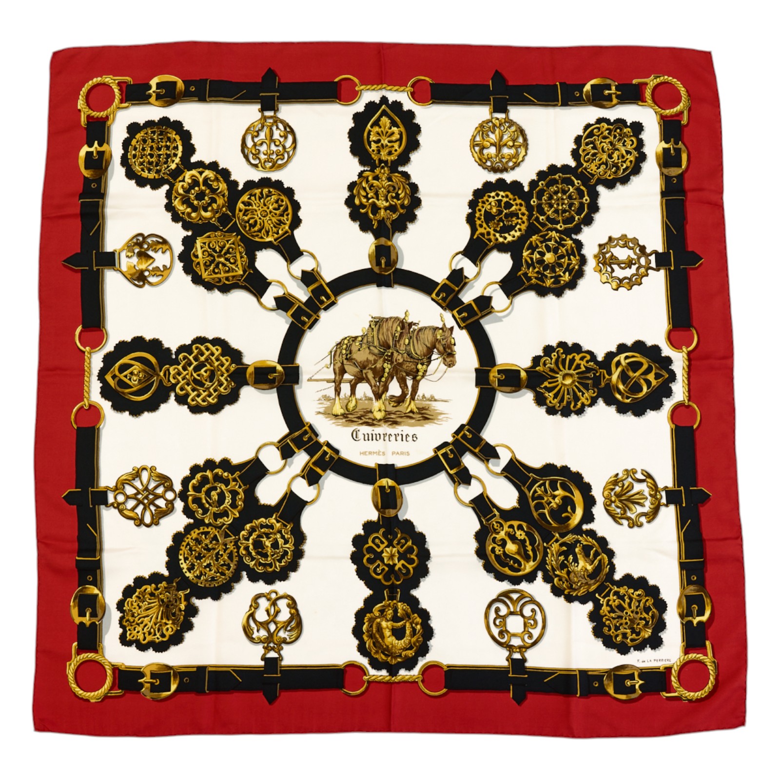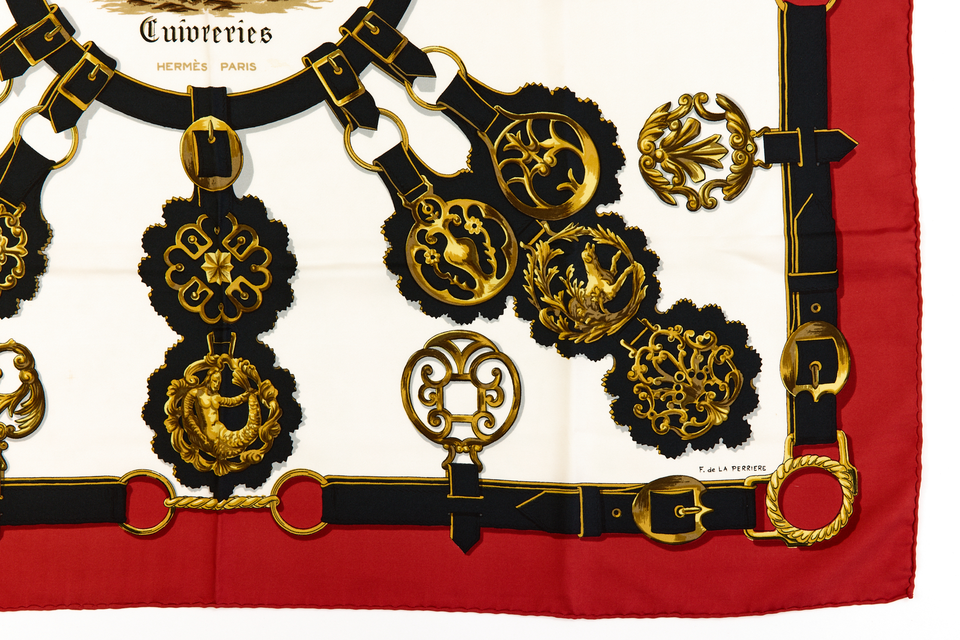 Hermes Silk Scarf Carre 90 “Cuivreries” Red Silk Scarf Brand : HERMESDesign by Franoise De La Perriere Issued 1963Item : ScarfSize : 88.5cm * 88.5cmMaterial : 100% SilkCondition Score: B+*For reference. The condition shown in the image takes precedence.*Please see the last two photos to see if the tag is still attached