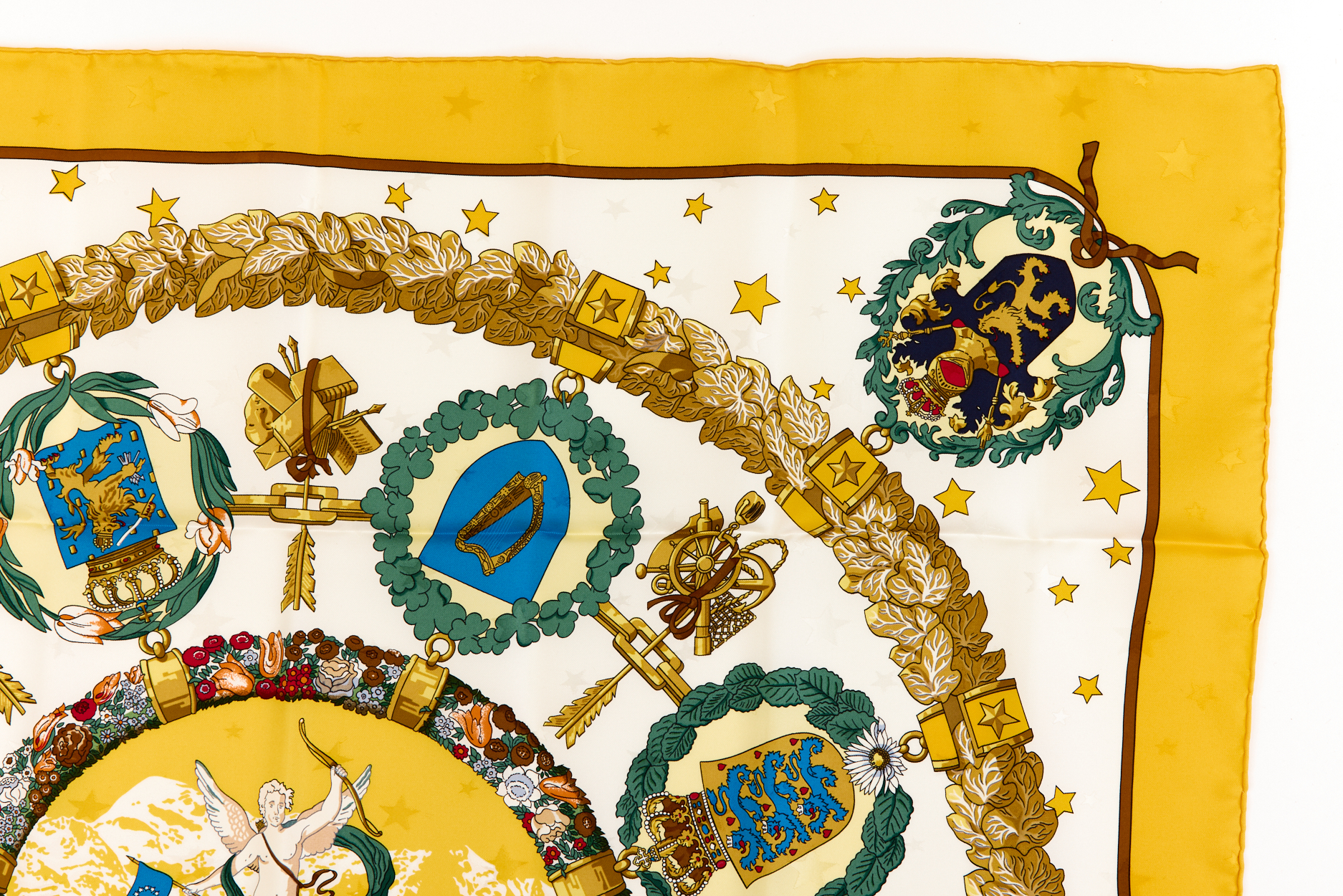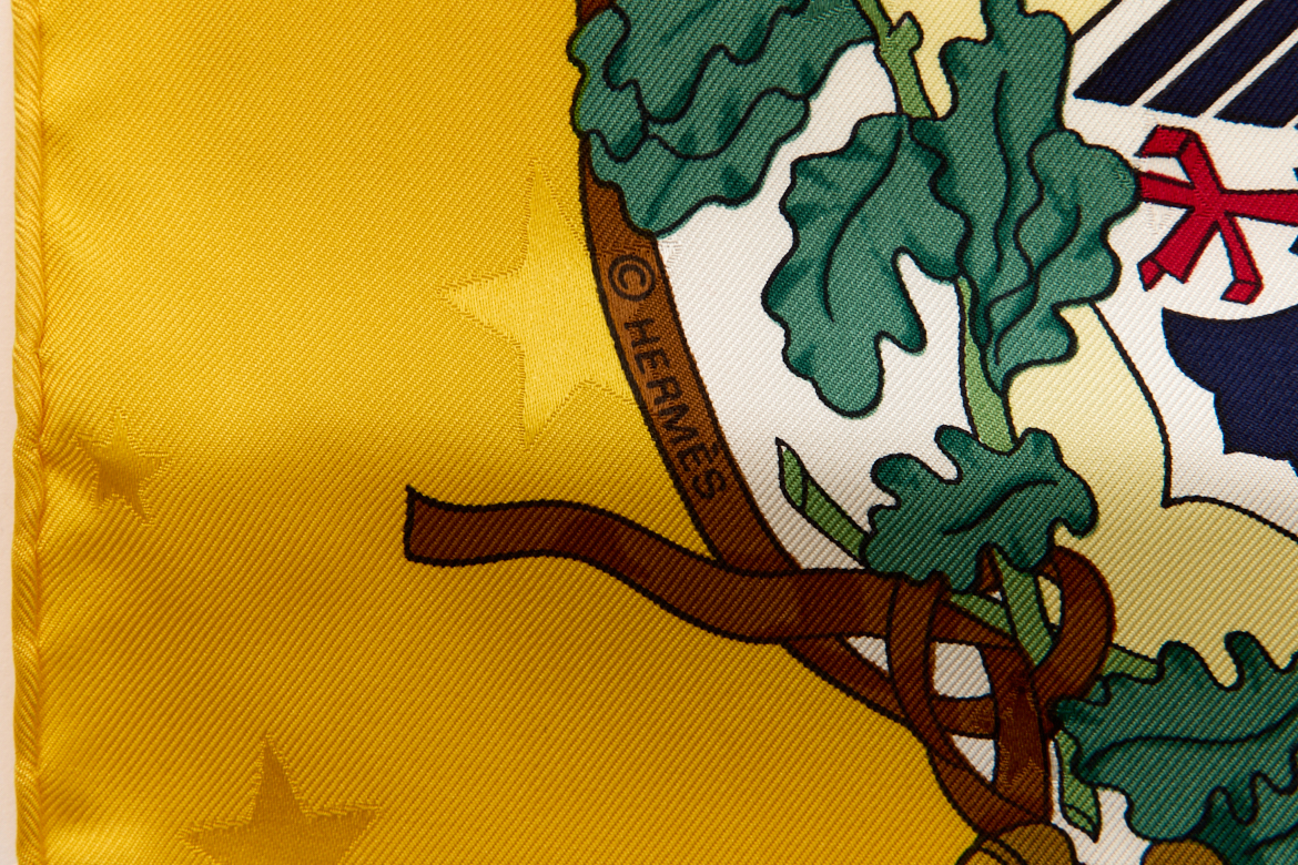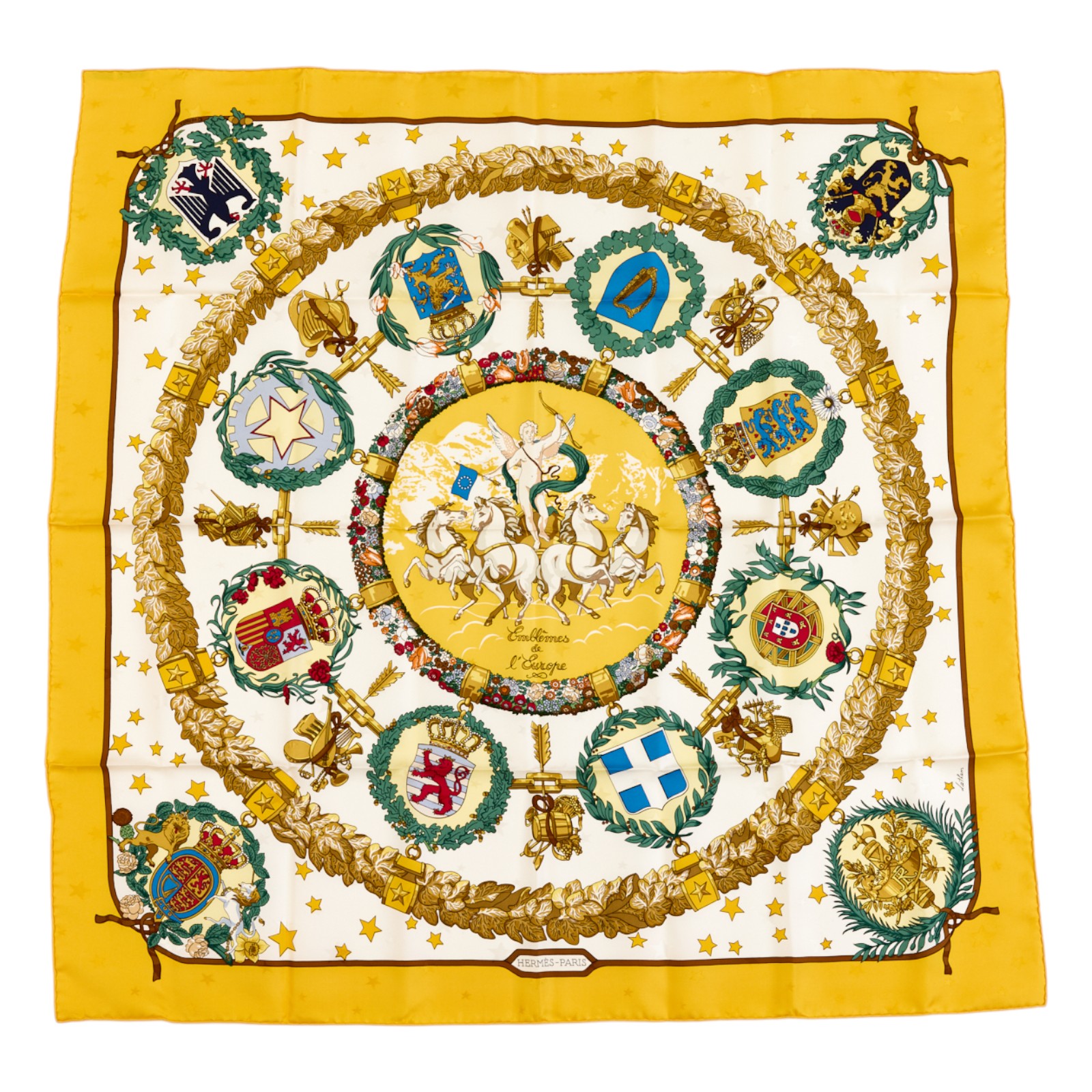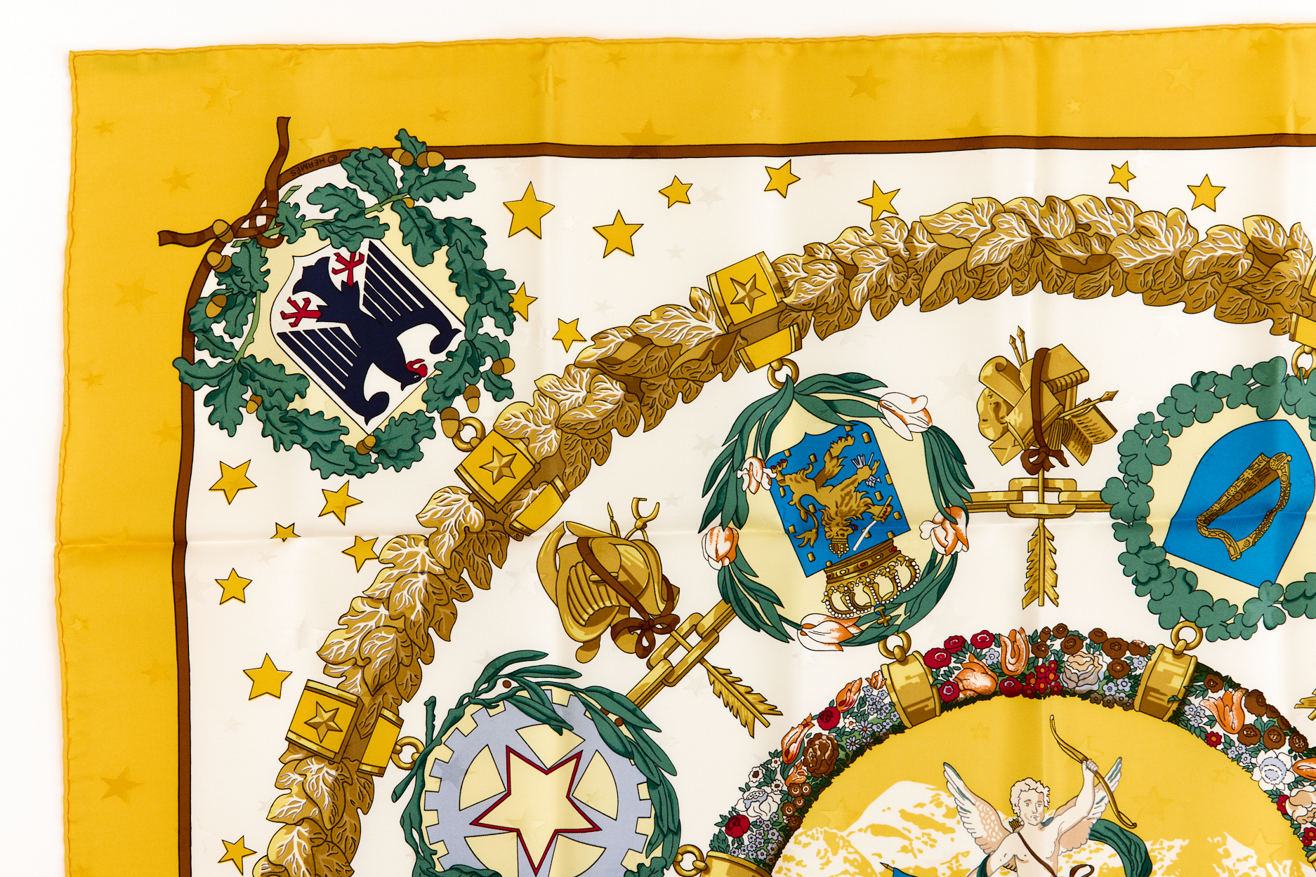 Hermes Silk Scarf Carre 90 “Emblemes de l’Europe” Yellow Silk Scarf
