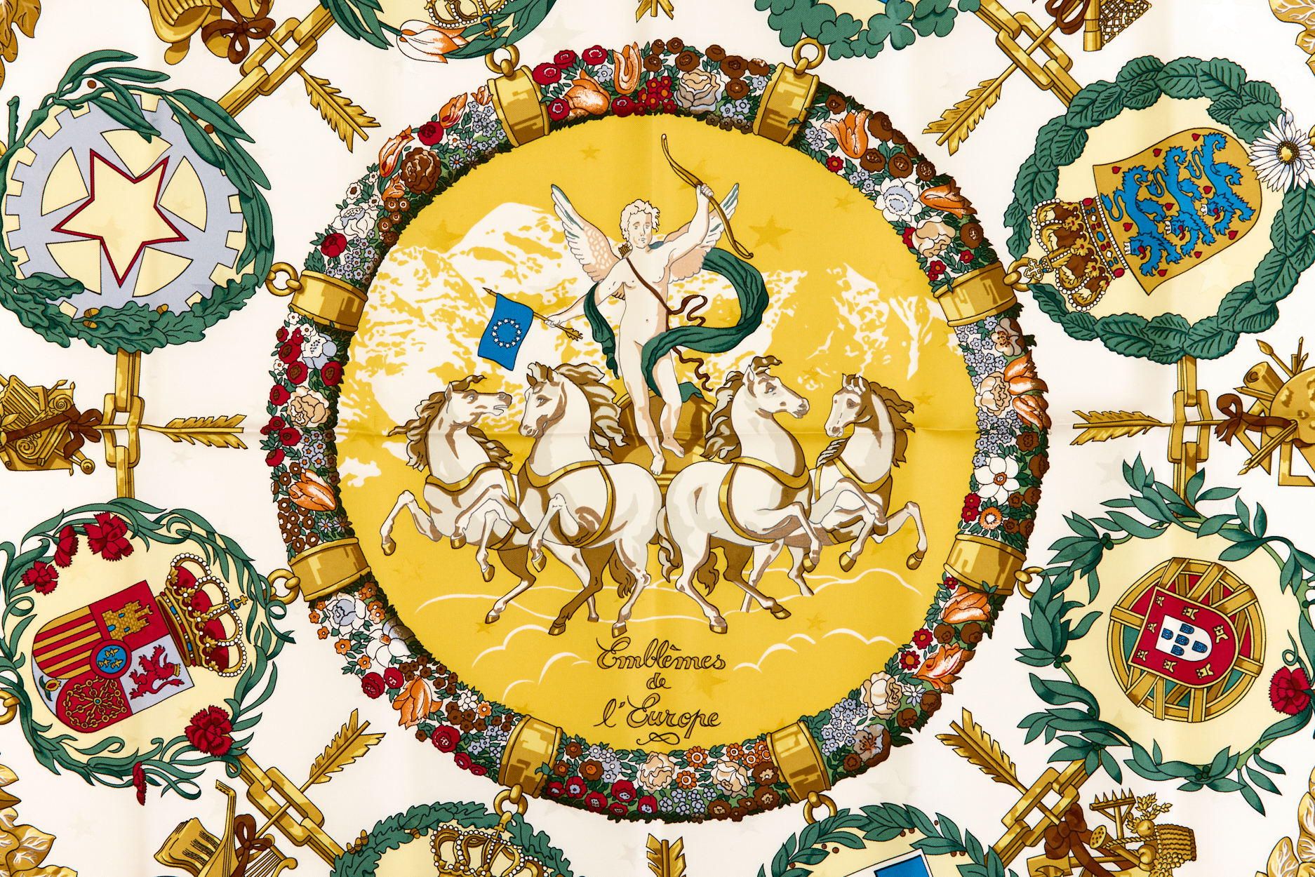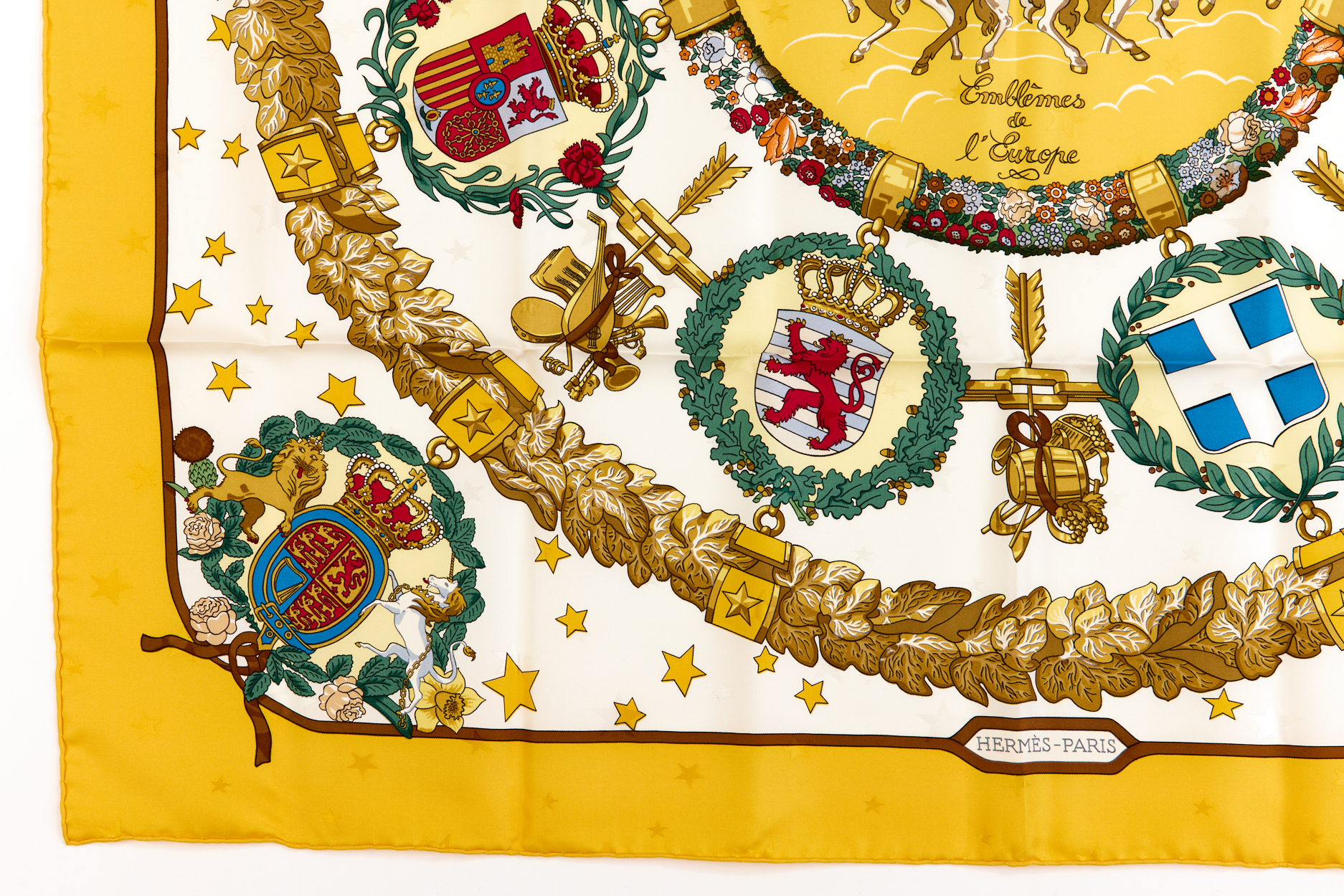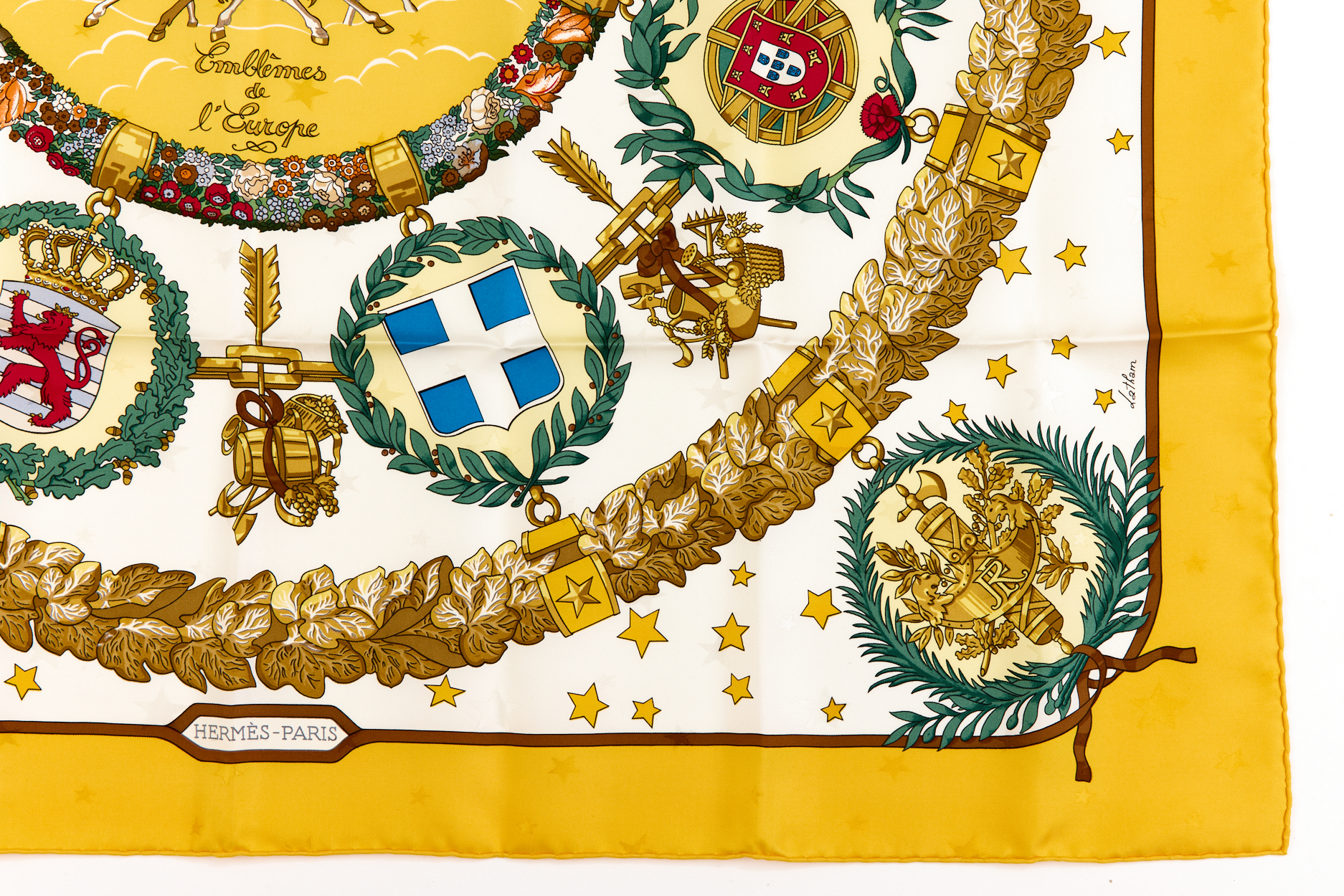 Hermes Silk Scarf Carre 90 “Emblemes de l’Europe” Yellow Silk Scarf