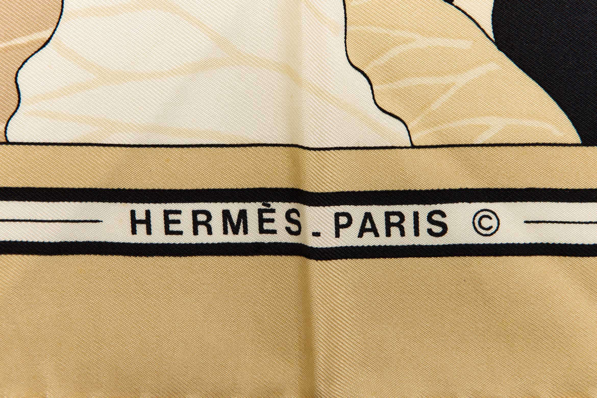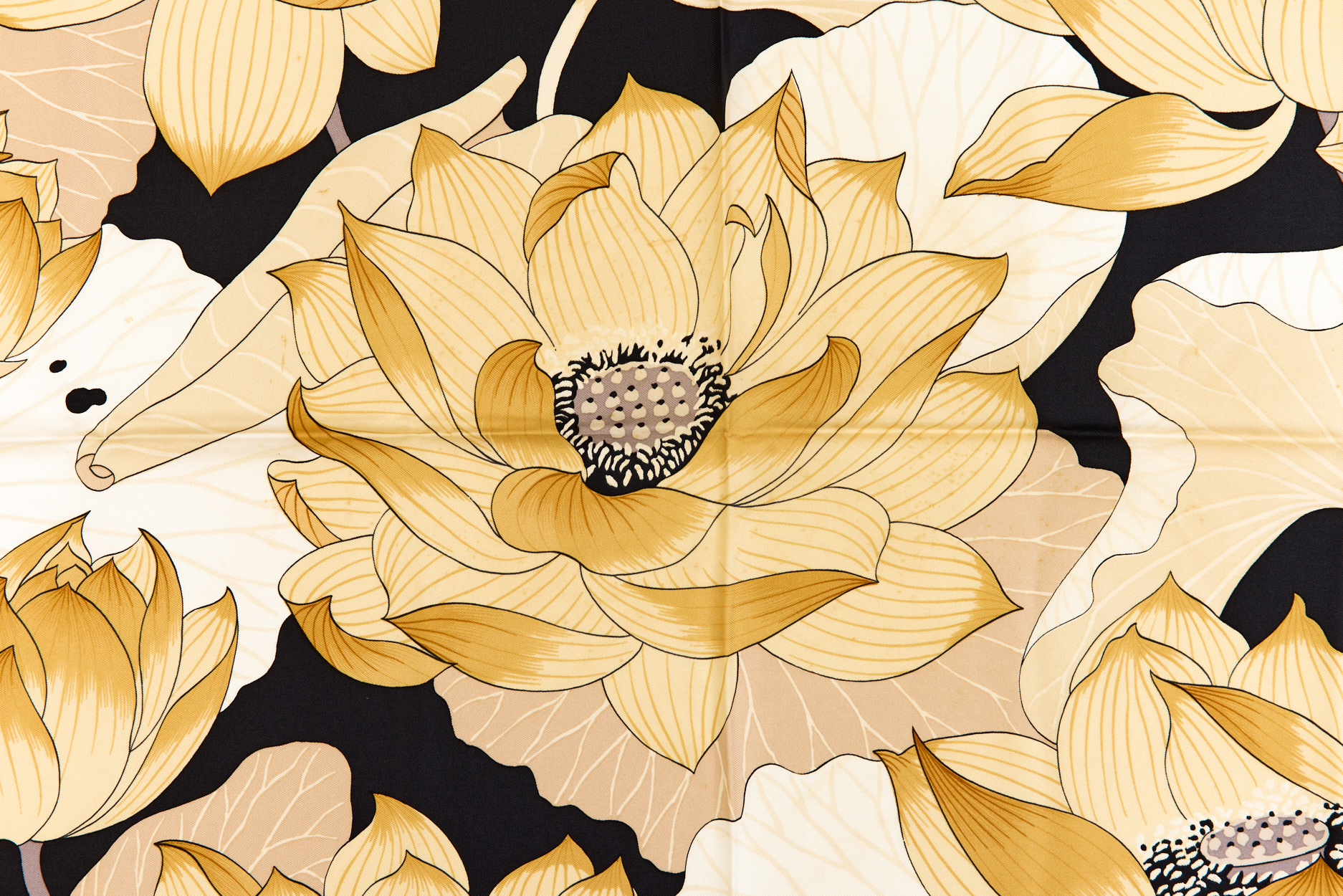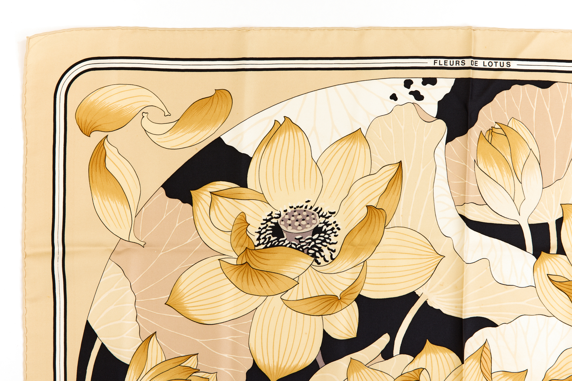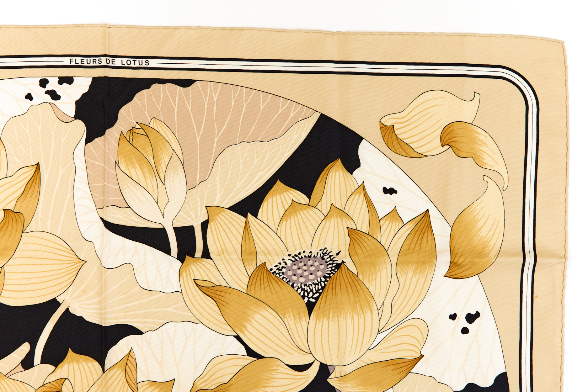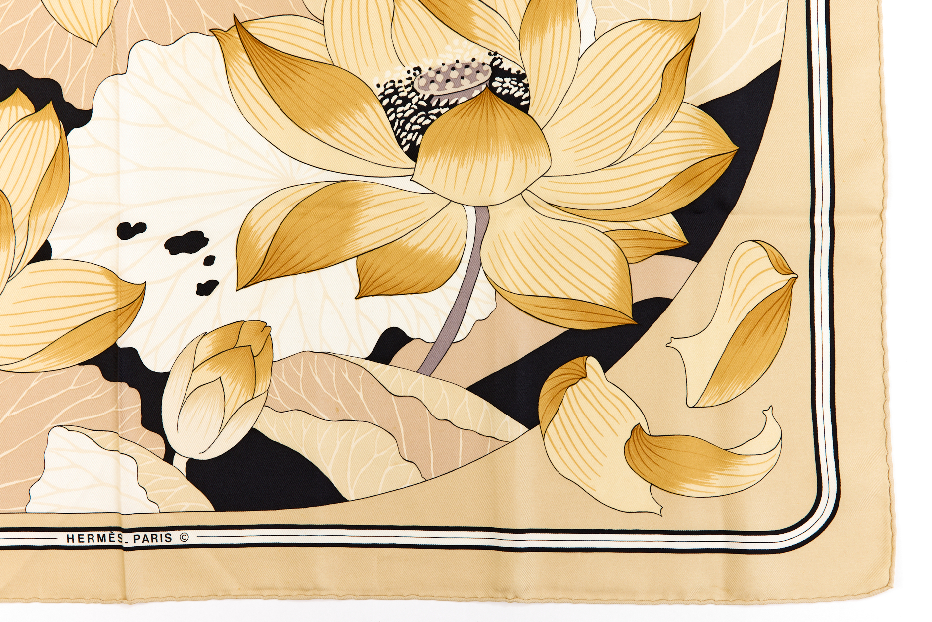 Hermes Silk Scarf Carre 90 “FLEURS DE LOTUS” Beige Silk Scarf