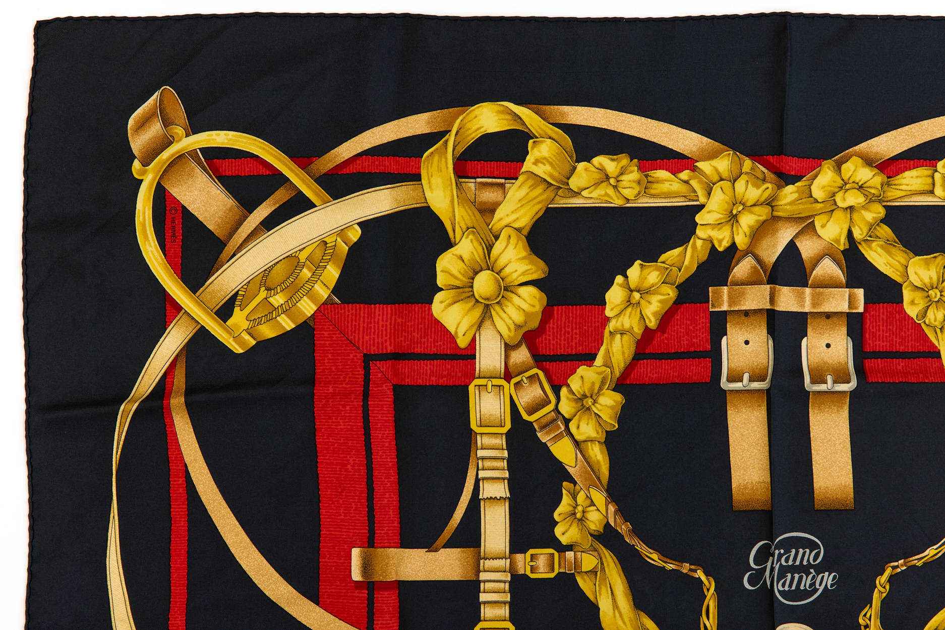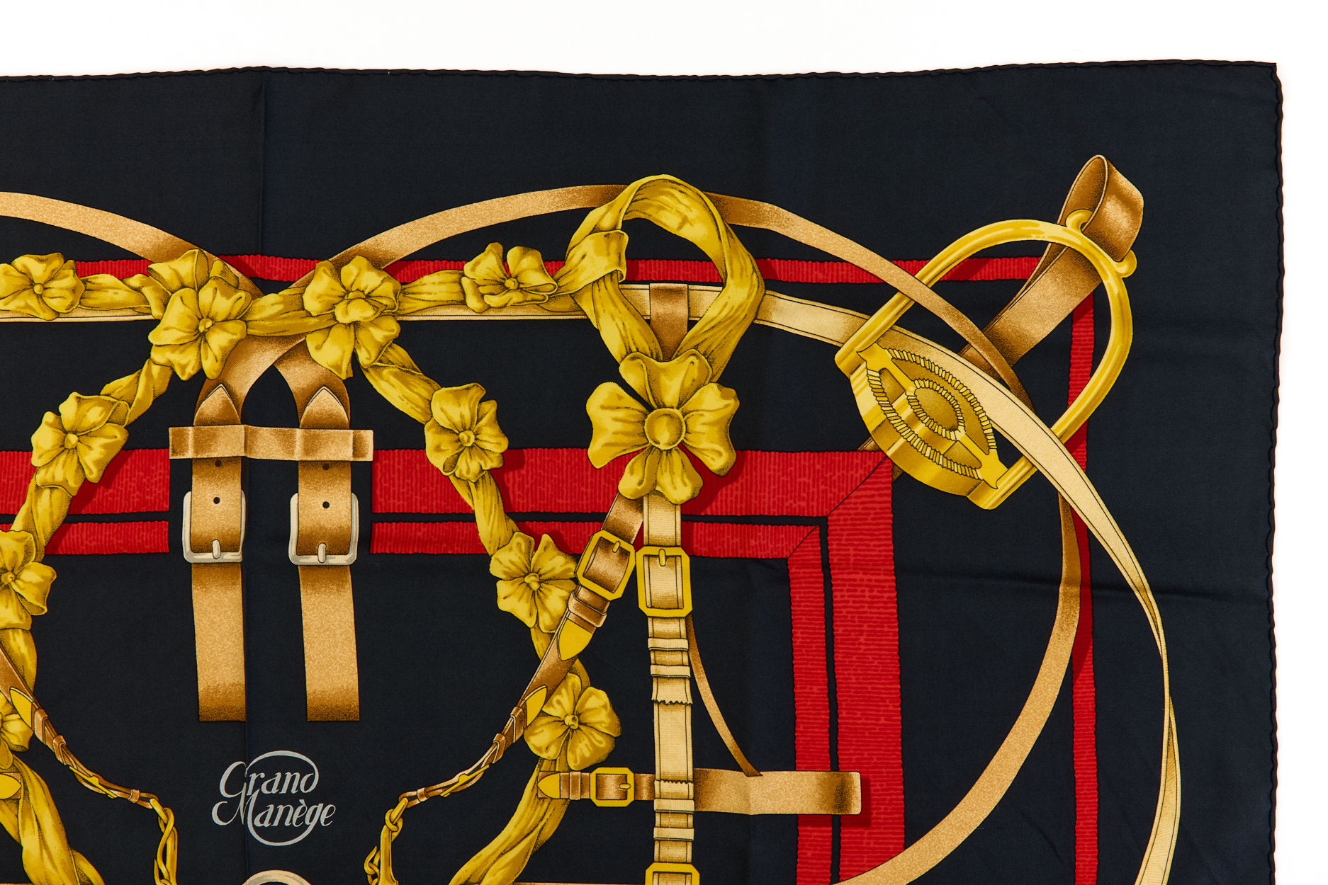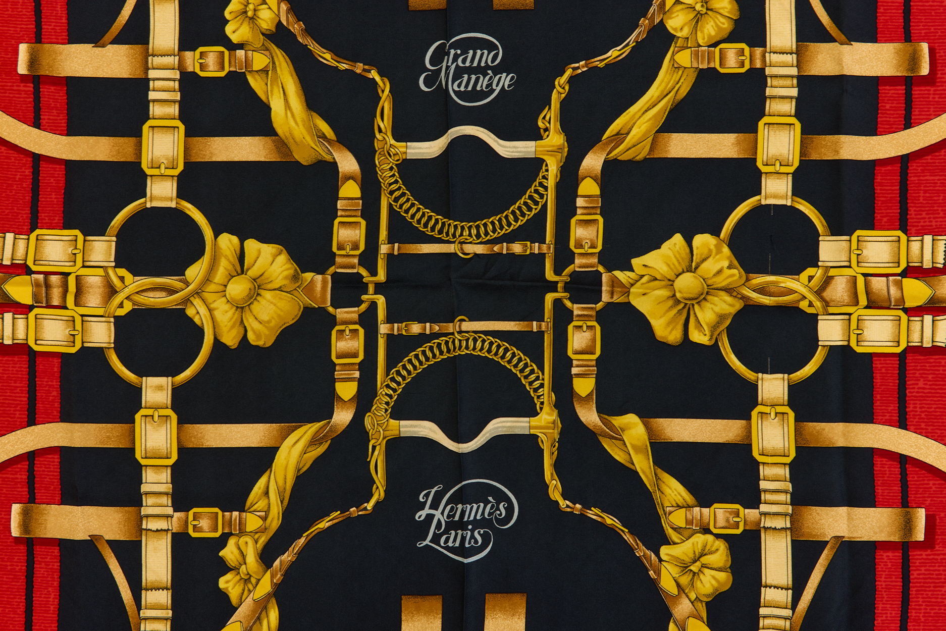 Hermes Silk Scarf Carre 90 “Grand Manege” Black Silk Scarf Brand : HERMESDesign by Henri d’Origny Issued 1990Item : ScarfSize : 88.5cm * 88.5cmMaterial : 100% SilkCondition Score: B+*For reference. The condition shown in the image takes precedence.*Please see the last two photos to see if the tag is still attached