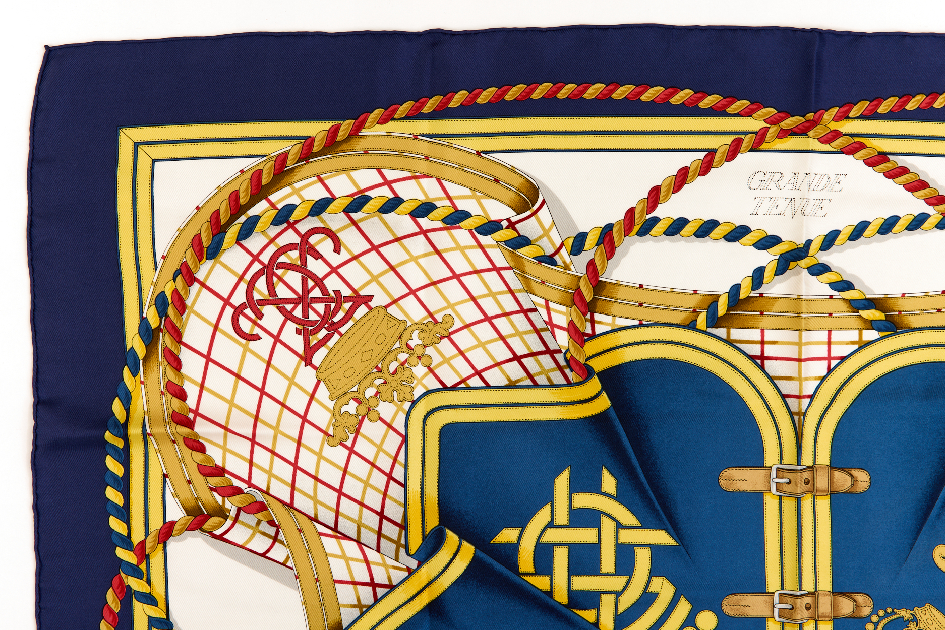 Hermes Silk Scarf Carre 90 “GRANDE TENUE” Blue Silk Scarf Brand : HERMESDesign by Henri D’origny Issued 1993Item : ScarfSize : 88.5cm * 88.5cmMaterial : 100% SilkCondition Score: B+*For reference. The condition shown in the image takes precedence.*Please see the last two photos to see if the tag is still attached