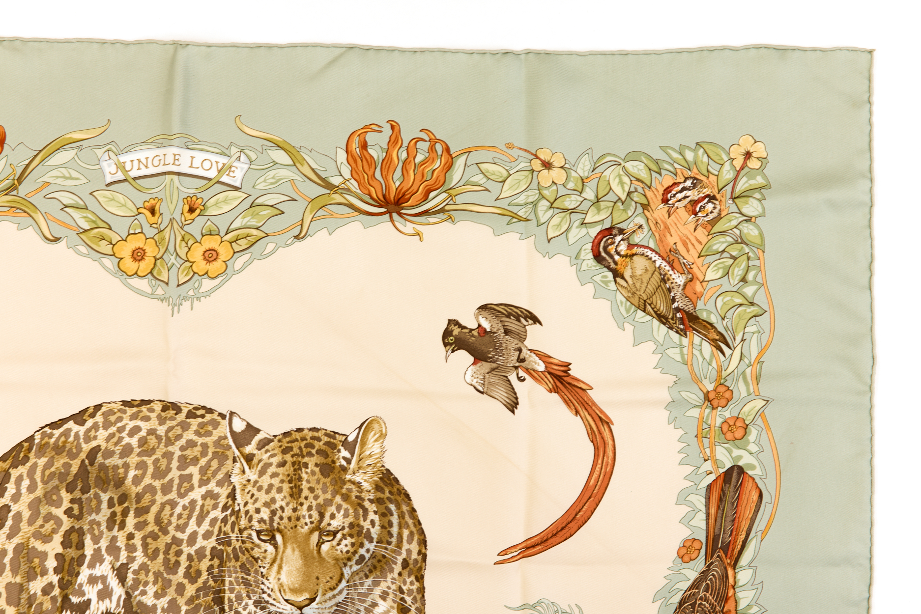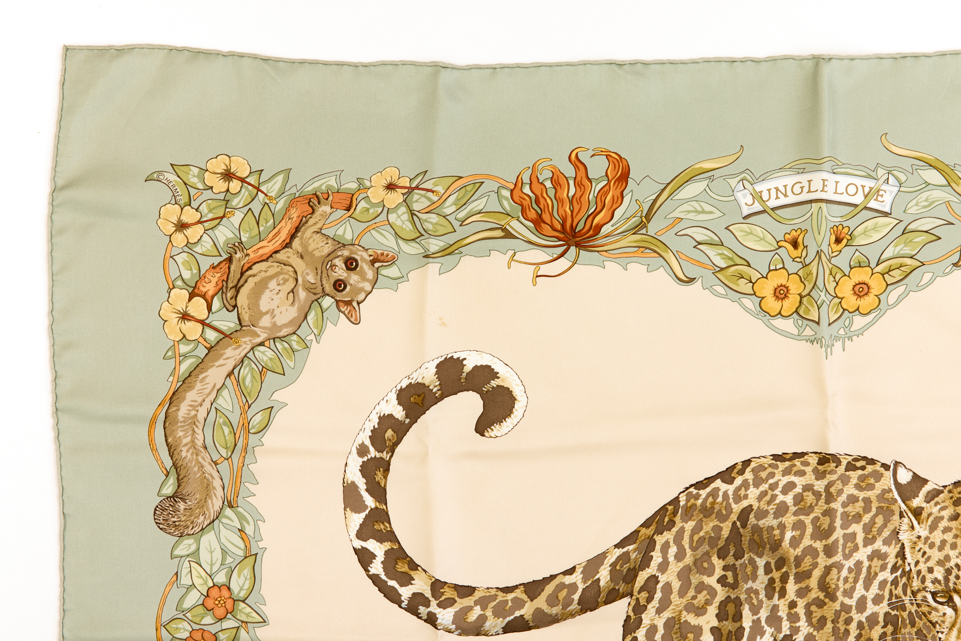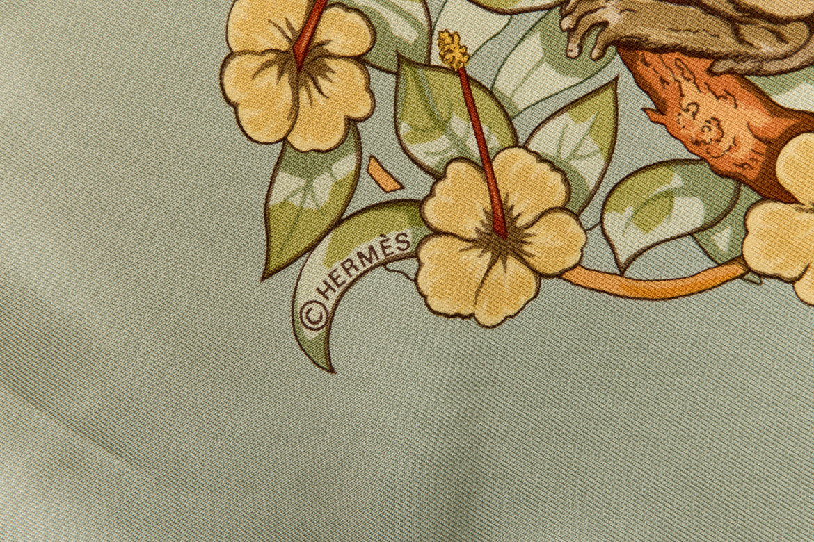 Hermes Silk Scarf Carre 90 “JUNGLE LOVE” Green Silk Scarf
