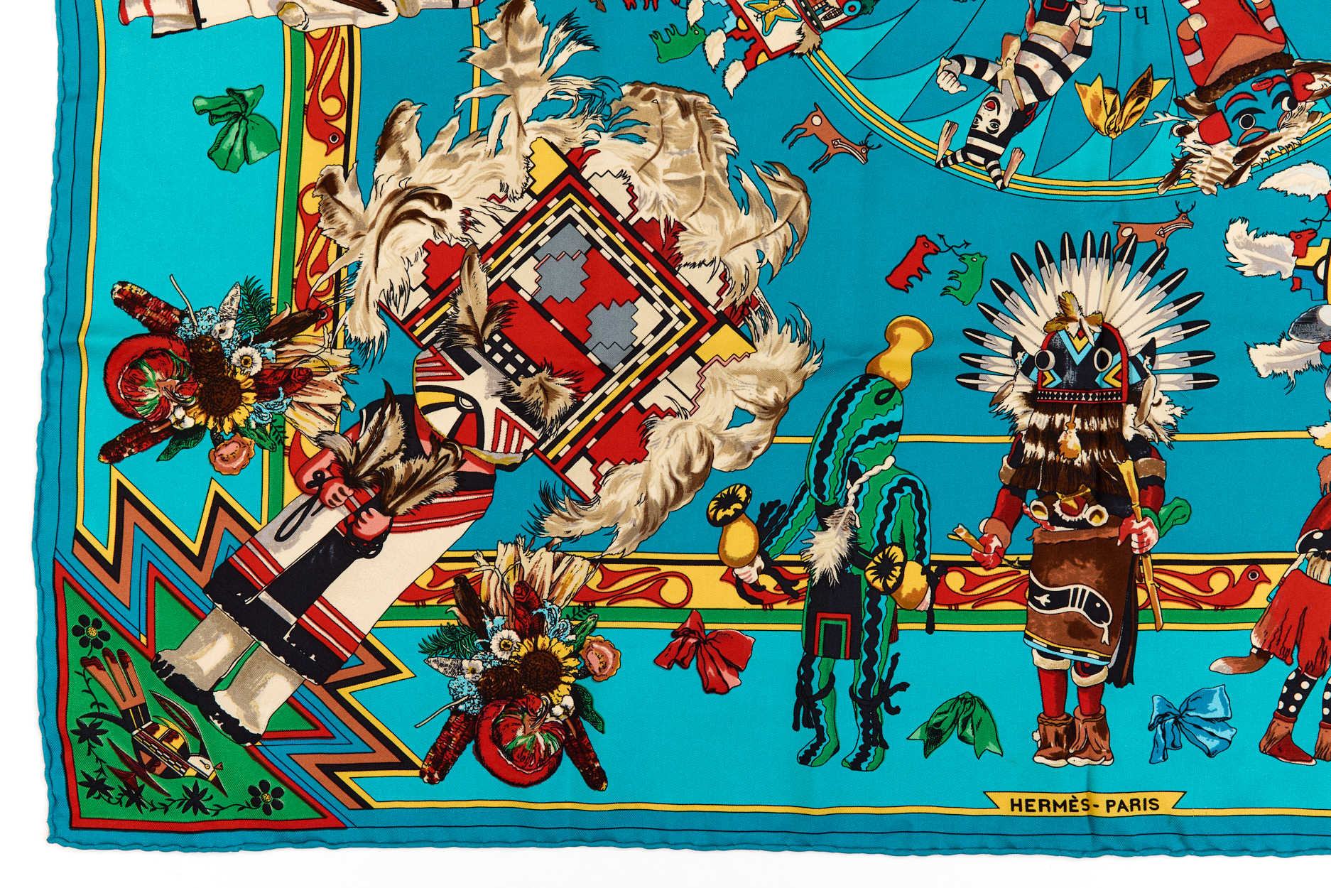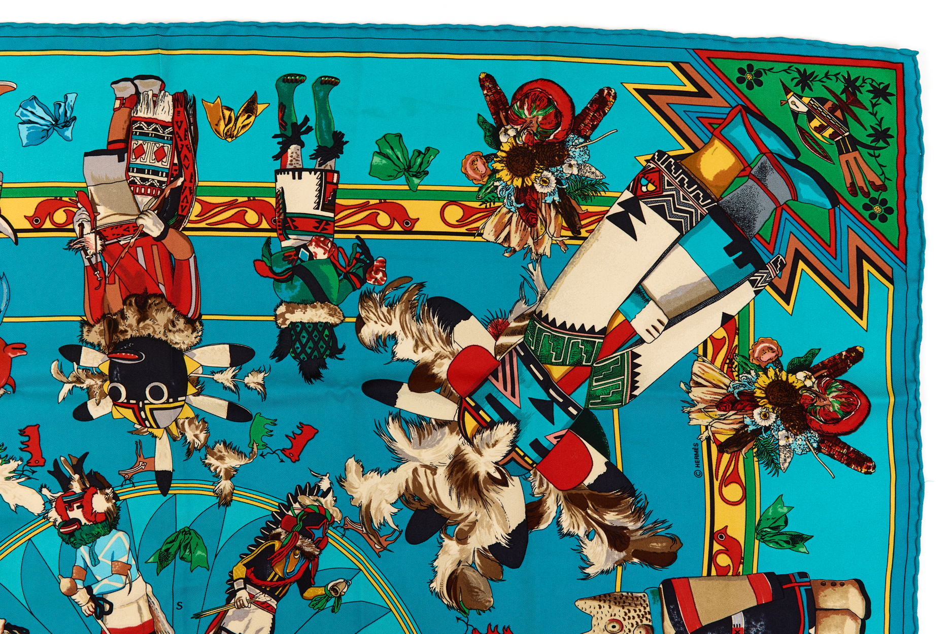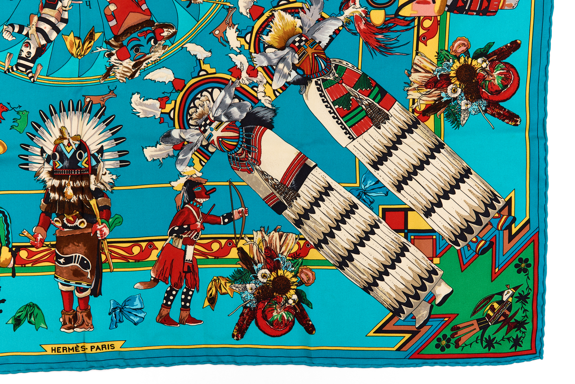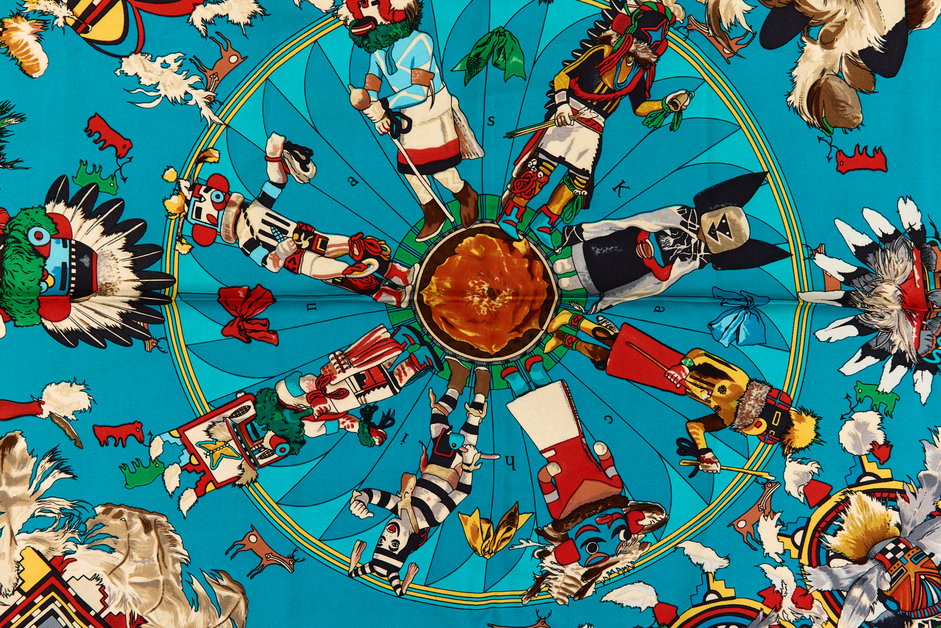 Hermes Silk Scarf Carre 90 “Kachinas” Blue Silk Scarf