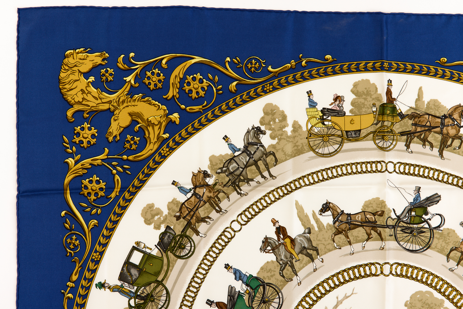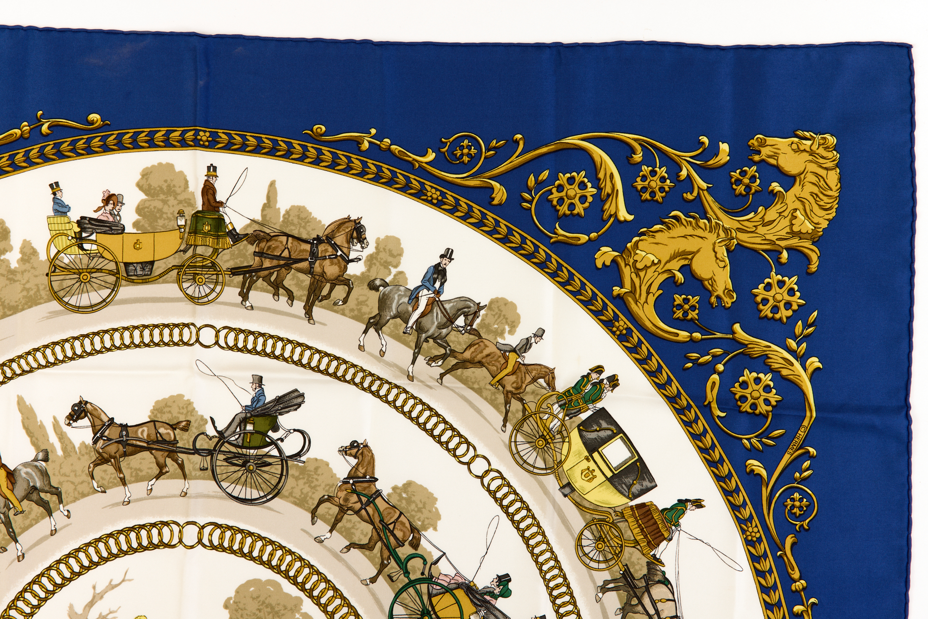 Hermes Silk Scarf Carre 90 “LA PROMENADE DE LONGCHAMPS” Blue Silk Scarf
