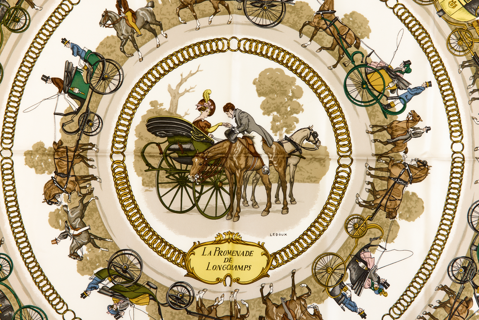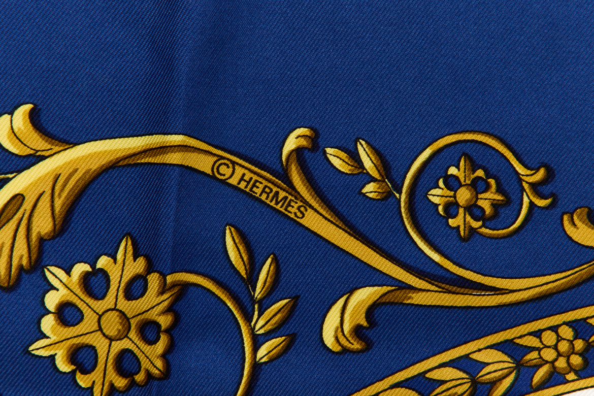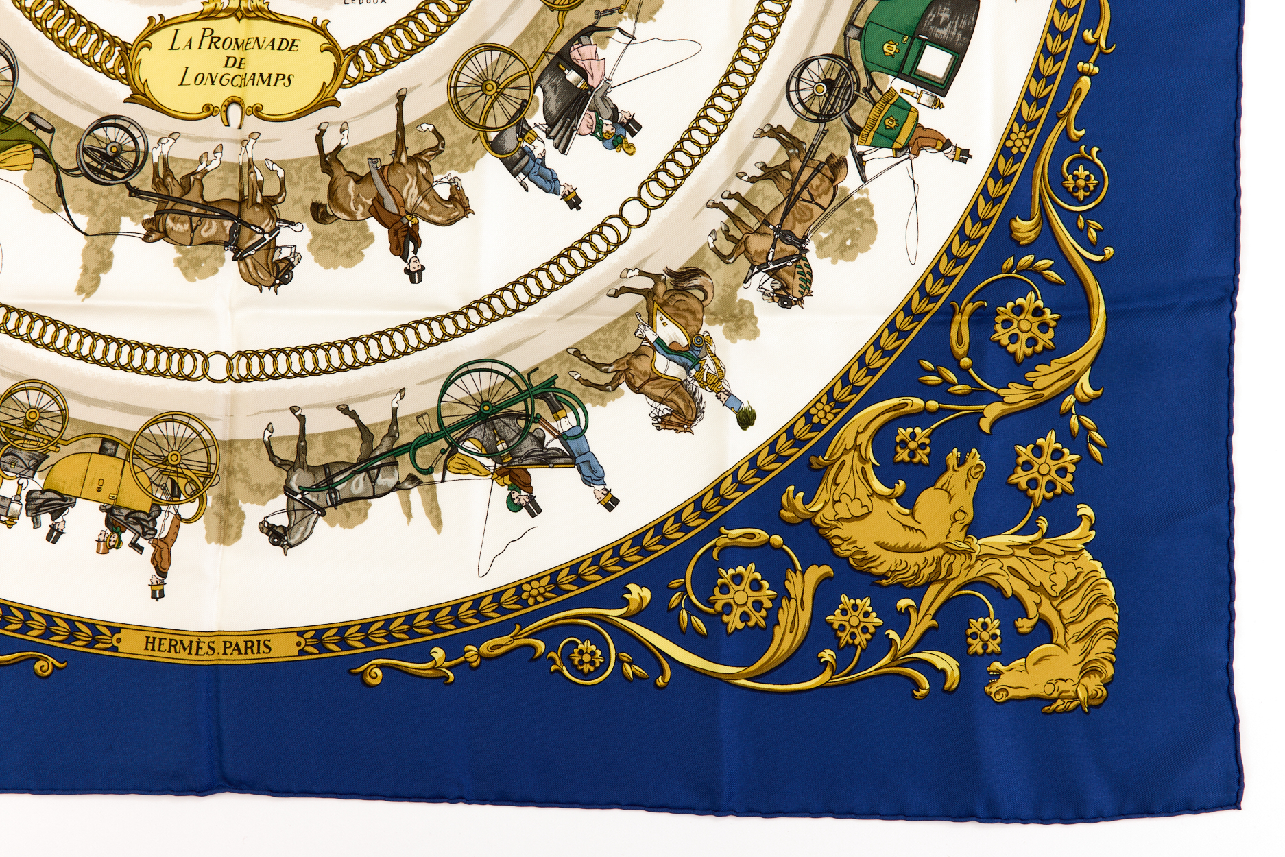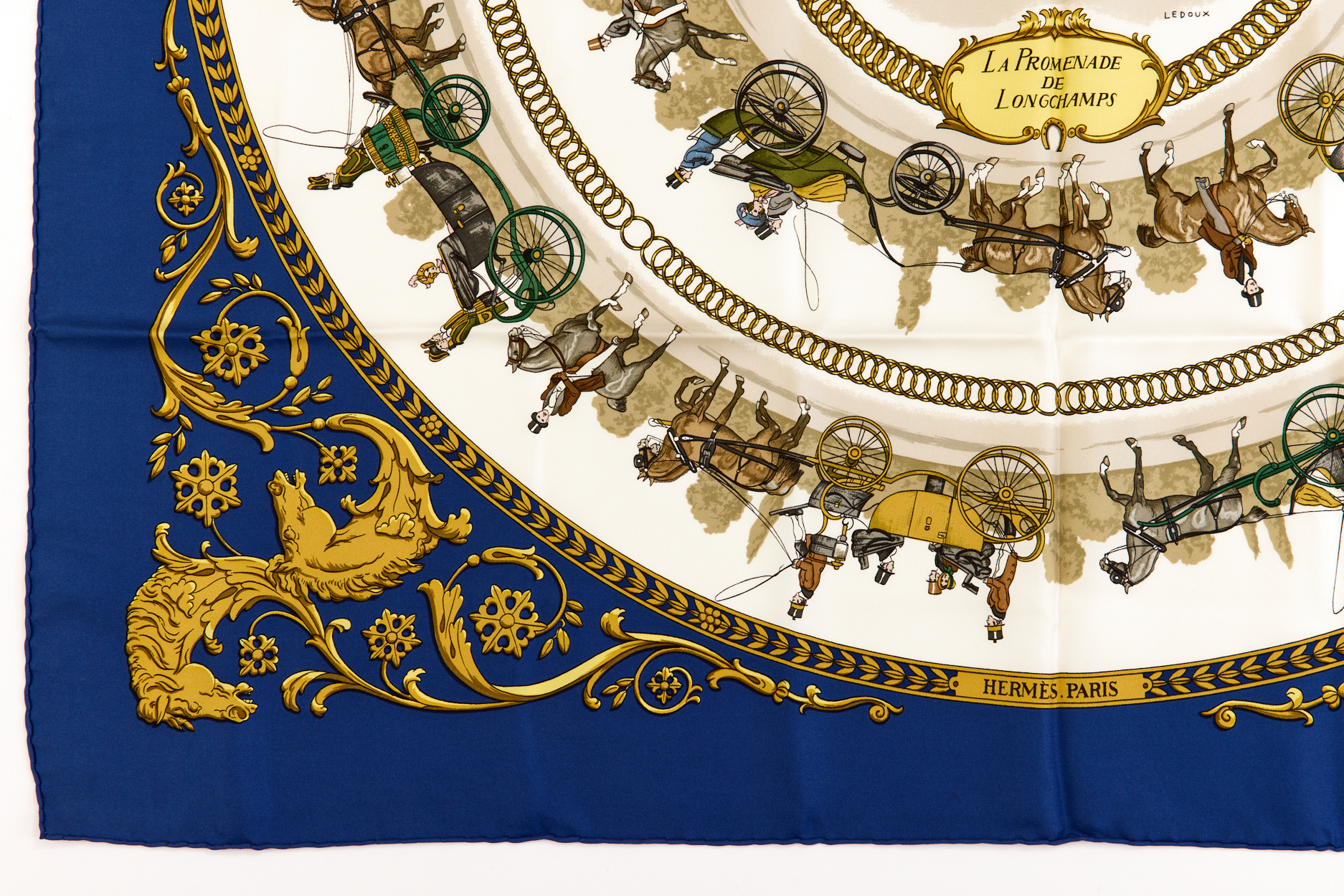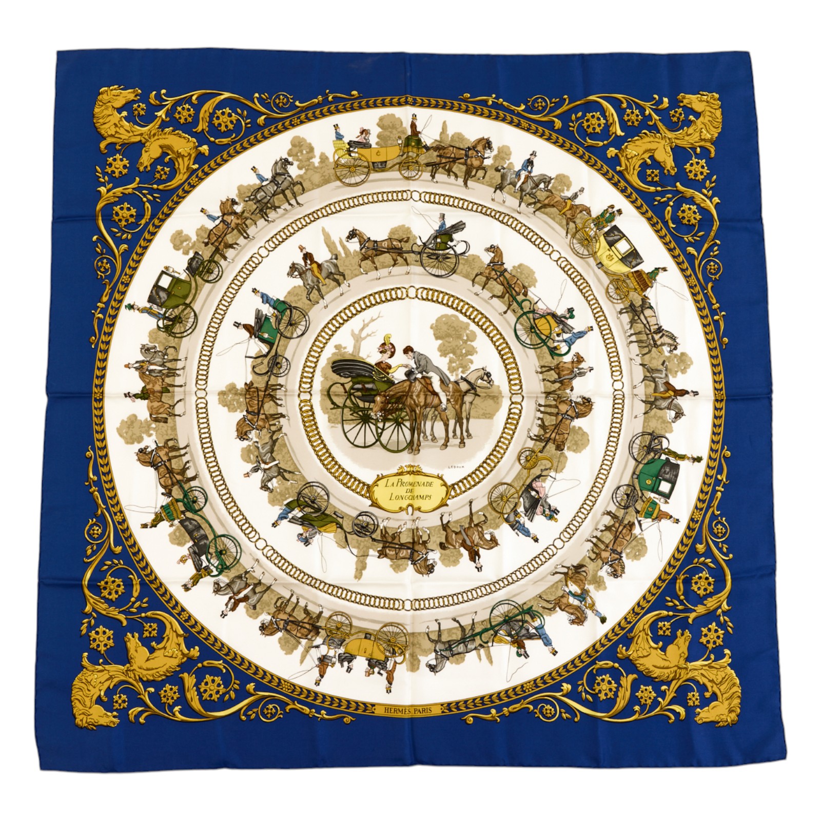 Hermes Silk Scarf Carre 90 “LA PROMENADE DE LONGCHAMPS” Blue Silk Scarf Brand : HERMESDesign by Philippe Ledoux Issued 1965Item : ScarfSize : 88.5cm * 88.5cmMaterial : 100% SilkCondition Score: B+*For reference. The condition shown in the image takes precedence.*Please see the last two photos to see if the tag is still attached
