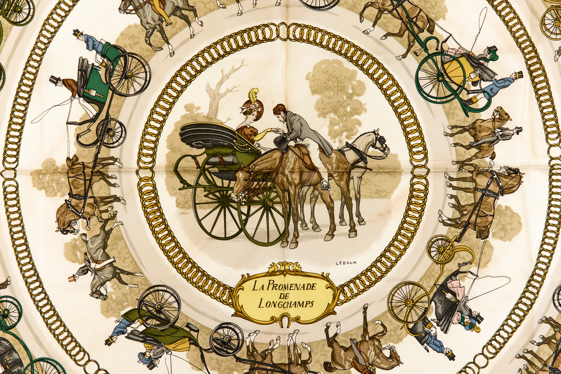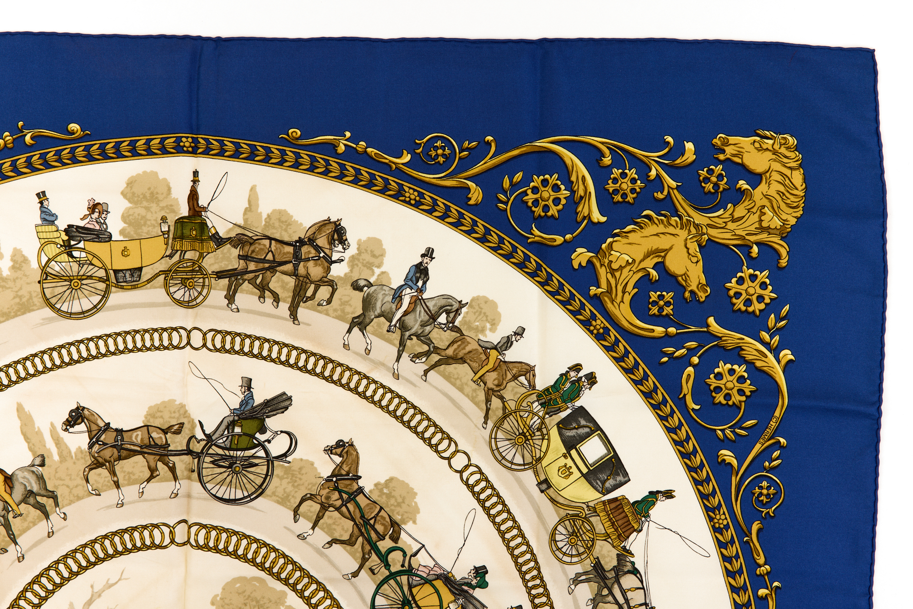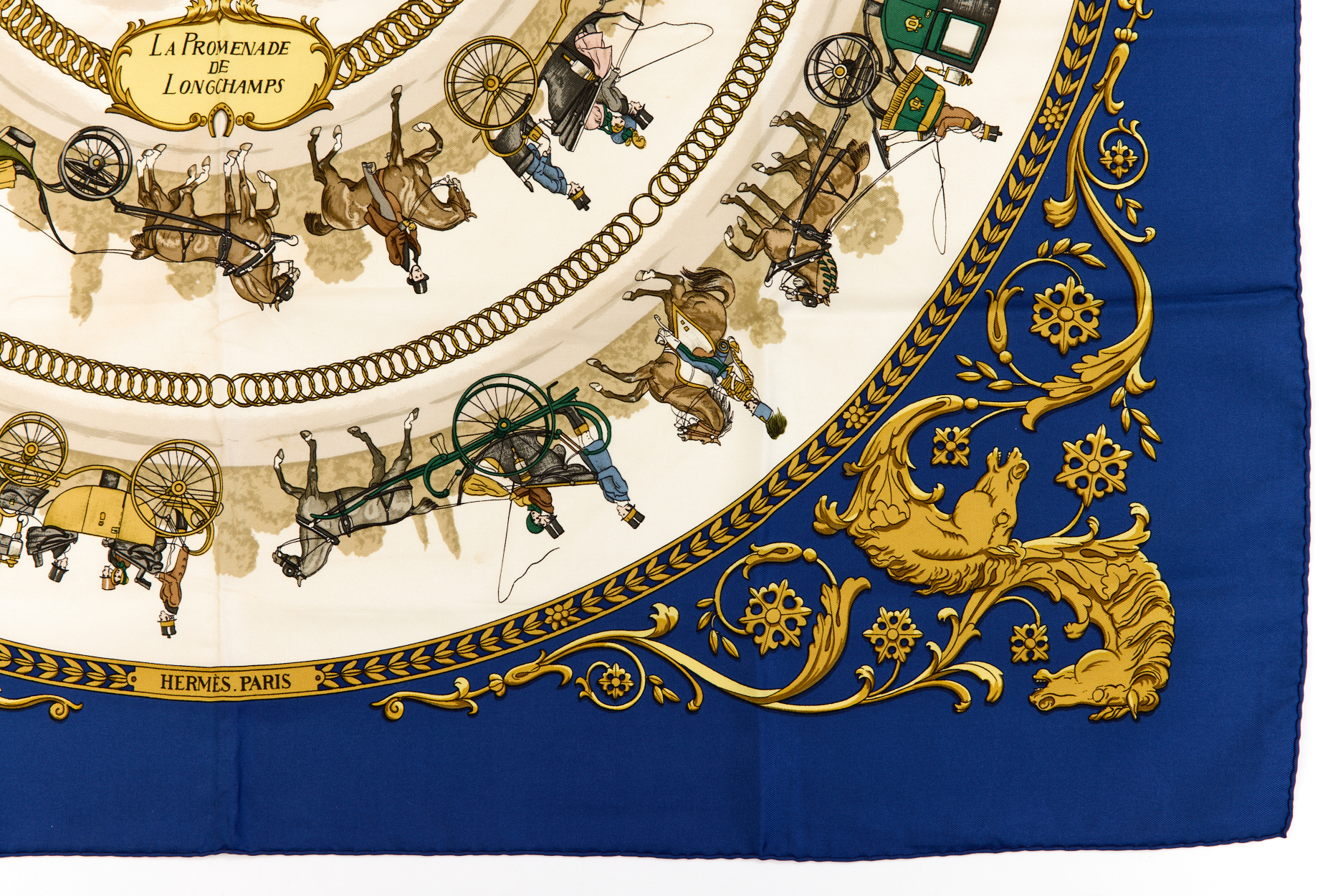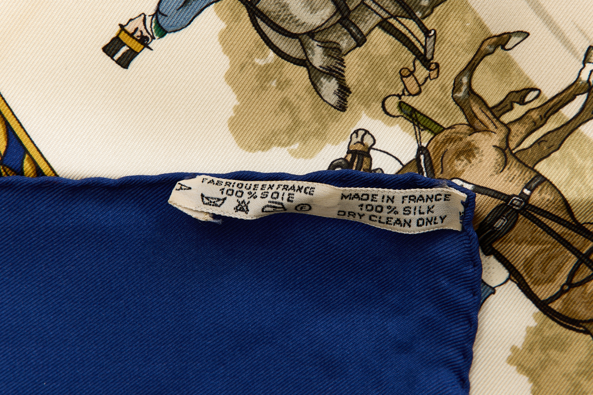 Hermes Silk Scarf Carre 90 “LA PROMENADE DE LONGCHAMPS” Blue Silk Scarf Brand : HERMESDesign by Philippe Ledoux Issued 1965Item : ScarfSize : 88.5cm * 88.5cmMaterial : 100% SilkCondition Score: B*For reference. The condition shown in the image takes precedence.*Please see the last two photos to see if the tag is still attached