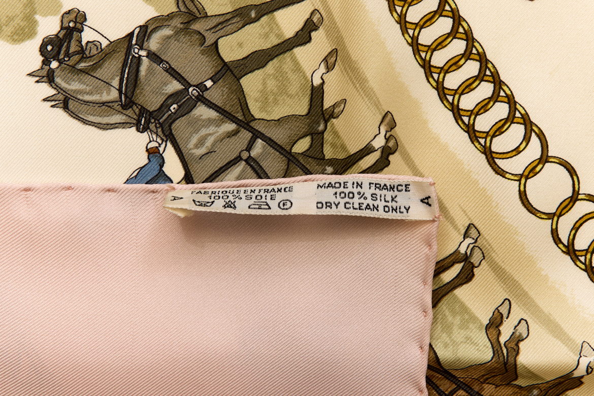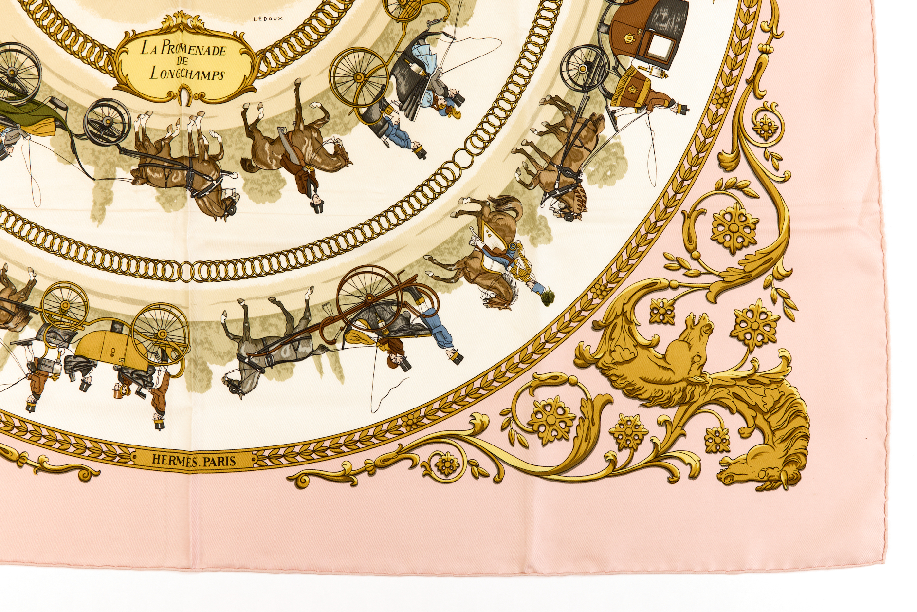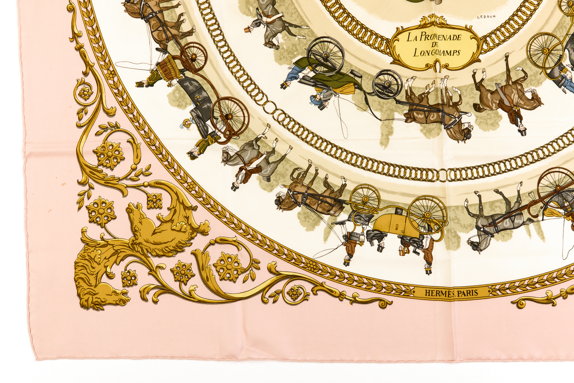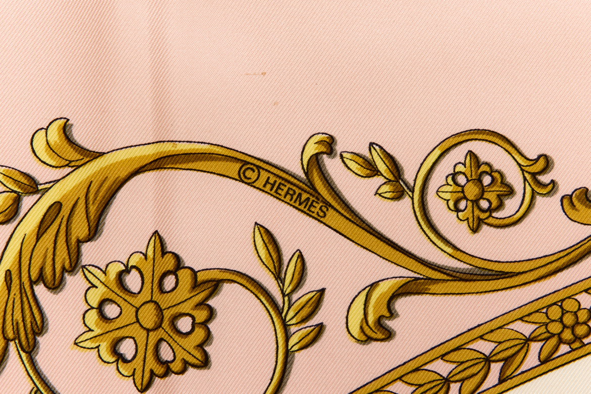 Hermes Silk Scarf Carre 90 “LA PROMENADE DE LONGCHAMPS” Pink Silk Scarf Brand : HERMESDesign by Philippe Ledoux Issued 1965Item : ScarfSize : 88.5cm * 88.5cmMaterial : 100% SilkCondition Score: B*For reference. The condition shown in the image takes precedence.*Please see the last two photos to see if the tag is still attached