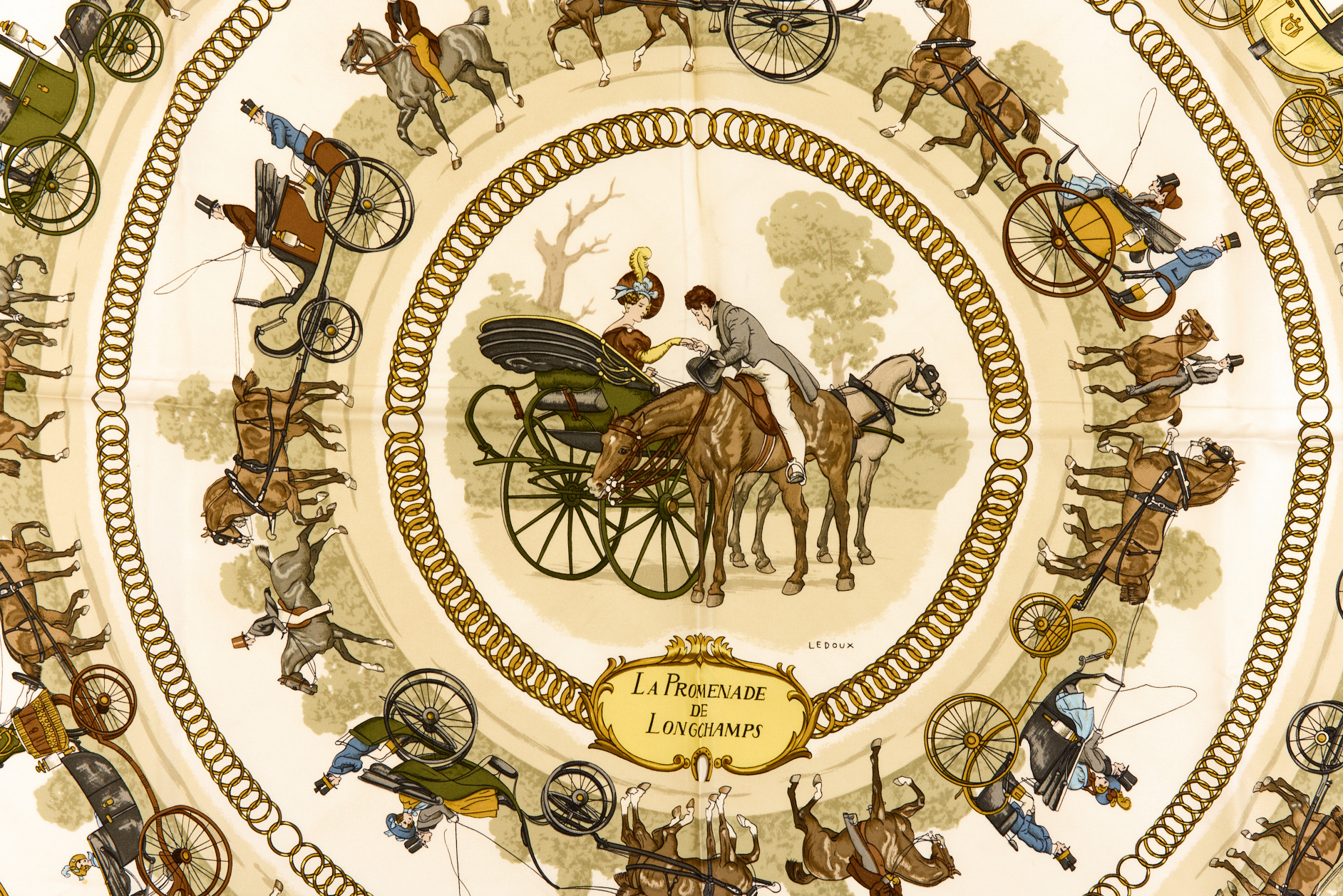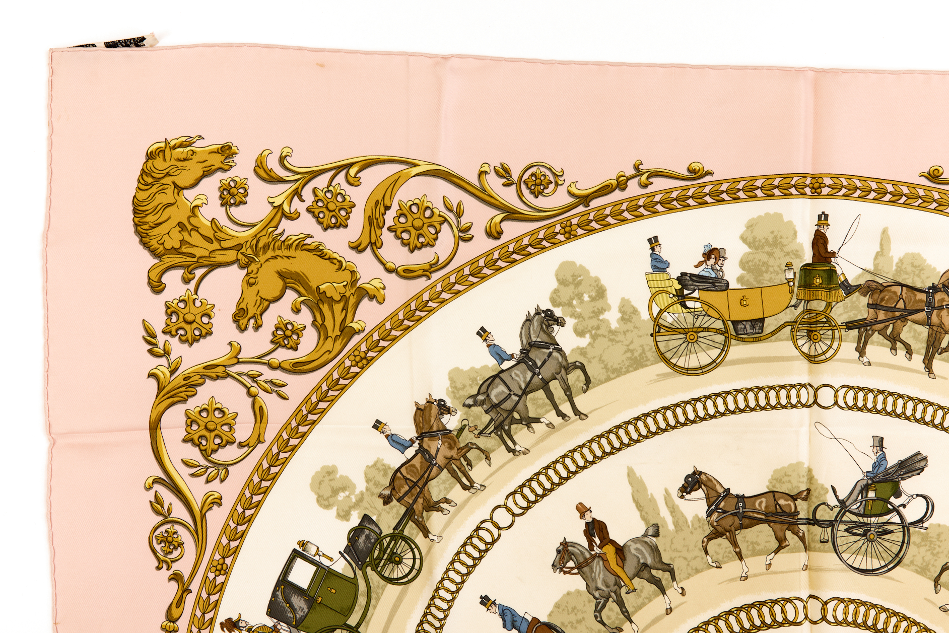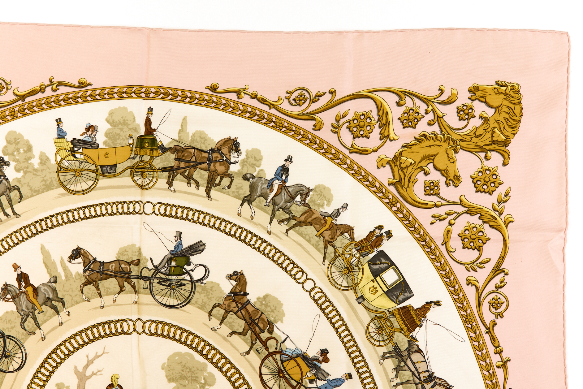 Hermes Silk Scarf Carre 90 “LA PROMENADE DE LONGCHAMPS” Pink Silk Scarf Brand : HERMESDesign by Philippe Ledoux Issued 1965Item : ScarfSize : 88.5cm * 88.5cmMaterial : 100% SilkCondition Score: B*For reference. The condition shown in the image takes precedence.*Please see the last two photos to see if the tag is still attached