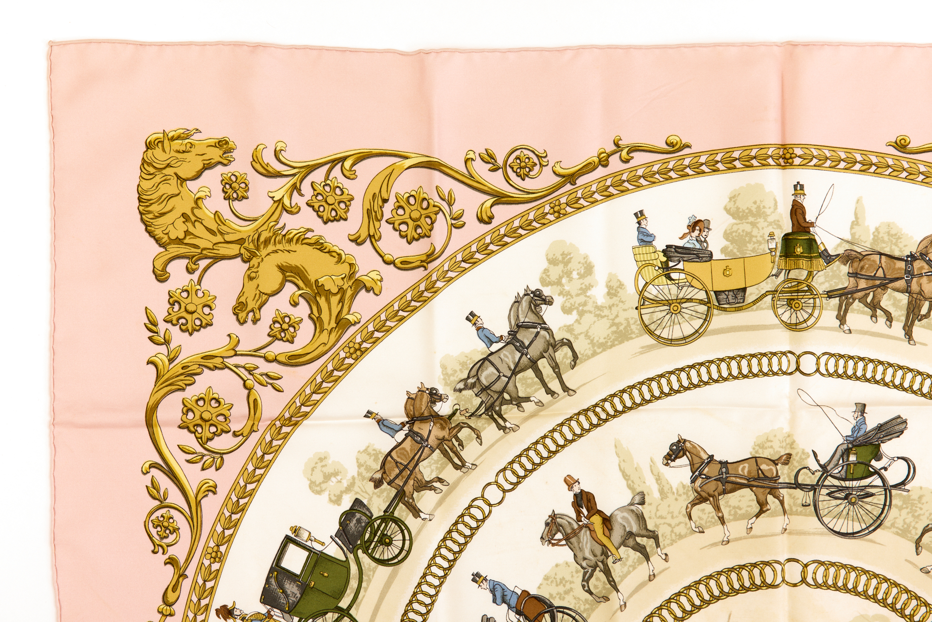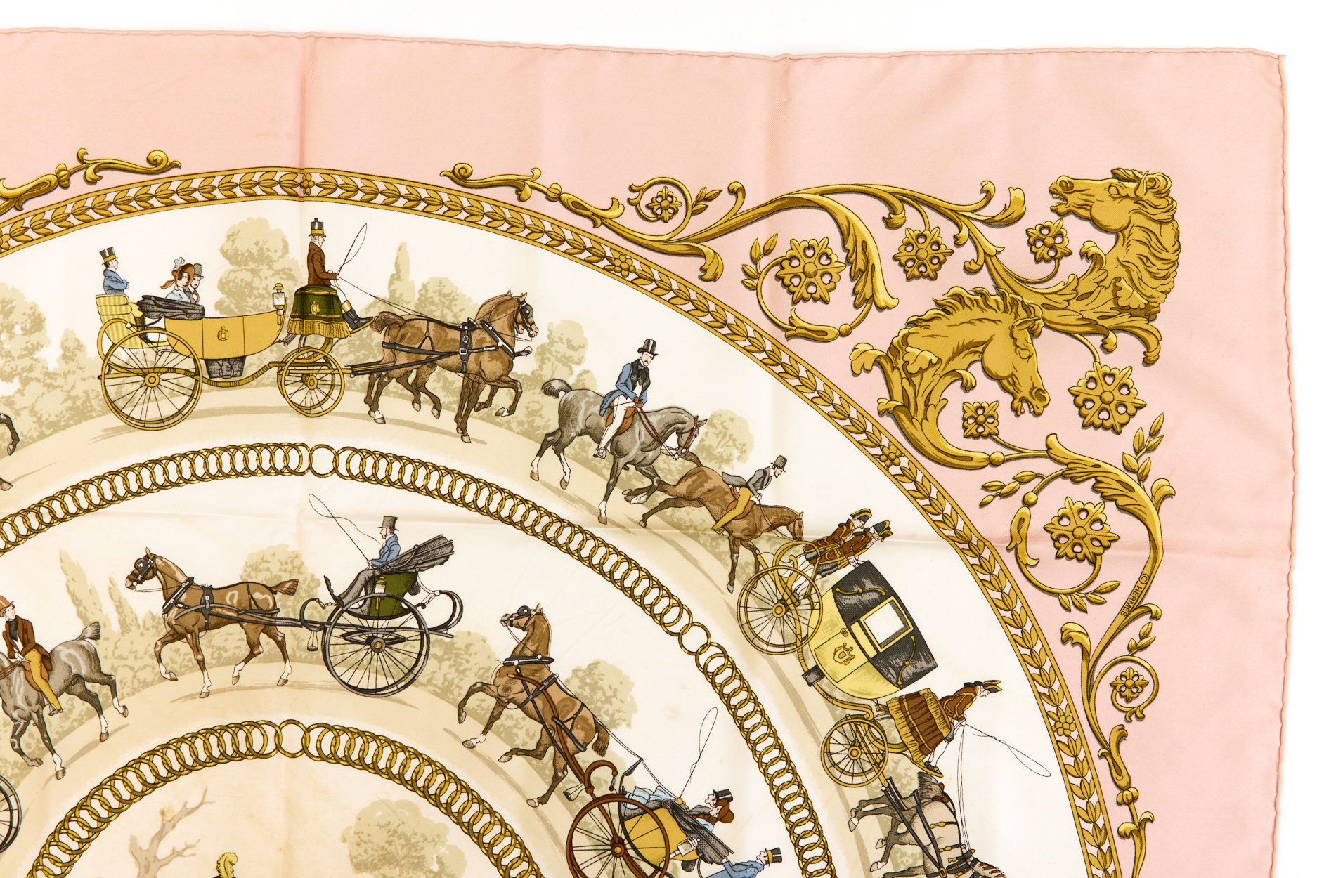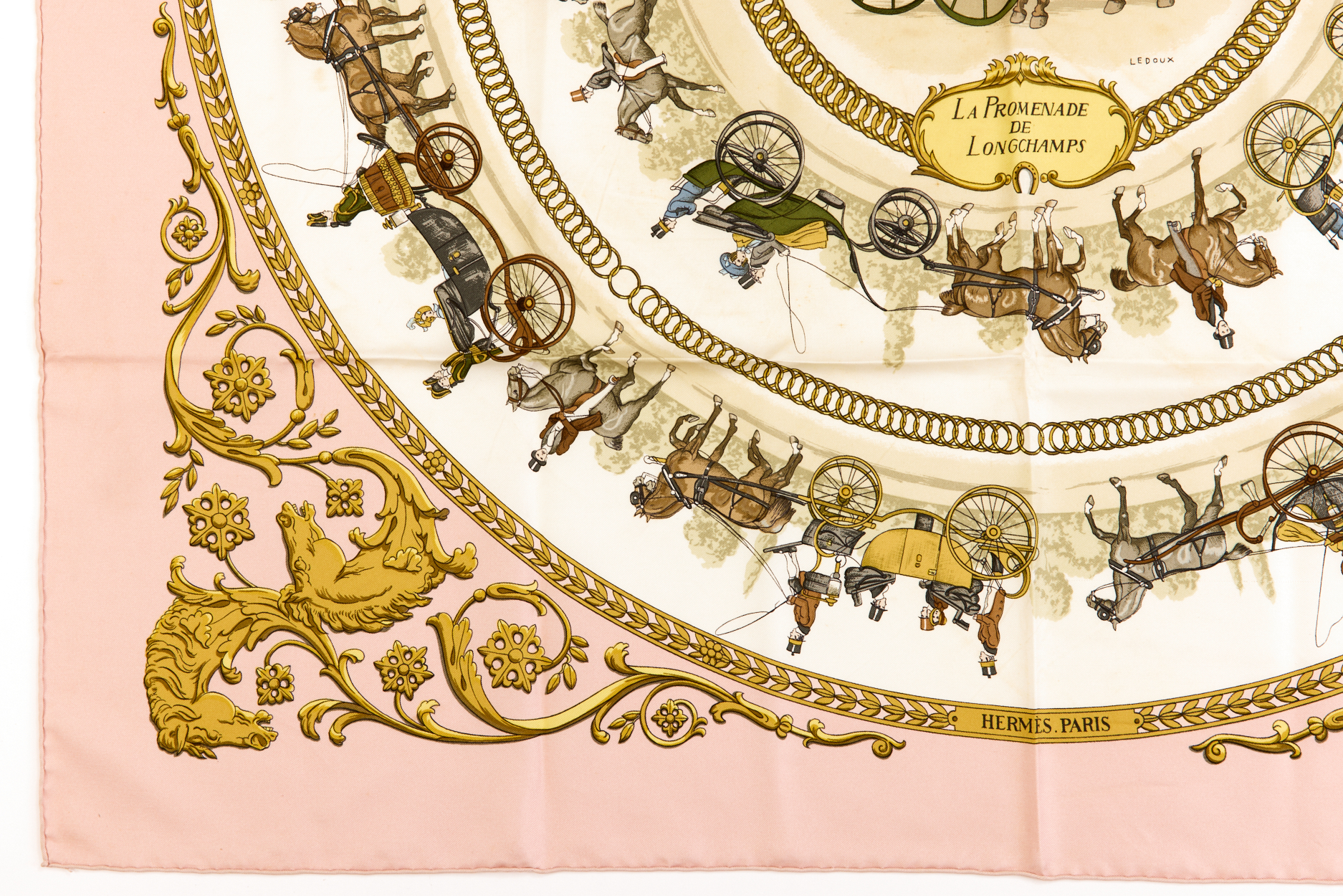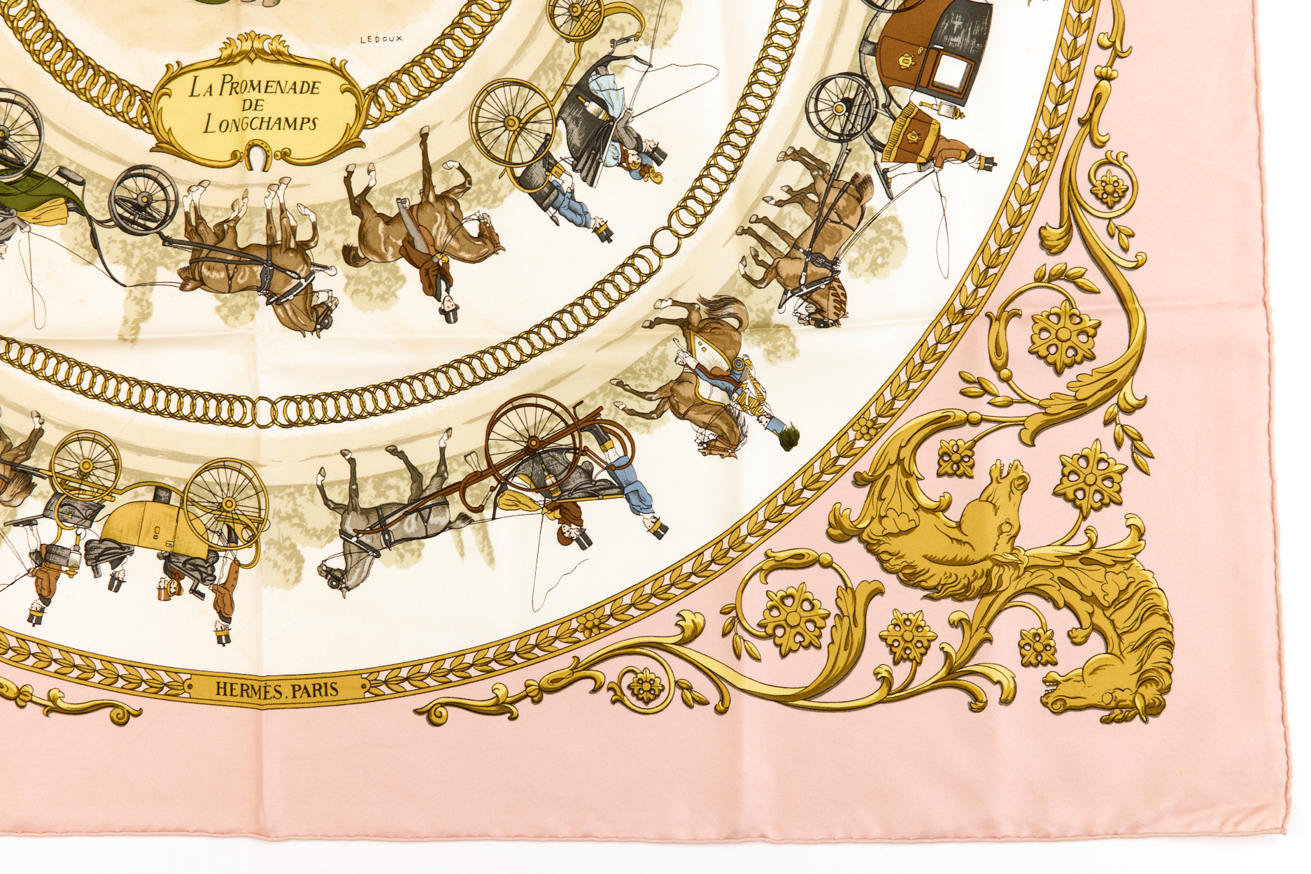 Hermes Silk Scarf Carre 90 “LA PROMENADE DE LONGCHAMPS” Pink Silk Scarf
