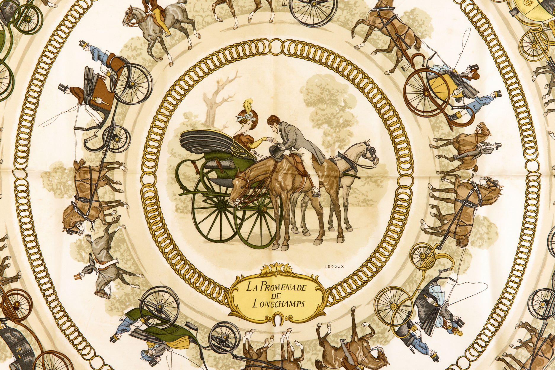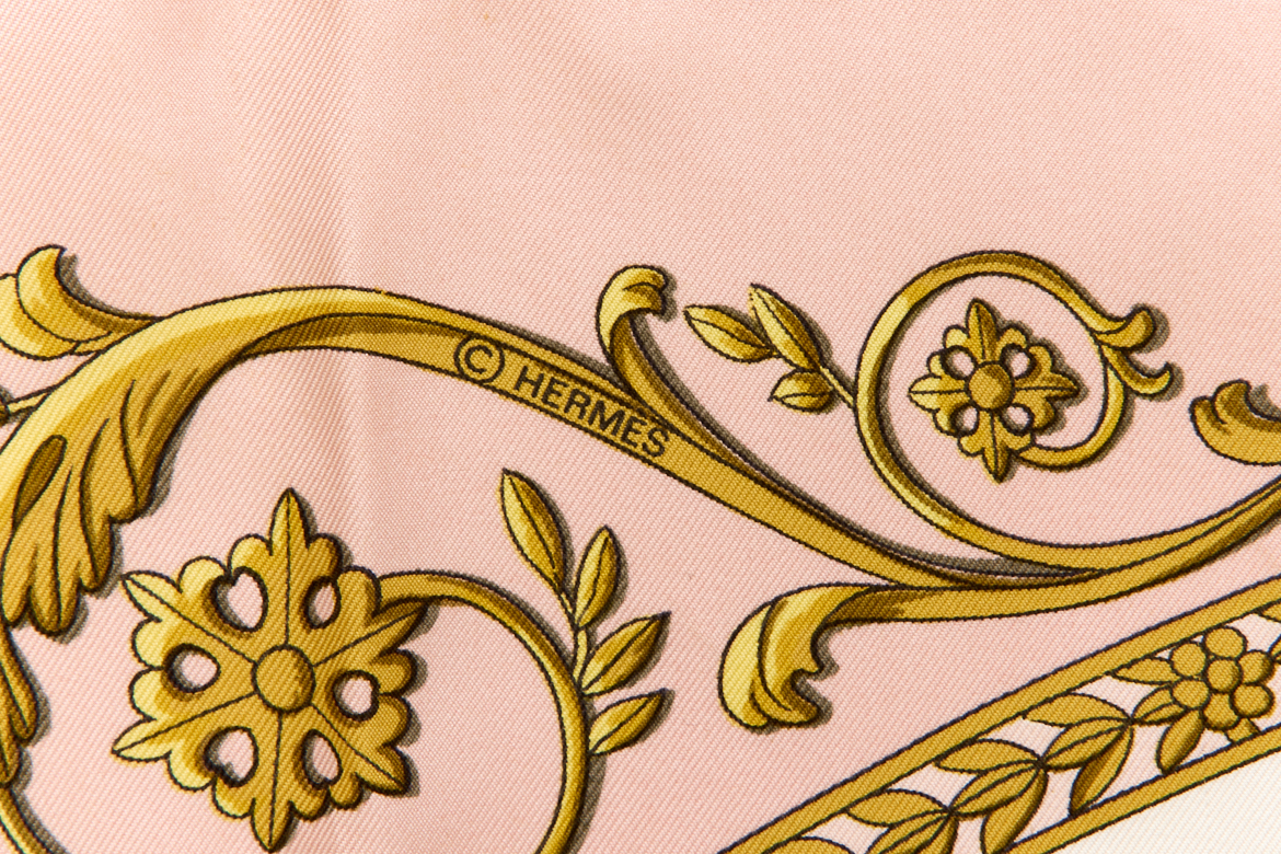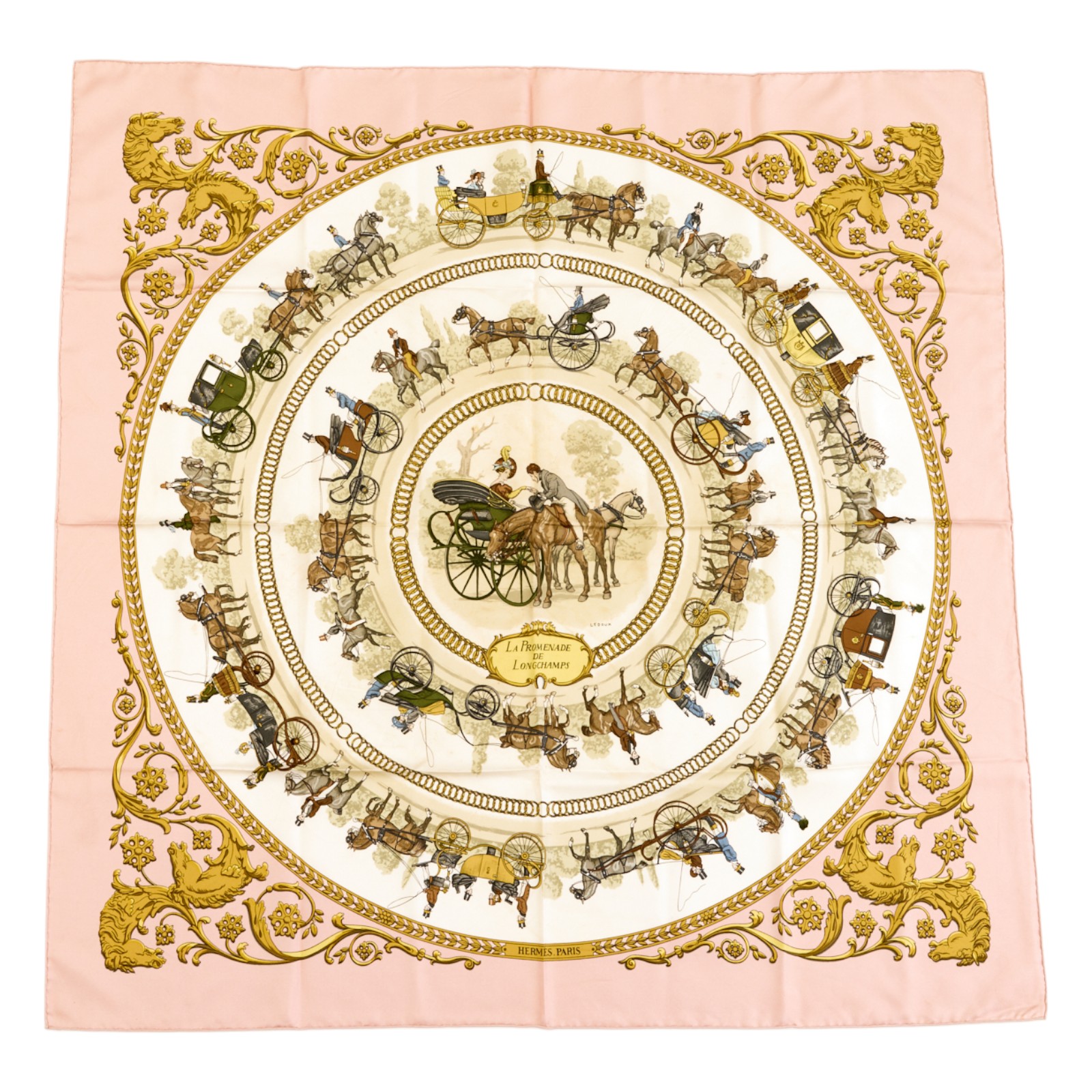 Hermes Silk Scarf Carre 90 “LA PROMENADE DE LONGCHAMPS” Pink Silk Scarf Brand : HERMESDesign by Philippe Ledoux Issued 1965Item : ScarfSize : 88.5cm * 88.5cmMaterial : 100% SilkCondition Score: B*For reference. The condition shown in the image takes precedence.*Please see the last two photos to see if the tag is still attached