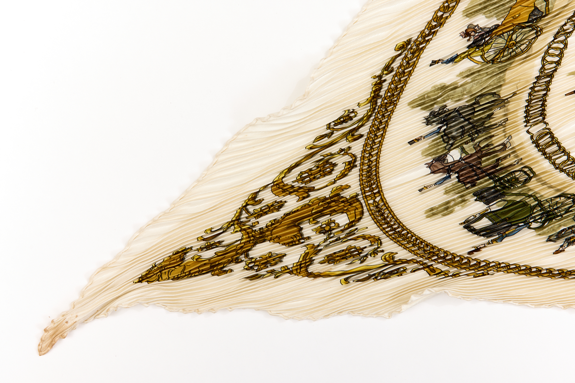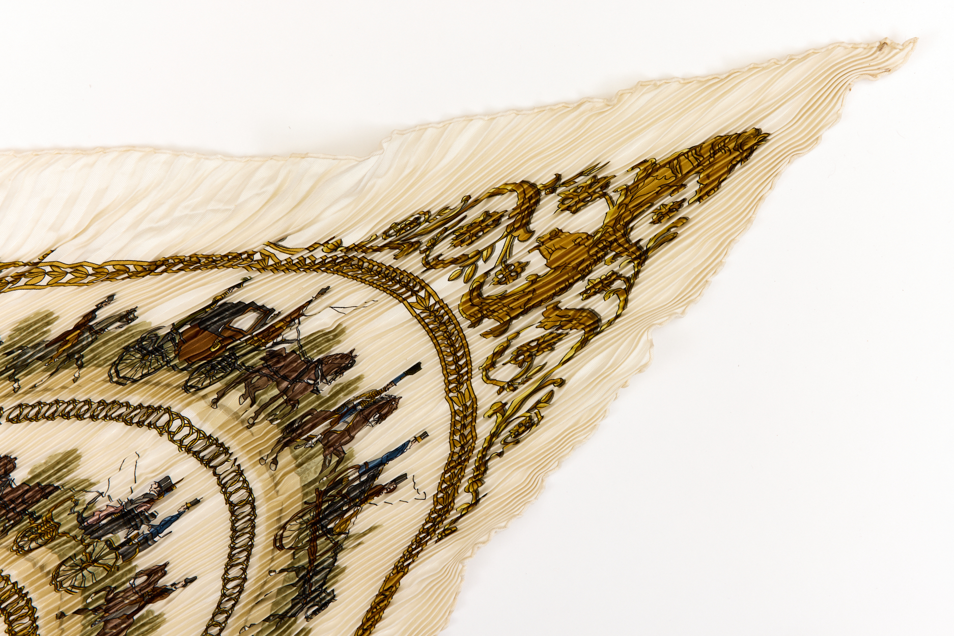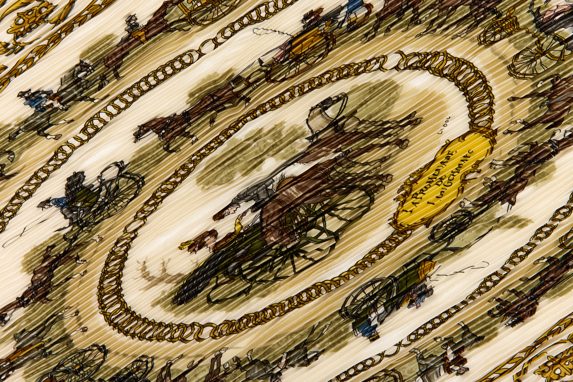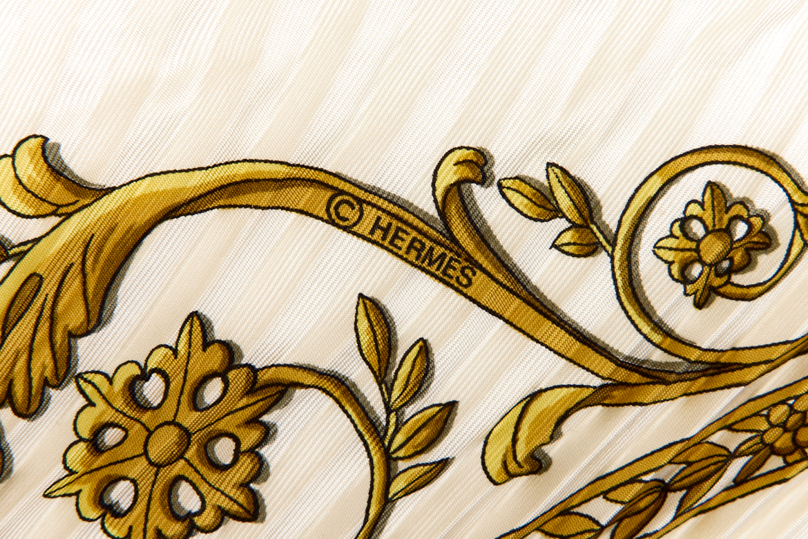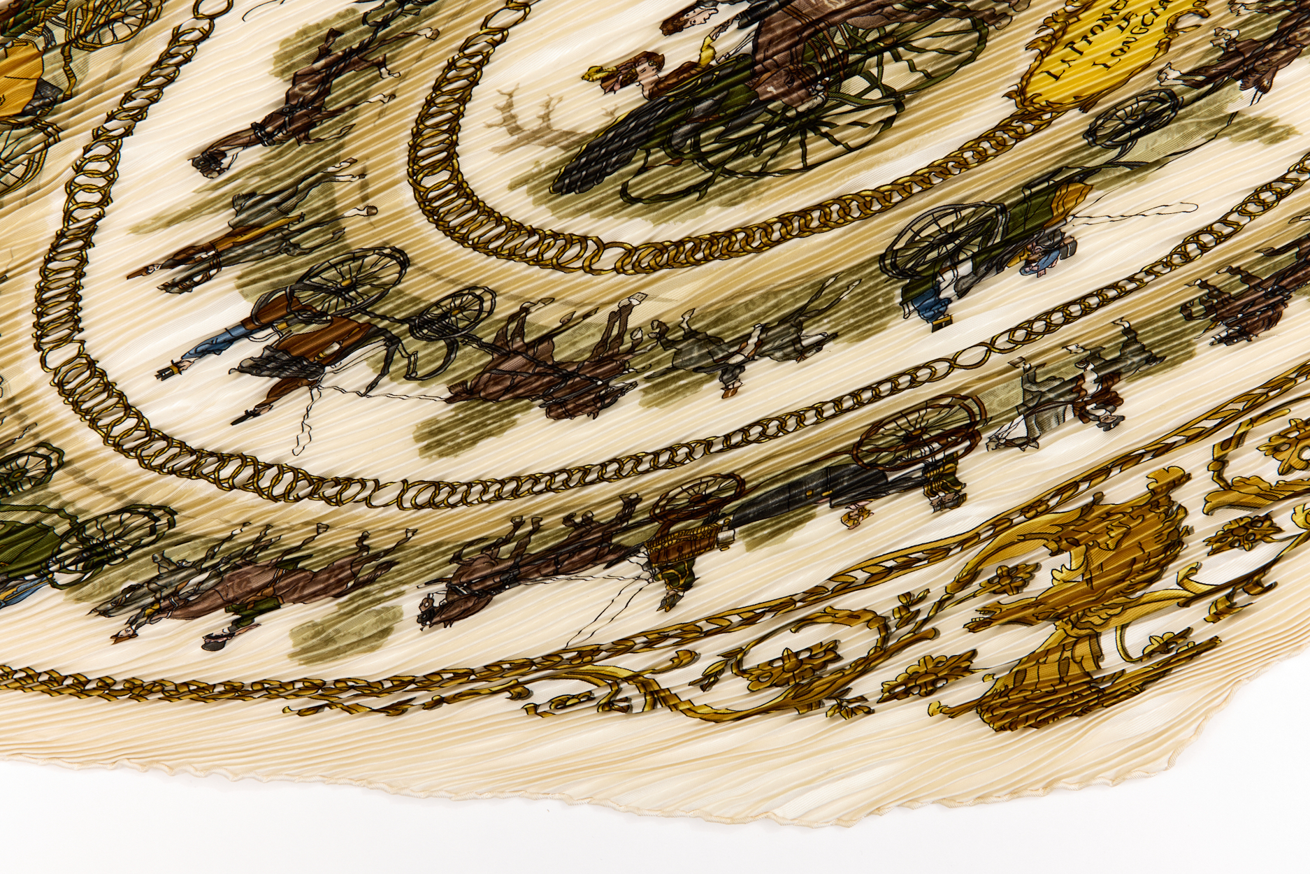 Hermes Silk Scarf Carre 90 “LA PROMENADE DE LONGCHAMPS” White Silk Pleats Scarf