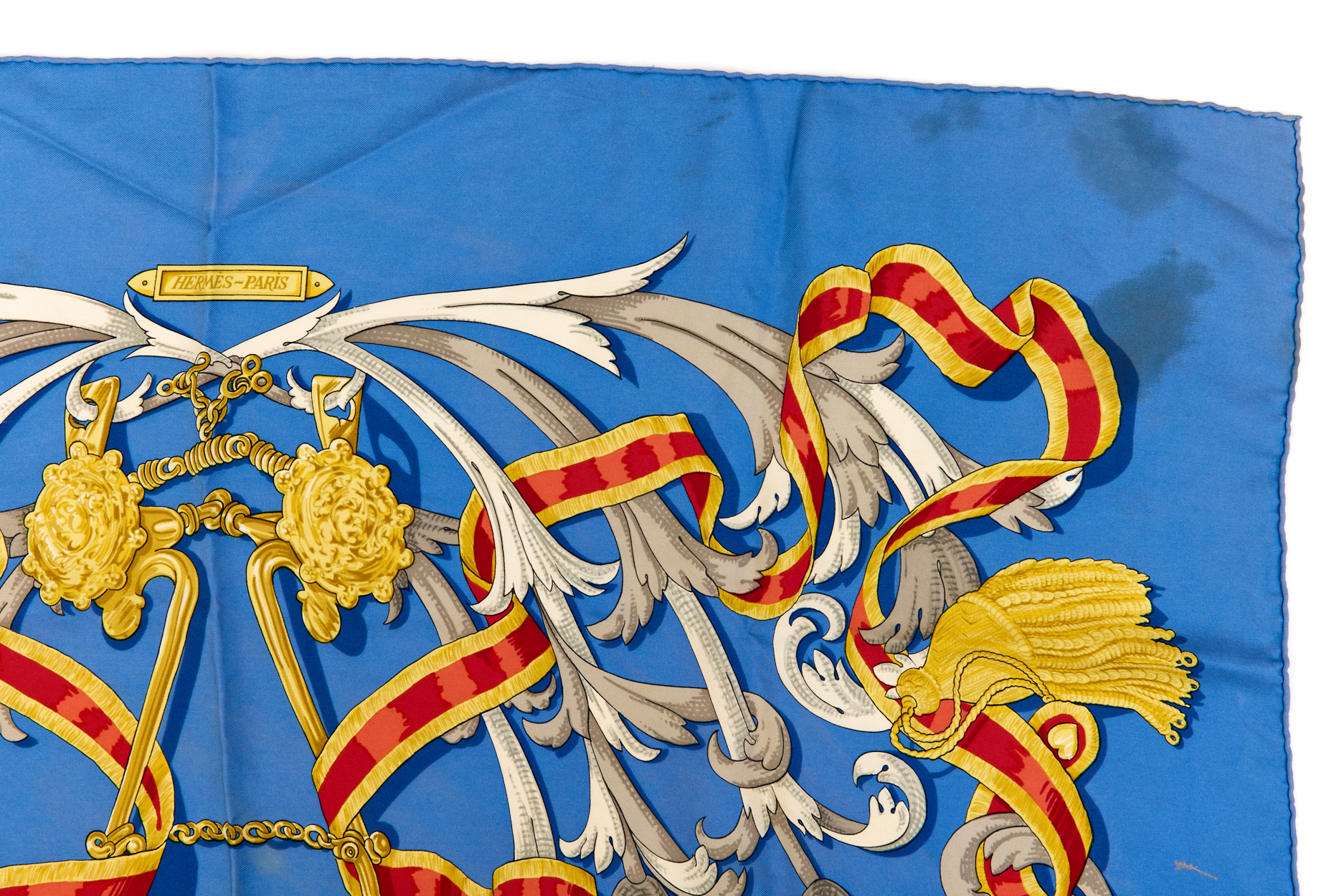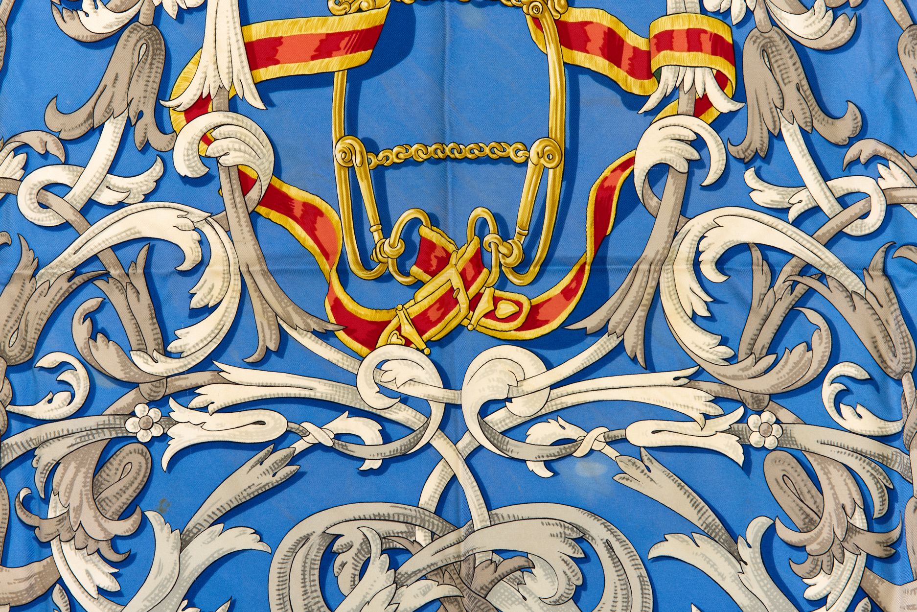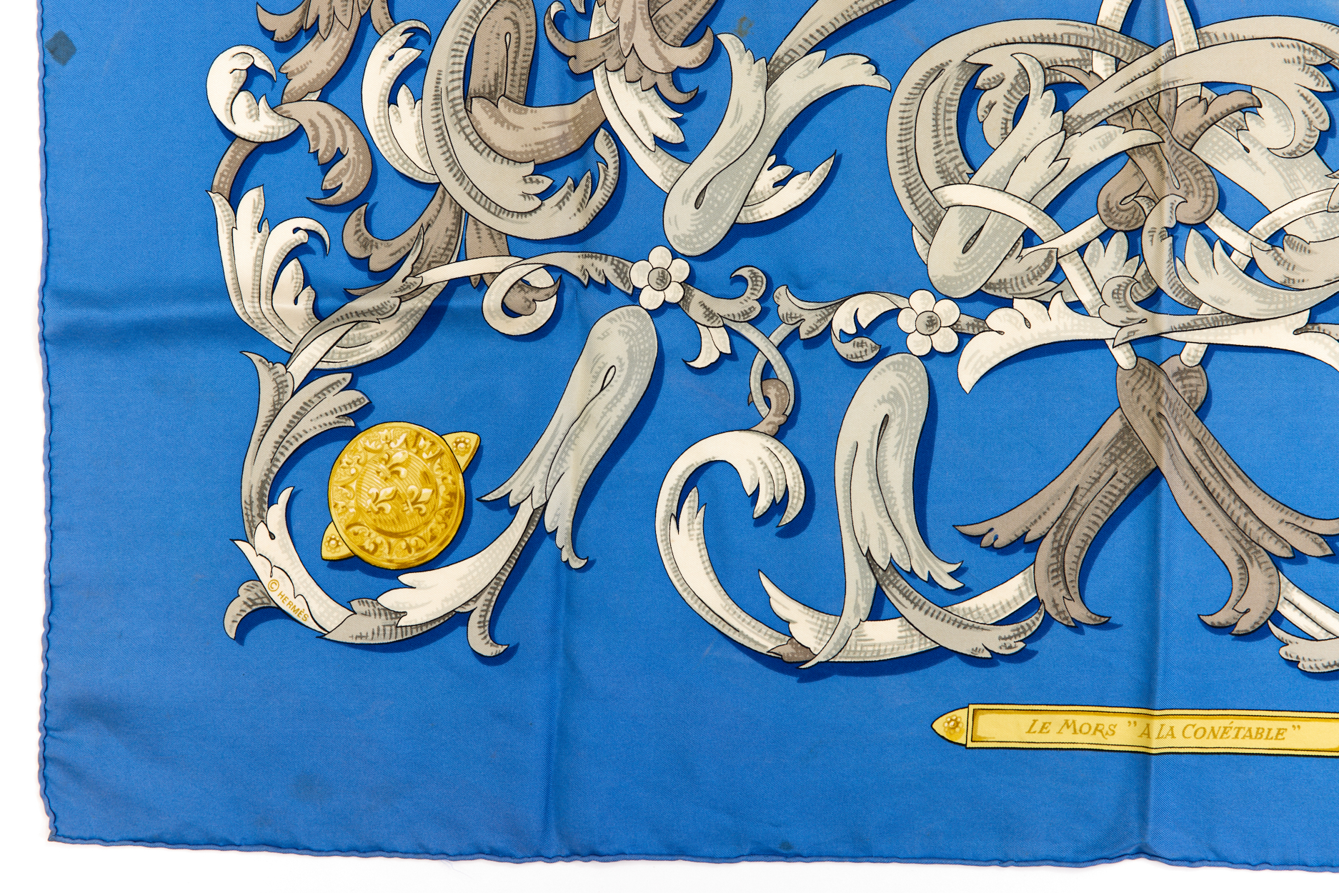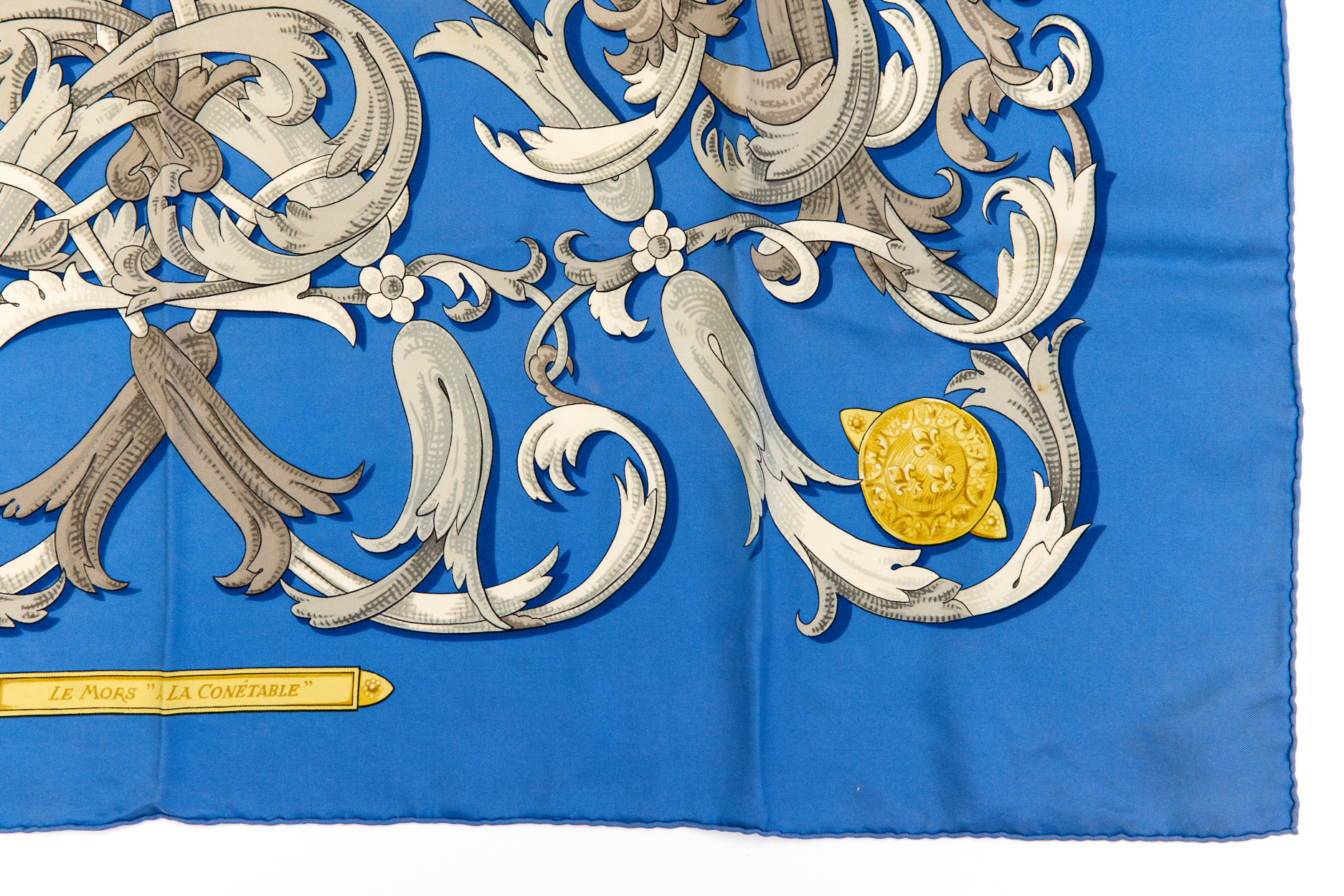 Hermes Silk Scarf Carre 90 “LE MORS A LA CONETABLE” Blue Silk Scarf