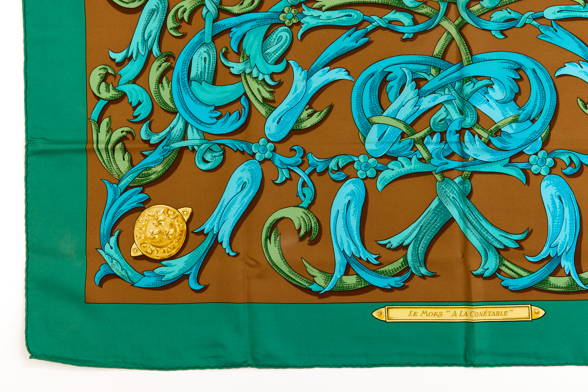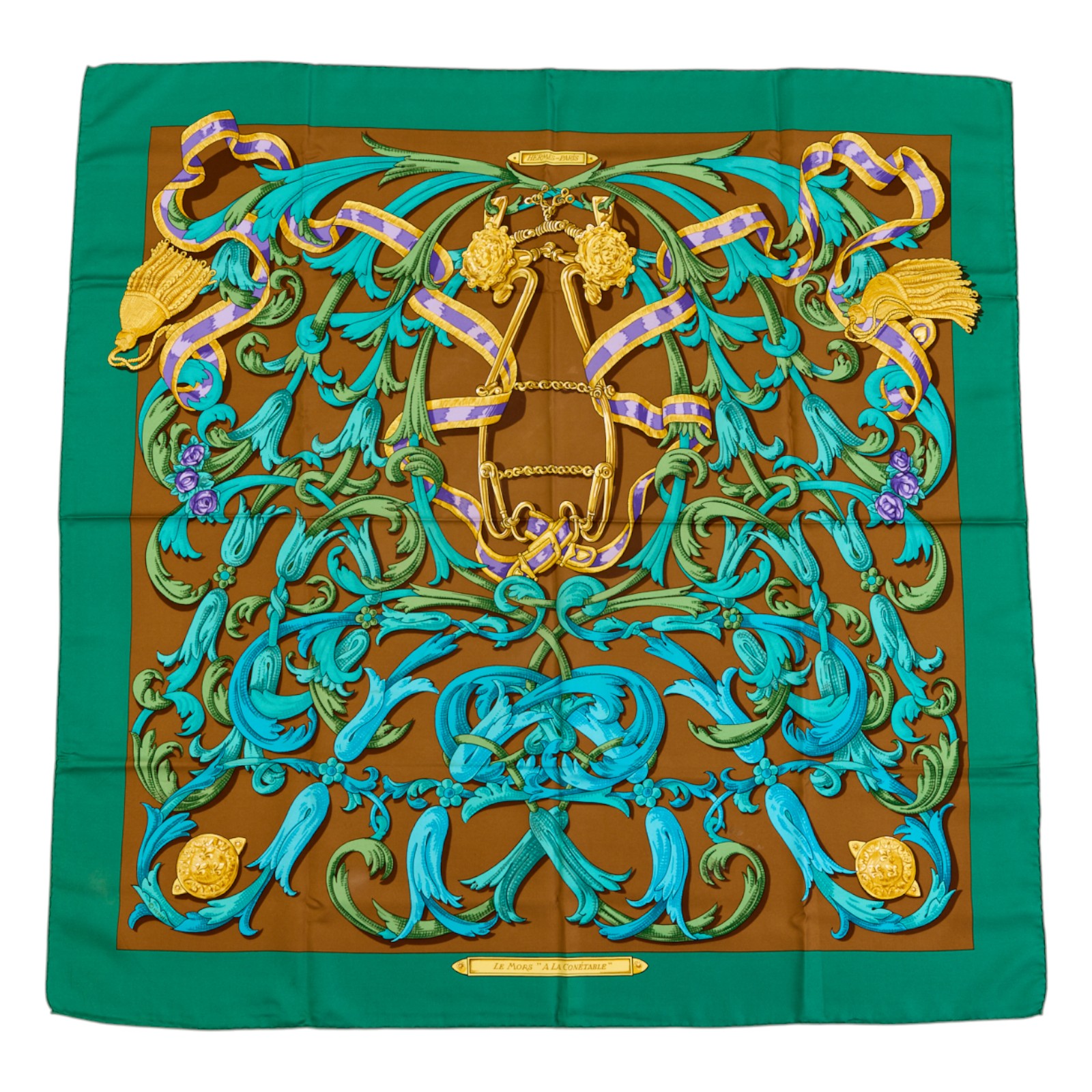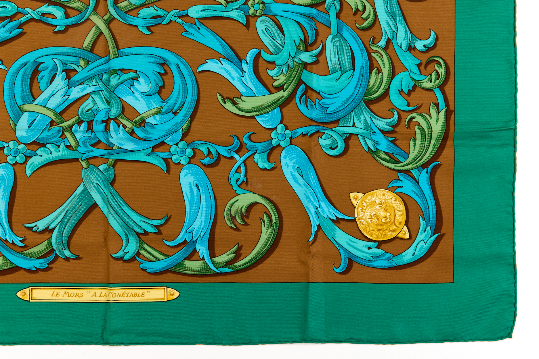 Hermes Silk Scarf Carre 90 “LE MORS A LA CONETABLE” Green Silk Pleats Scarf