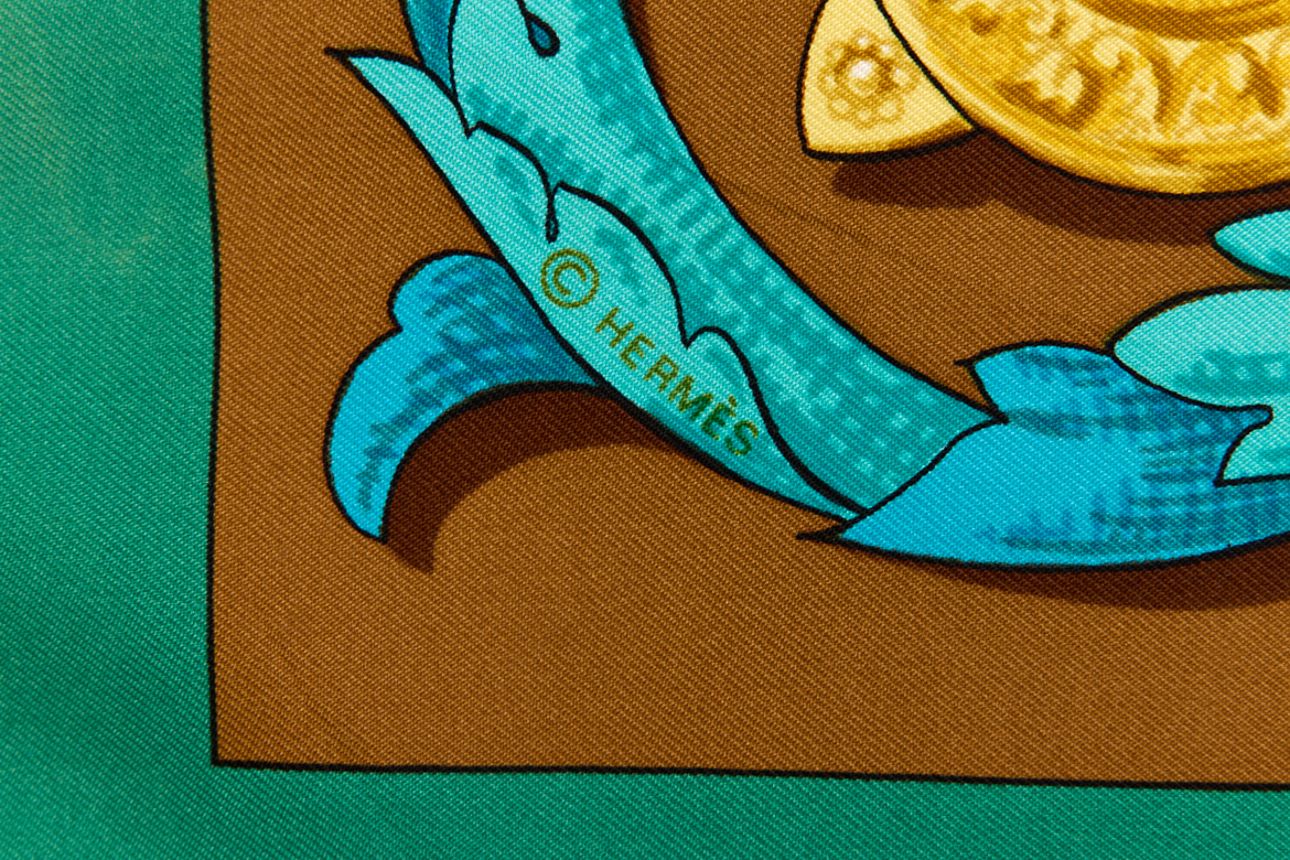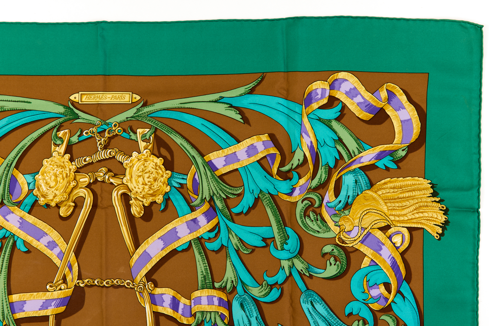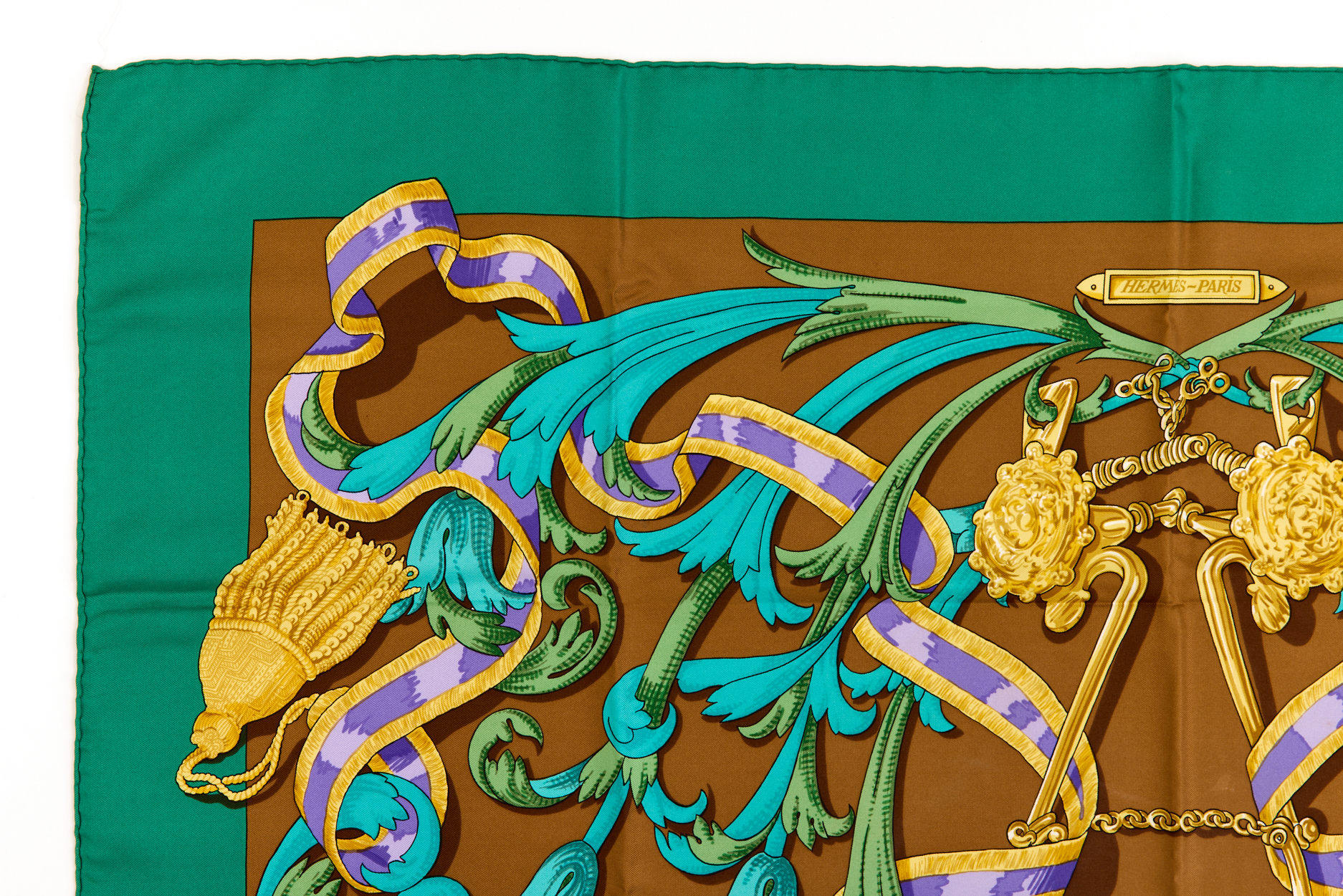 Hermes Silk Scarf Carre 90 “LE MORS A LA CONETABLE” Green Silk Pleats Scarf