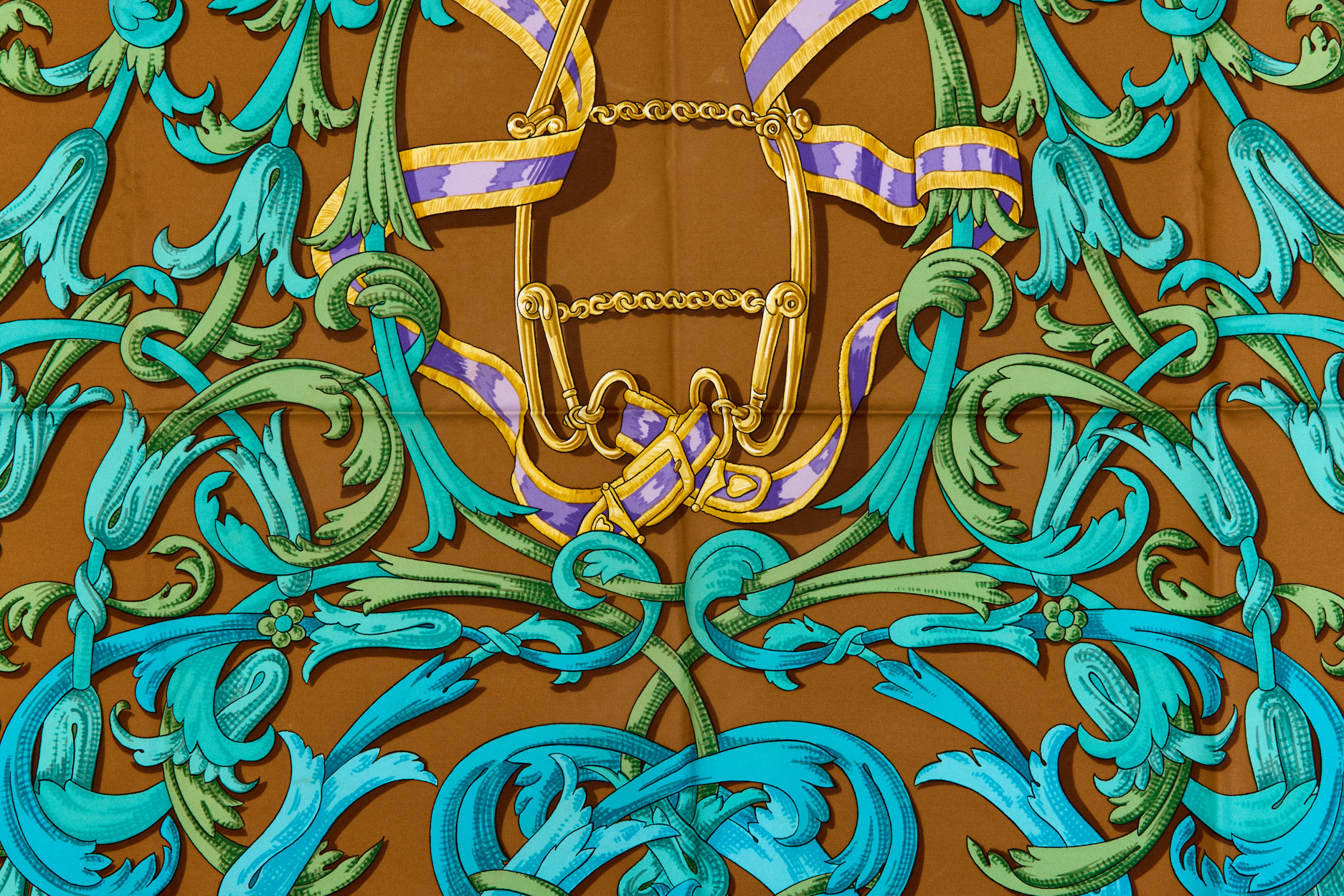 Hermes Silk Scarf Carre 90 “LE MORS A LA CONETABLE” Green Silk Pleats Scarf Brand : HERMESDesign by Henri d’Origny Issued 1970Item : ScarfSize : 88.5cm * 88.5cmMaterial : 100% SilkCondition Score: B+*For reference. The condition shown in the image takes precedence.*Please see the last two photos to see if the tag is still attached
