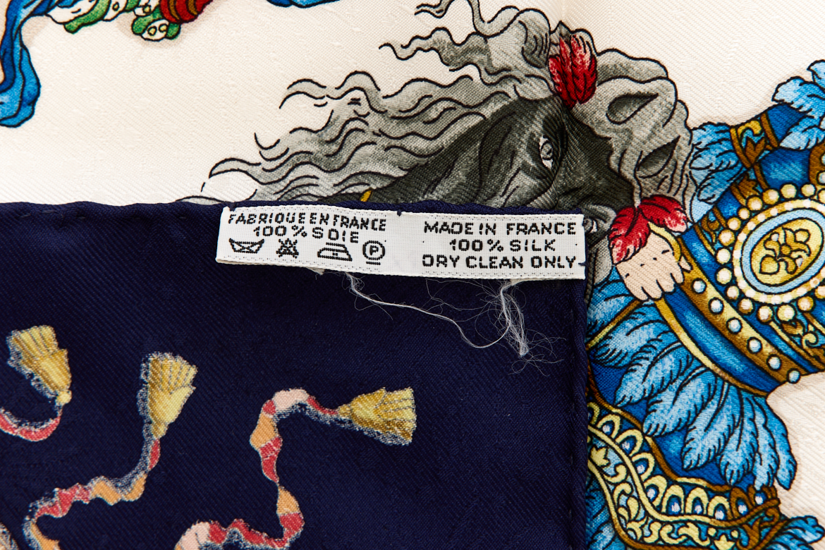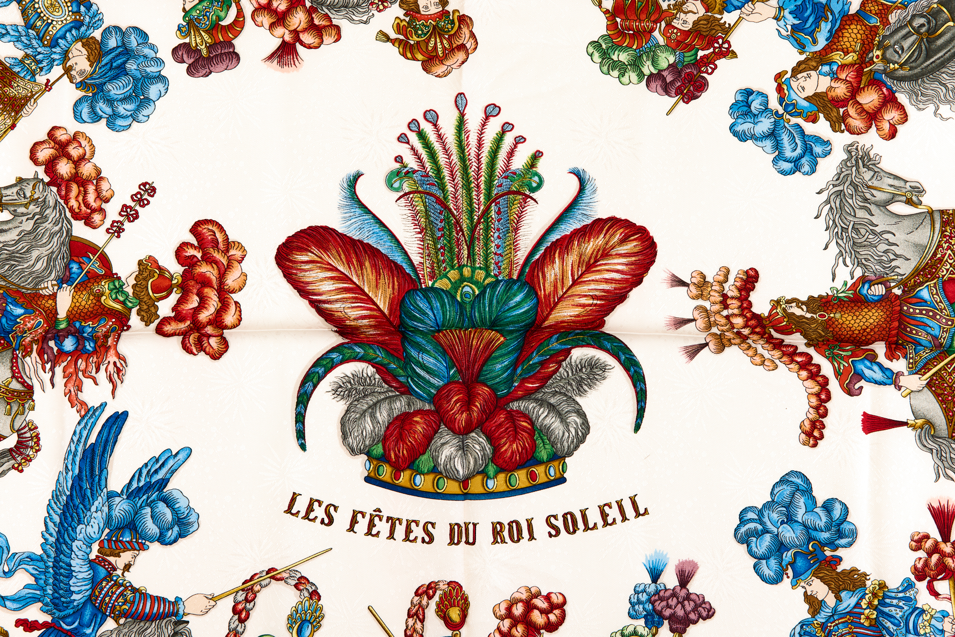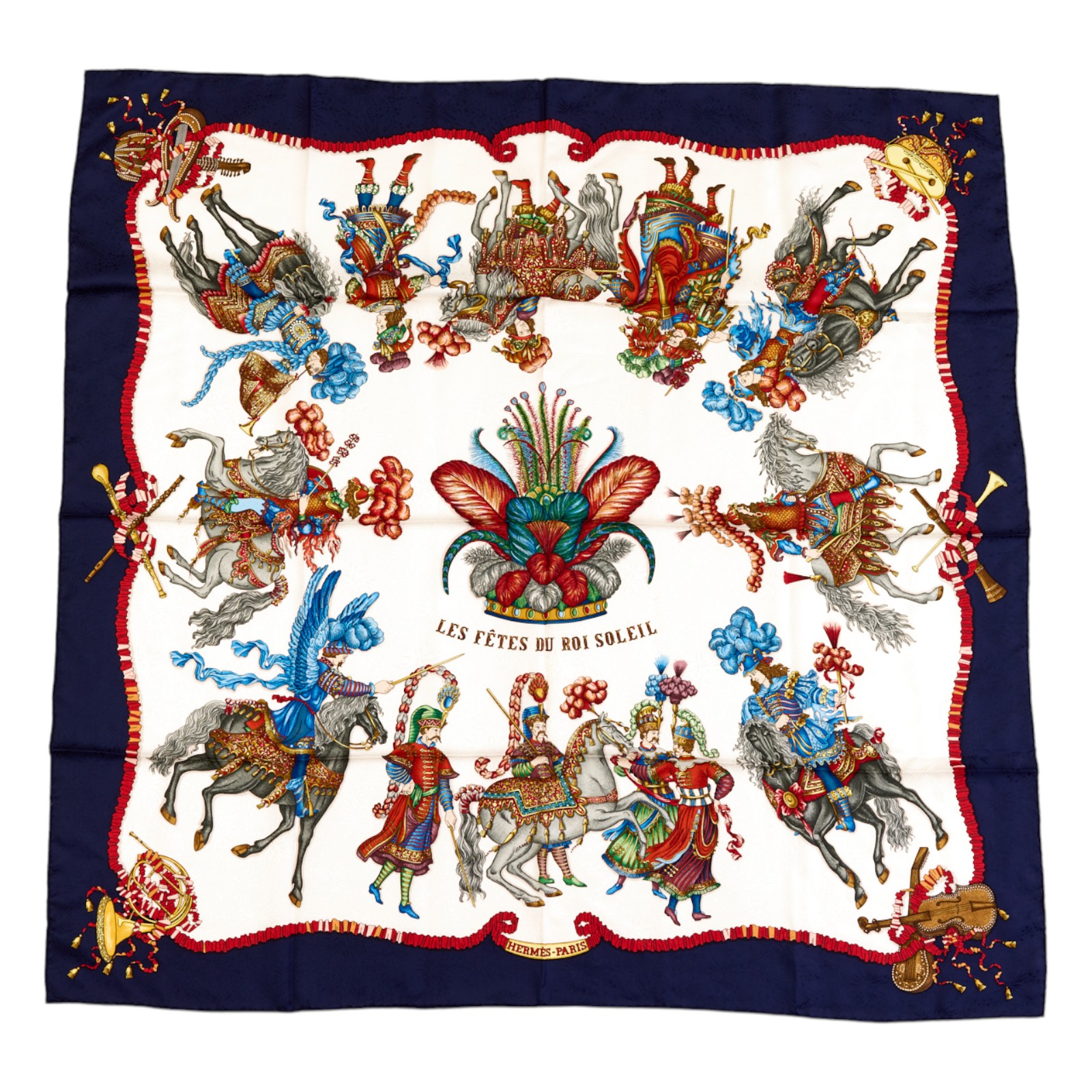 Hermes Silk Scarf Carre 90 “Les Fetes du Roi Soleil” Blue Silk Scarf Brand : HERMESDesign by Michel Duchene Issued 1994Item : ScarfSize : 88.5cm * 88.5cmMaterial : 100% SilkCondition Score: B+*For reference. The condition shown in the image takes precedence.*Please see the last two photos to see if the tag is still attached