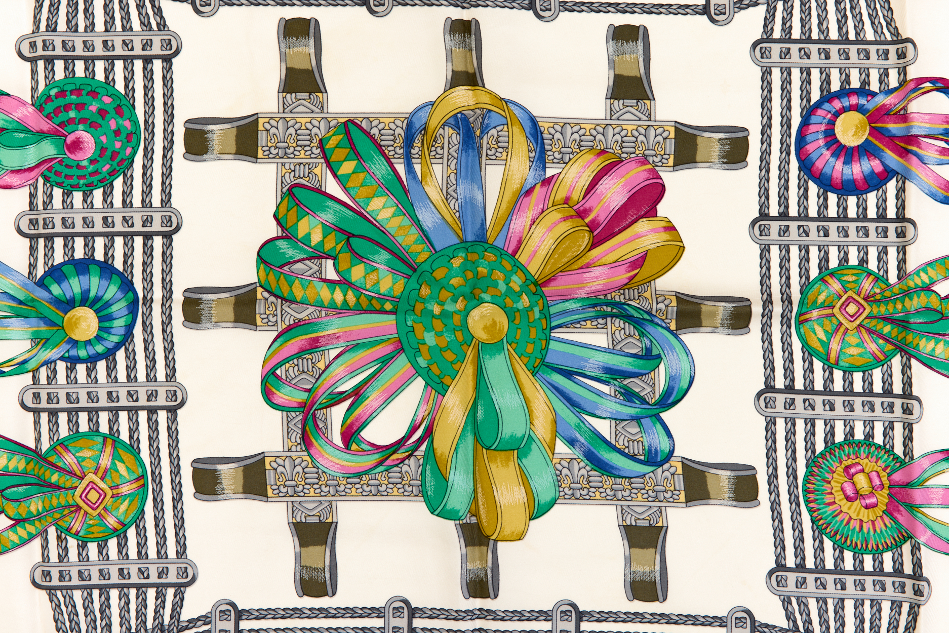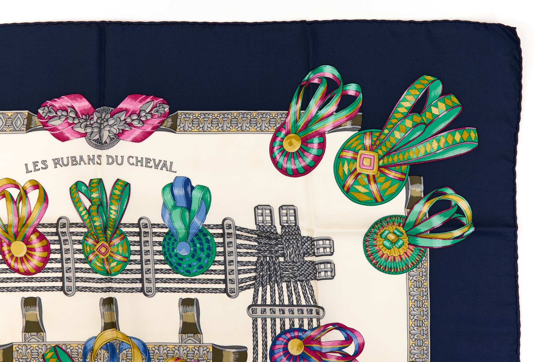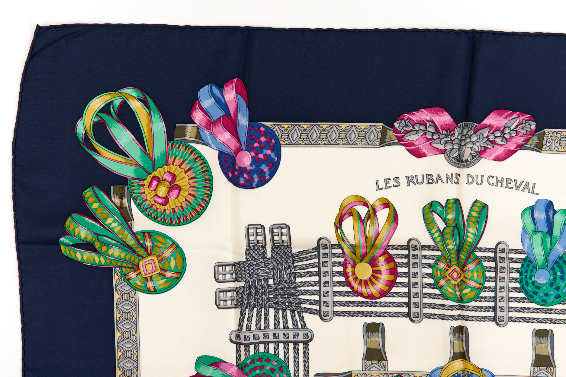 Hermes Silk Scarf Carre 90 “Les Rubans du Cheval” Blue Silk Scarf Brand : HERMESDesign by Joachim Metz Issued 1988Item : ScarfSize : 88.5cm * 88.5cmMaterial : 100% SilkCondition Score: B+*For reference. The condition shown in the image takes precedence.*Please see the last two photos to see if the tag is still attached