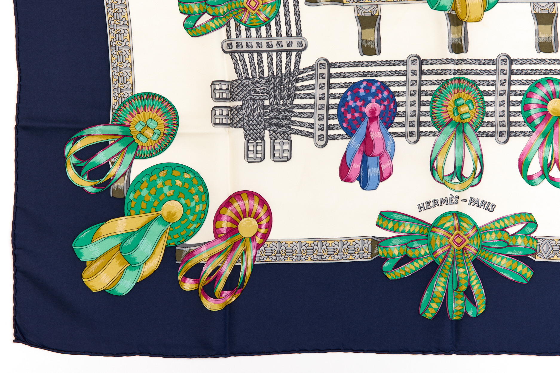 Hermes Silk Scarf Carre 90 “Les Rubans du Cheval” Blue Silk Scarf
