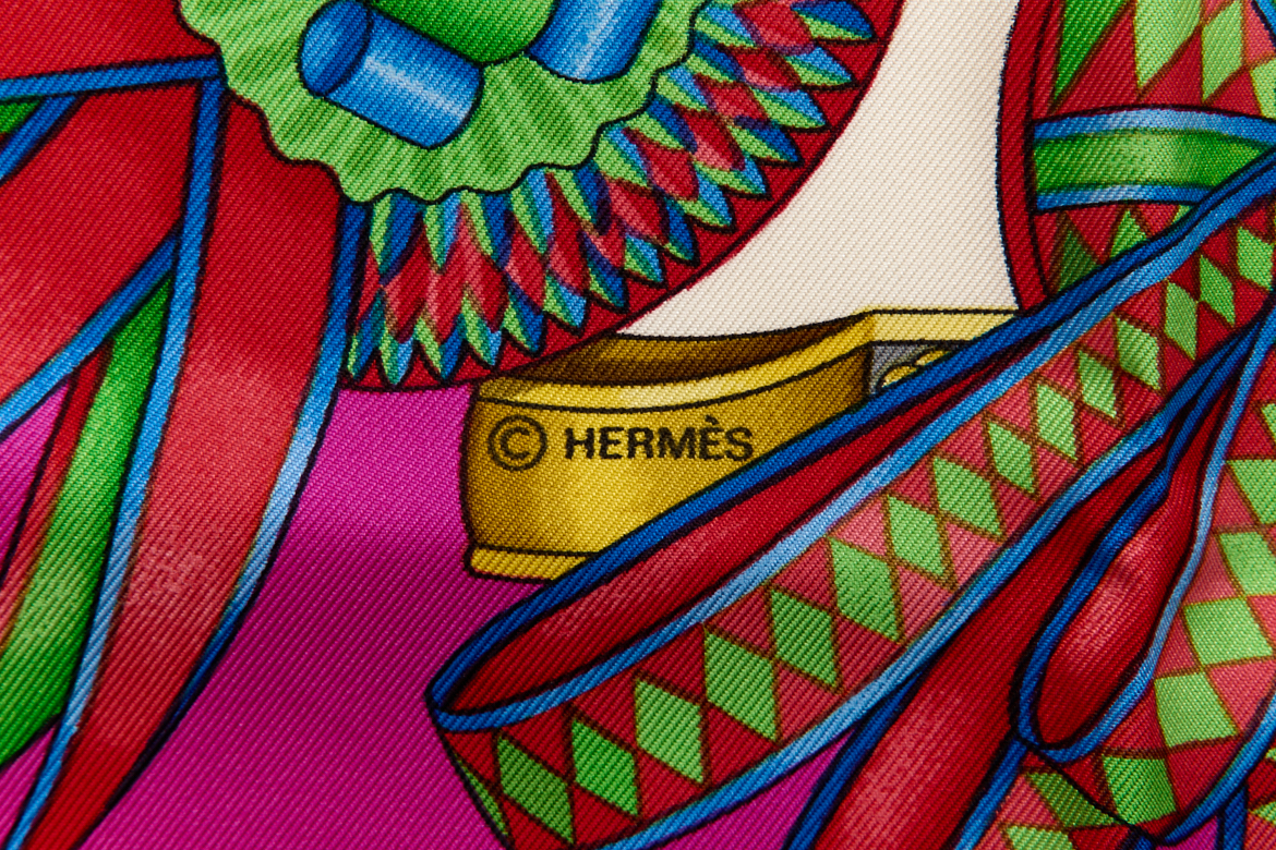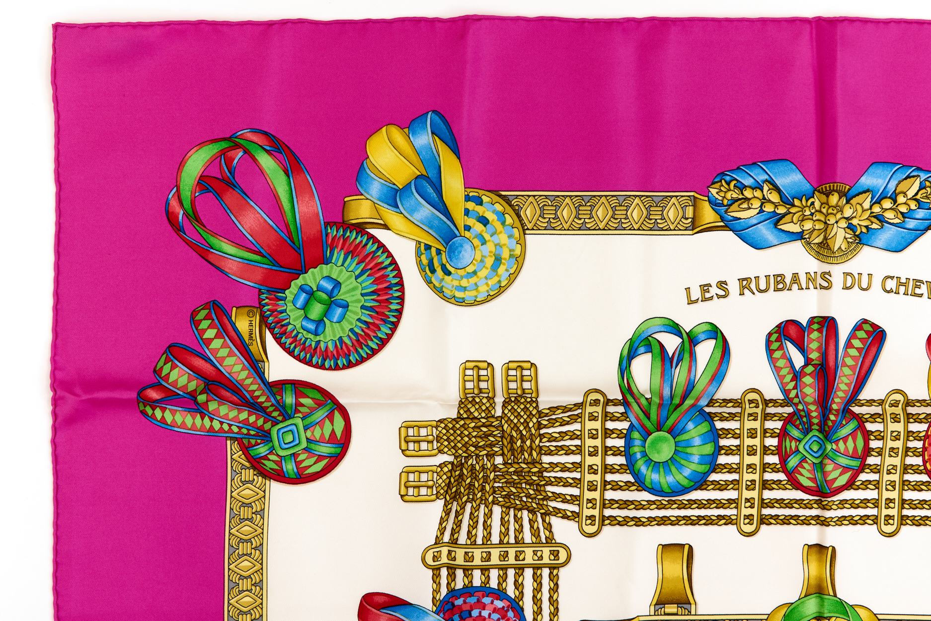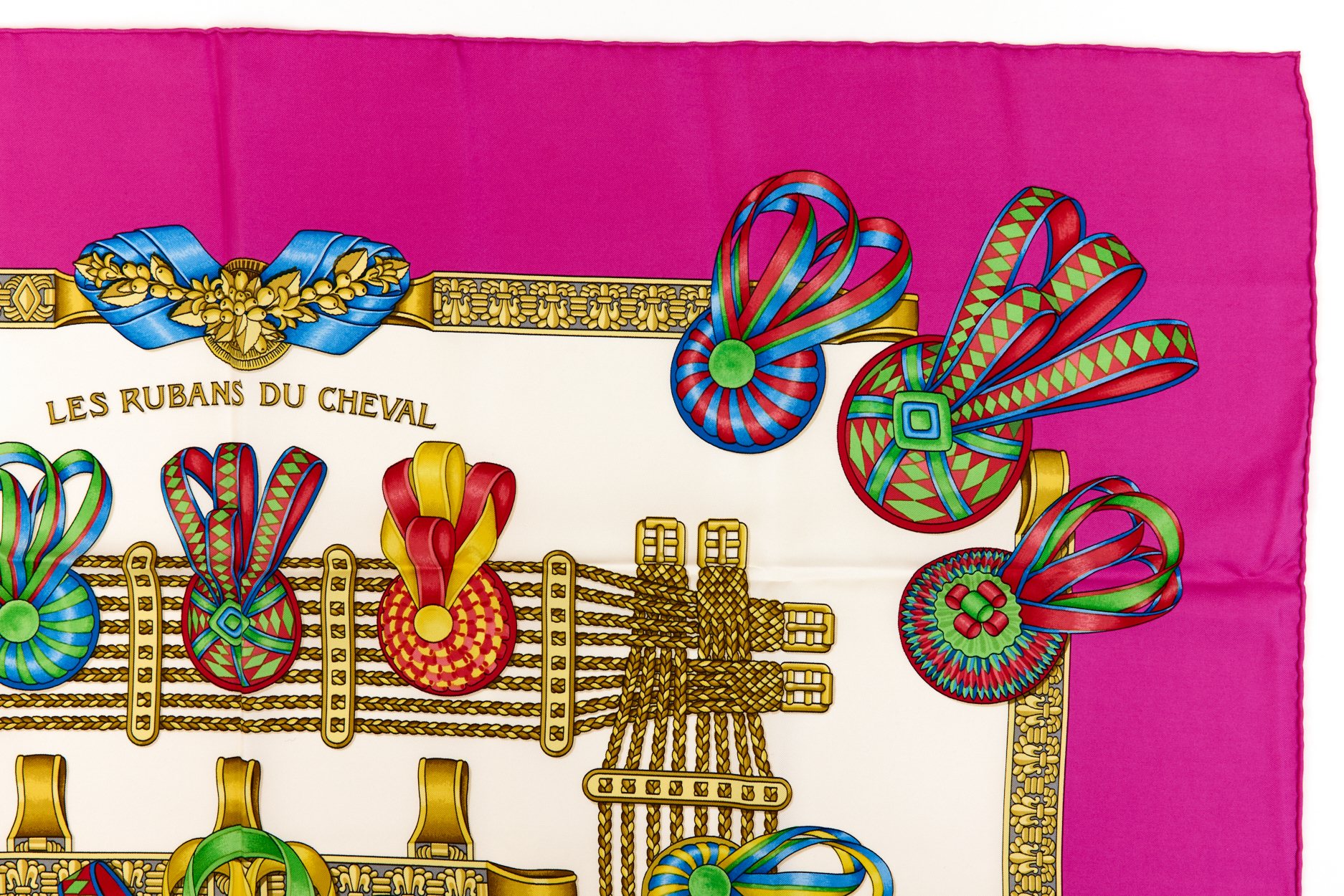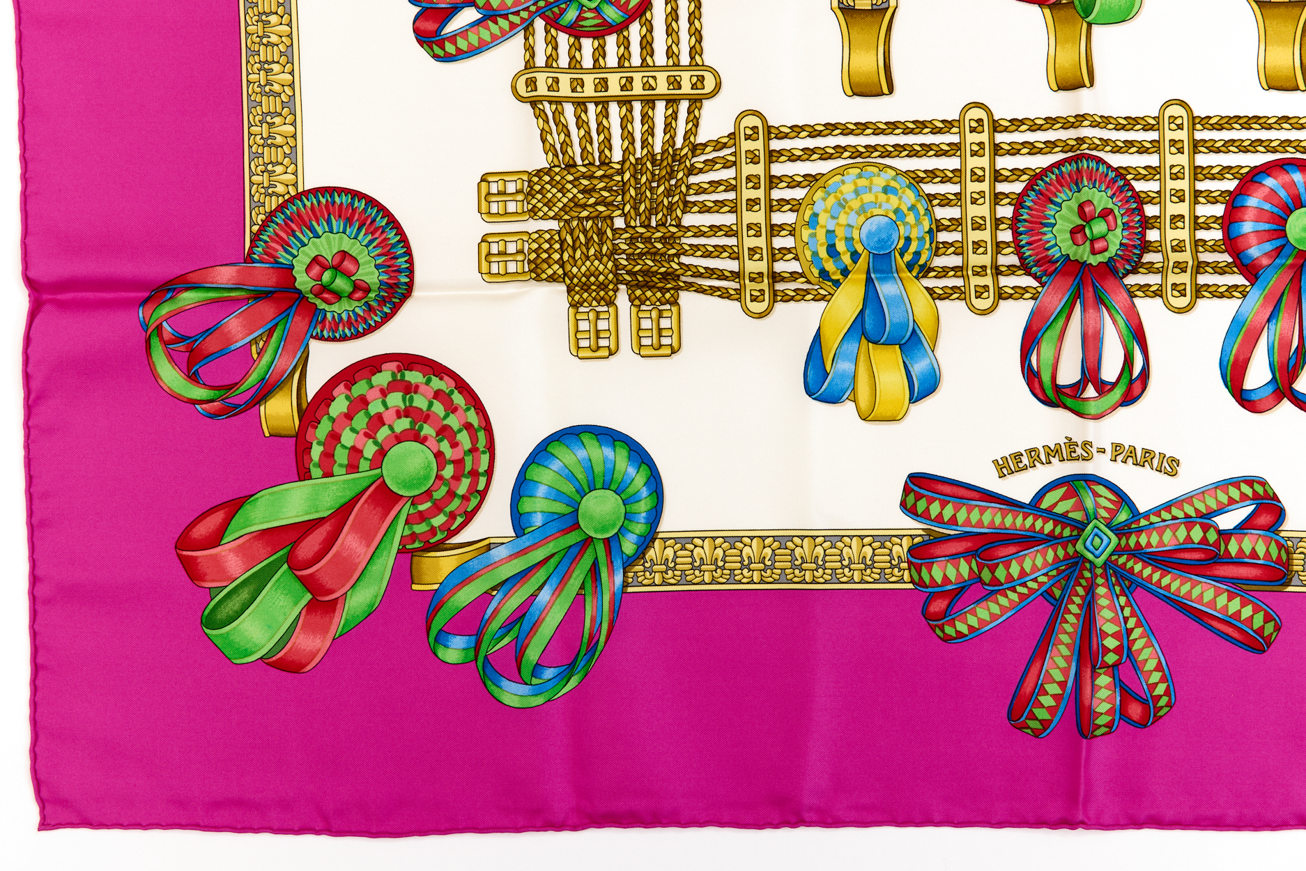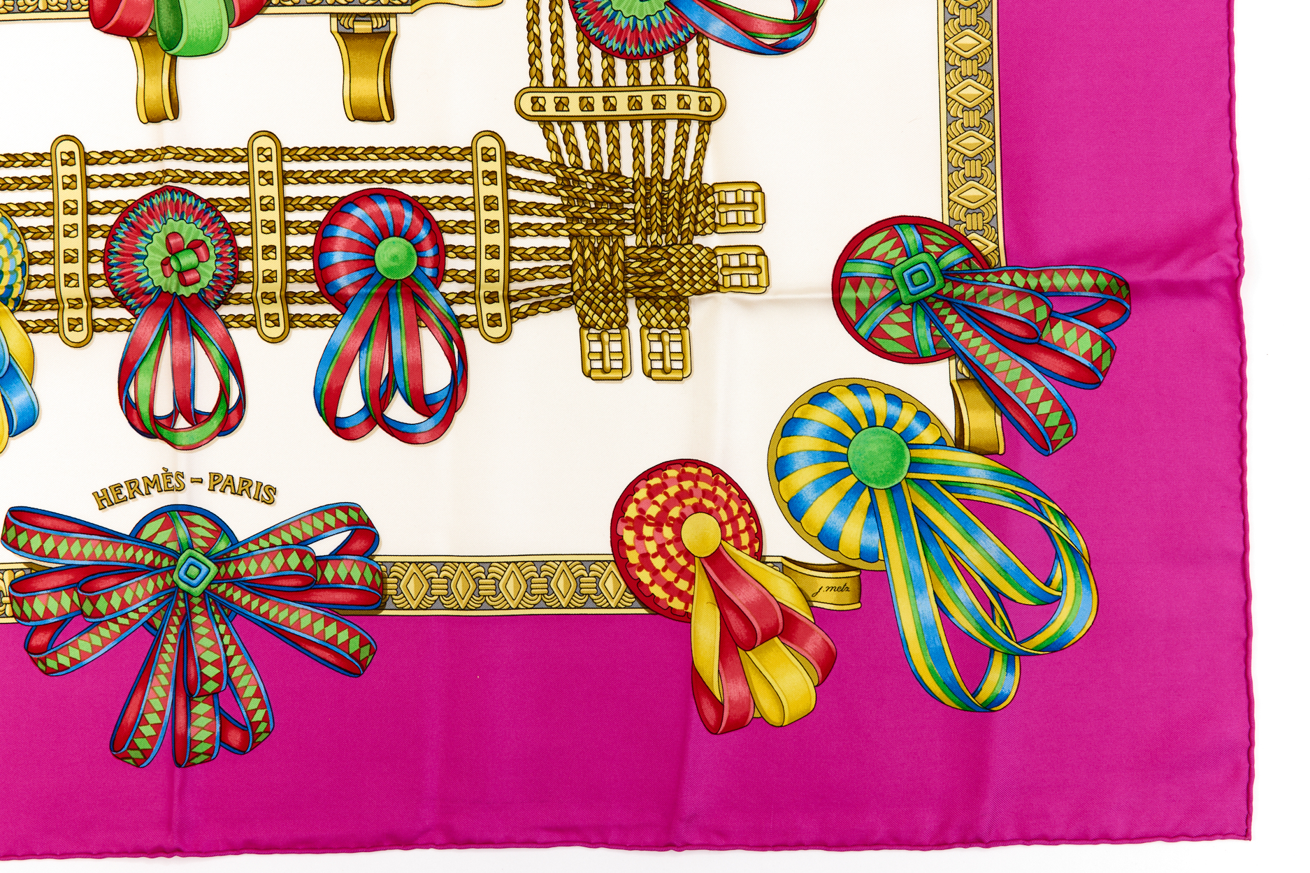 Hermes Silk Scarf Carre 90 “Les Rubans du Cheval” Pink Silk Scarf Brand : HERMESDesign by Joachim Metz Issued 1988Item : ScarfSize : 88.5cm * 88.5cmMaterial : 100% SilkCondition Score: B+*For reference. The condition shown in the image takes precedence.*Please see the last two photos to see if the tag is still attached