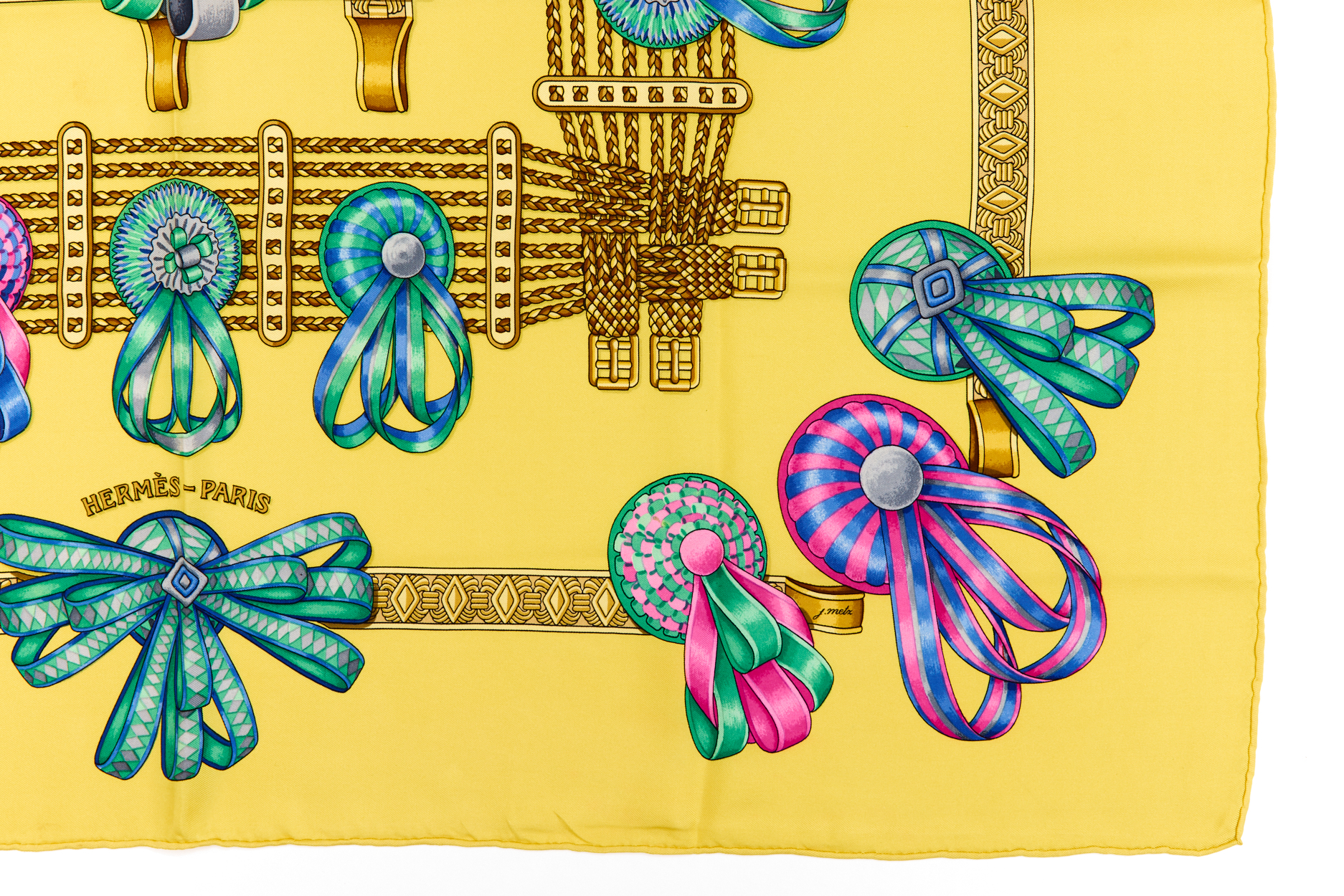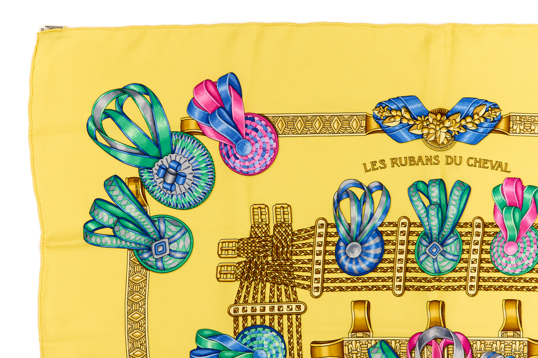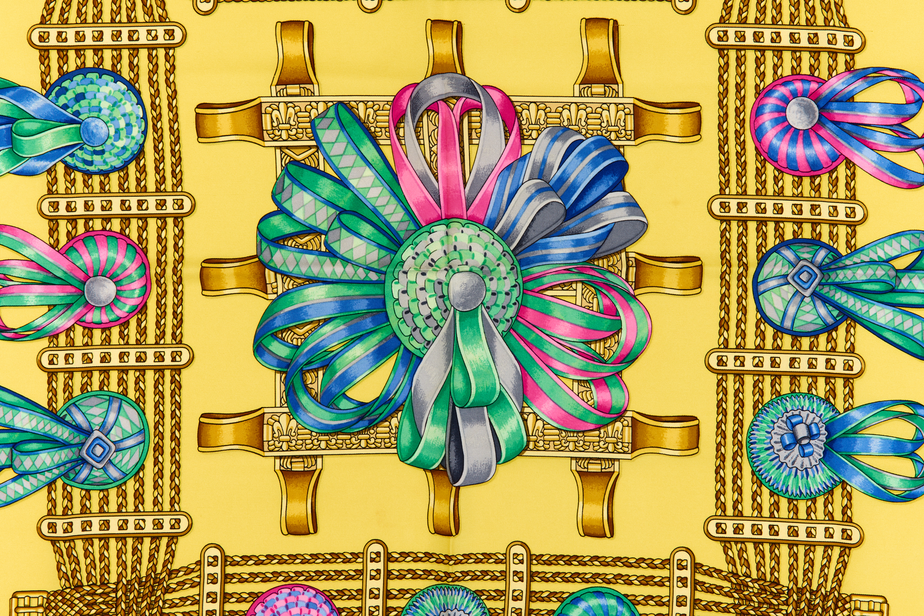 Hermes Silk Scarf Carre 90 “Les Rubans du Cheval” Yellow Silk Scarf