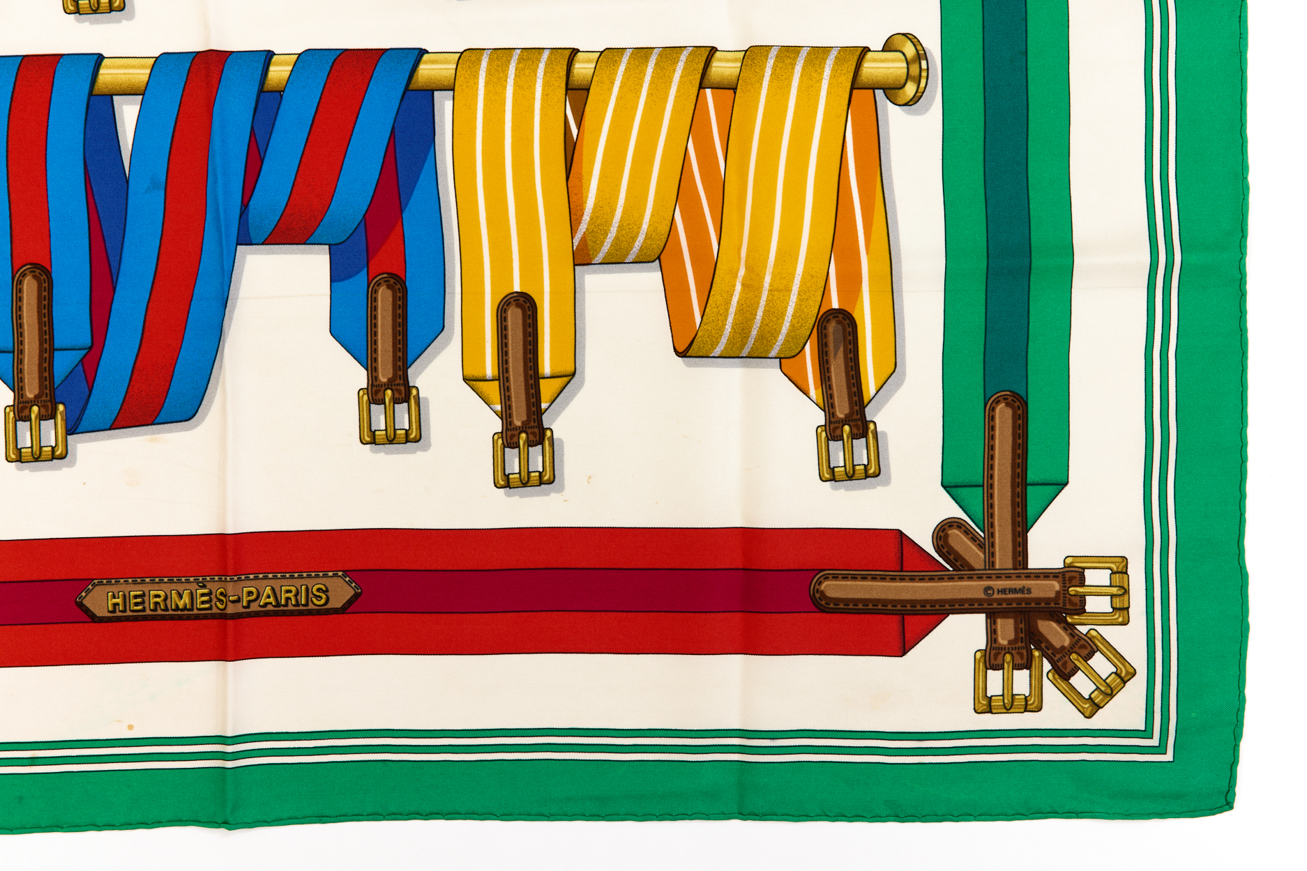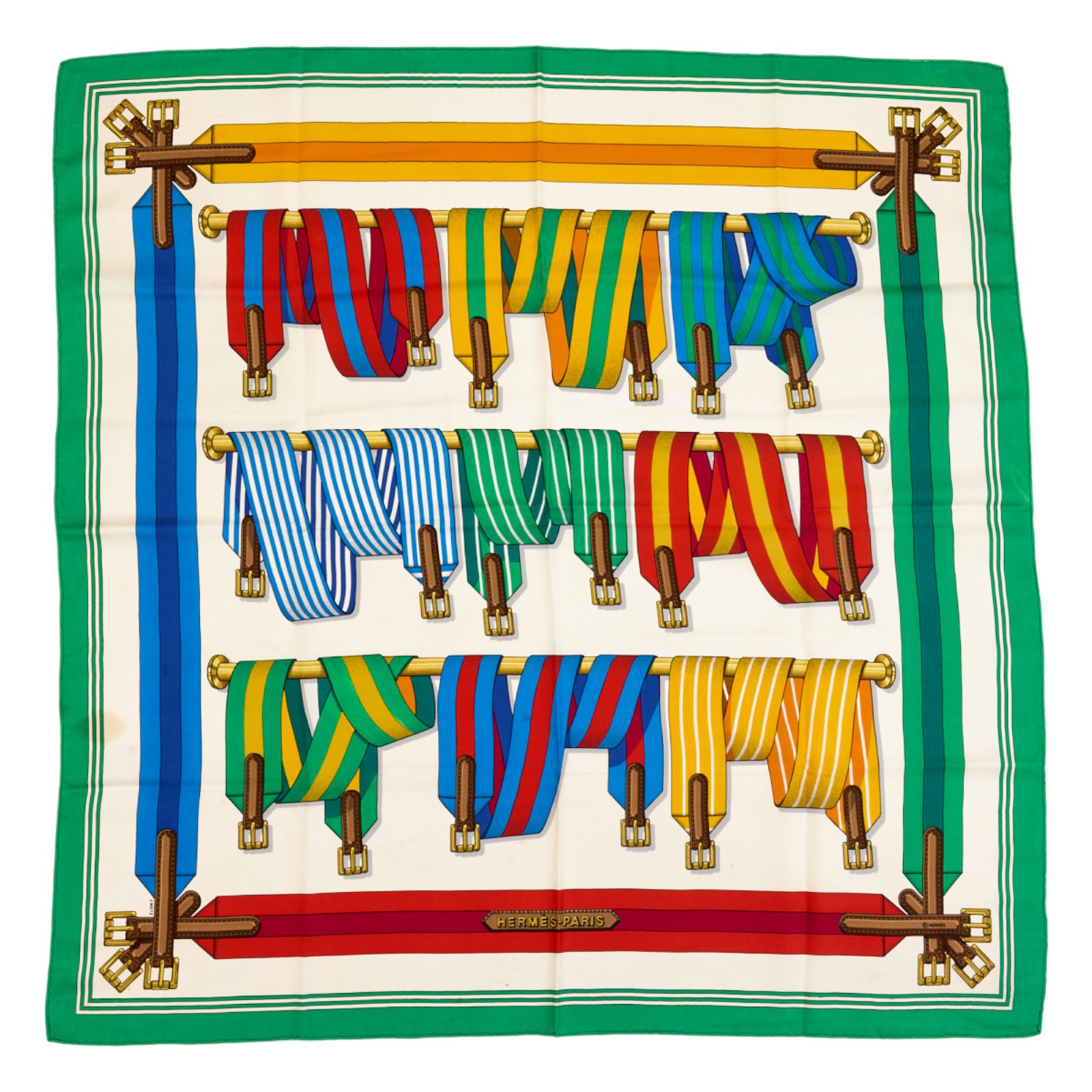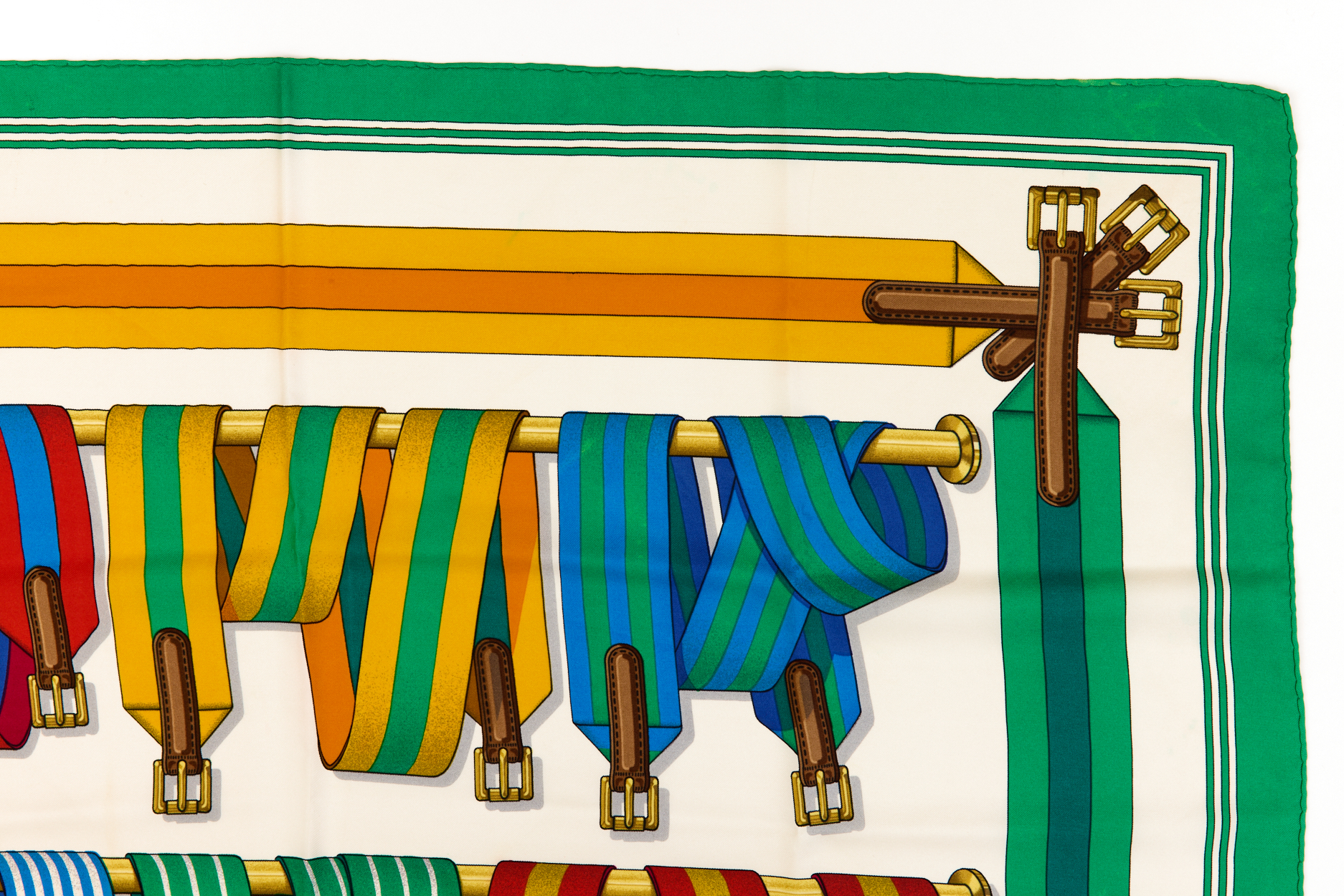 Hermes Silk Scarf Carre 90 “Les Sangles” Green Silk Scarf
