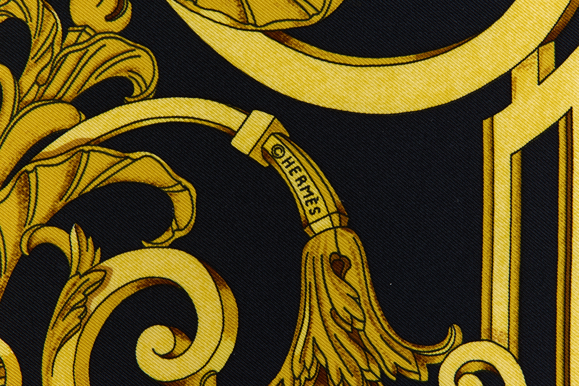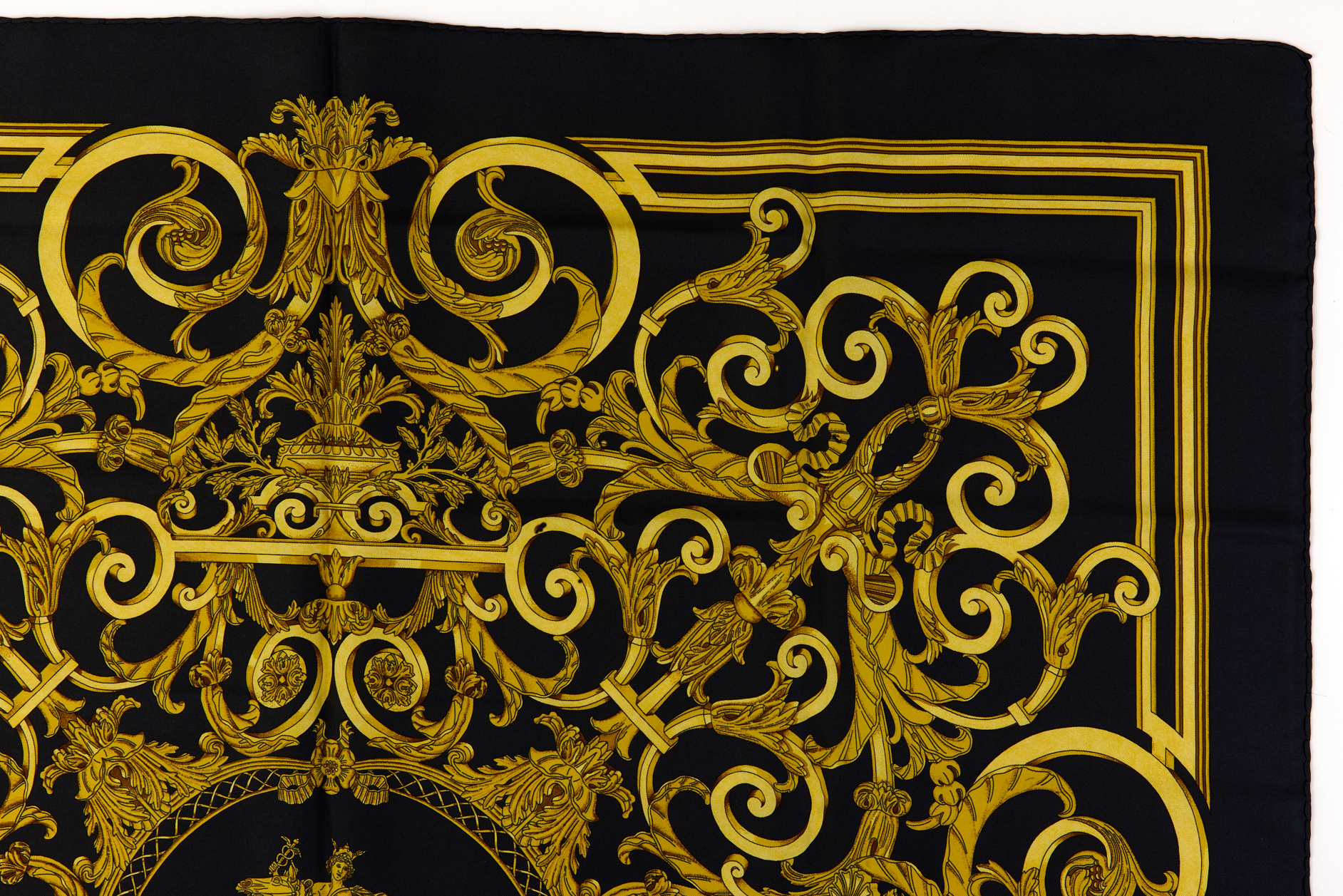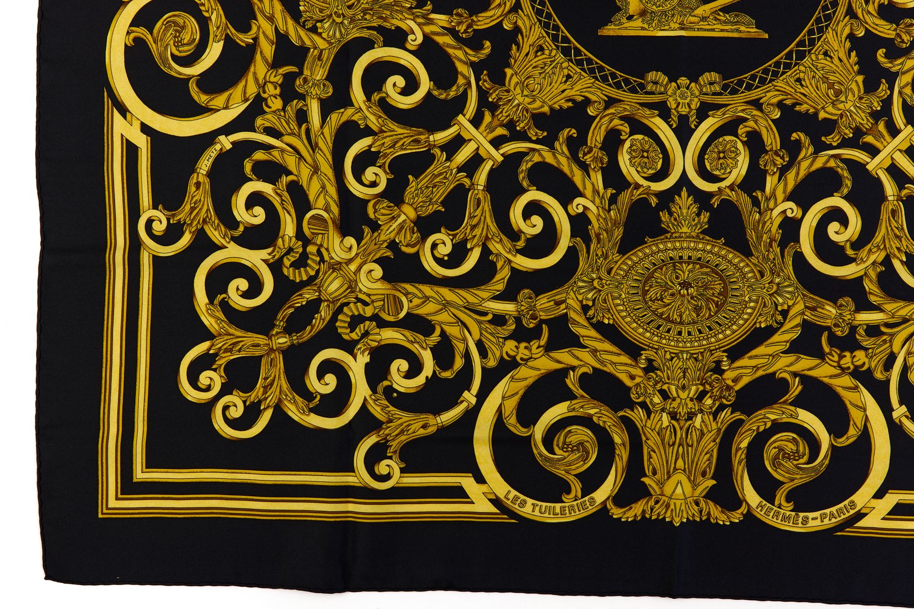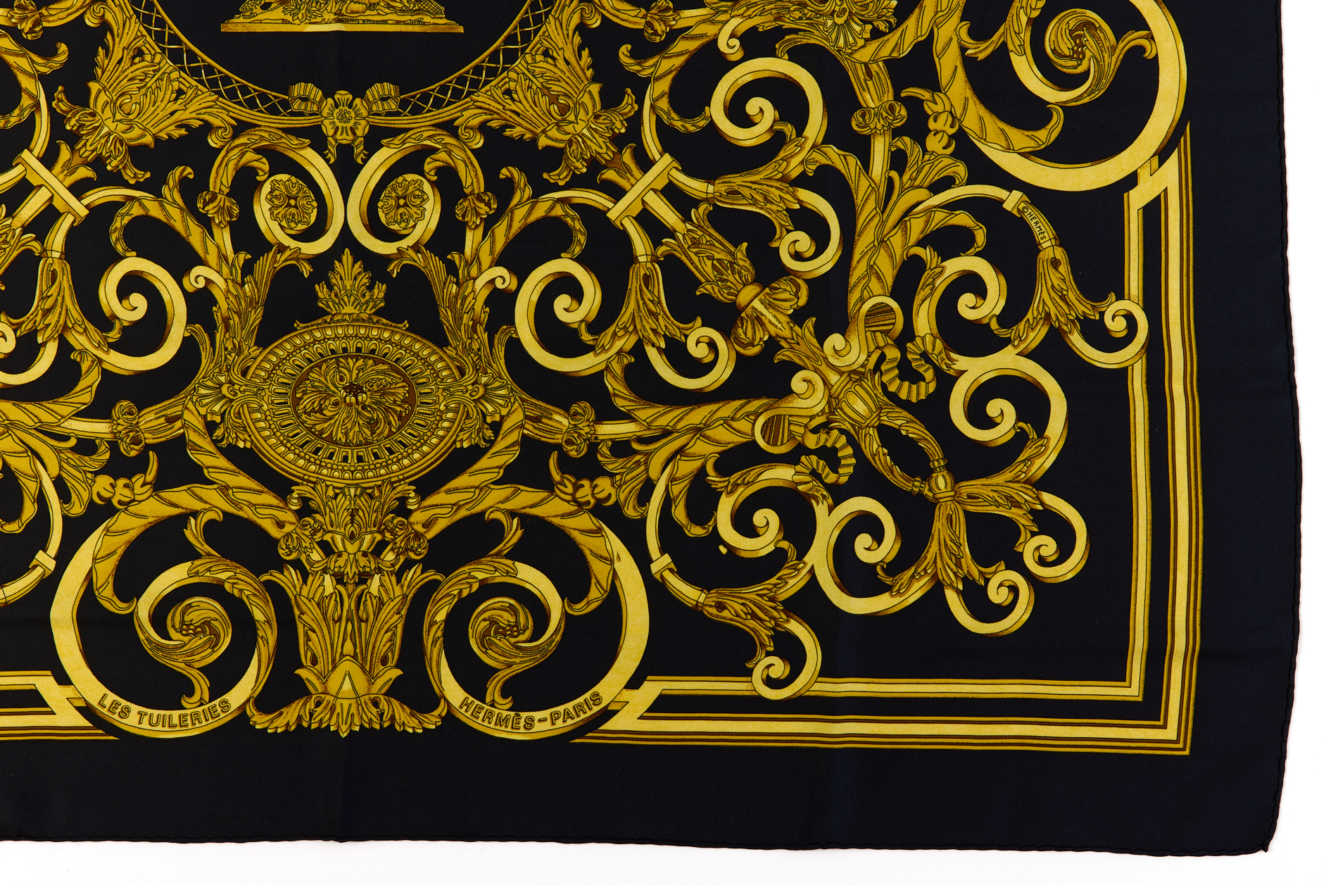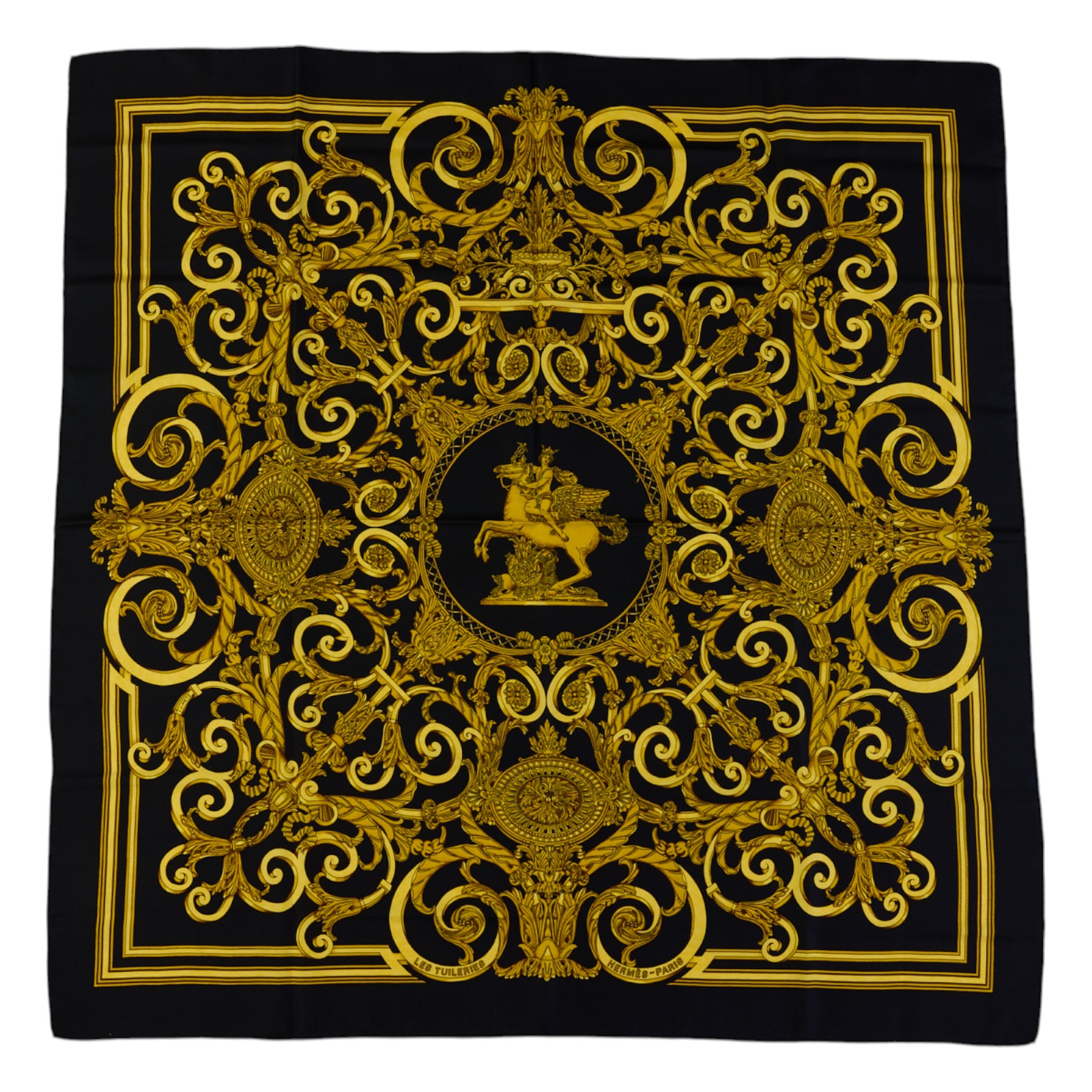 Hermes Silk Scarf Carre 90 “LES TUILERIES” Black Silk Scarf