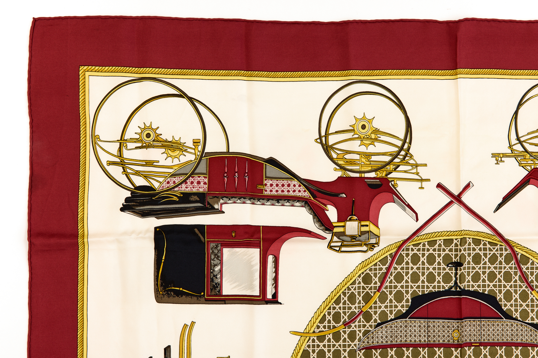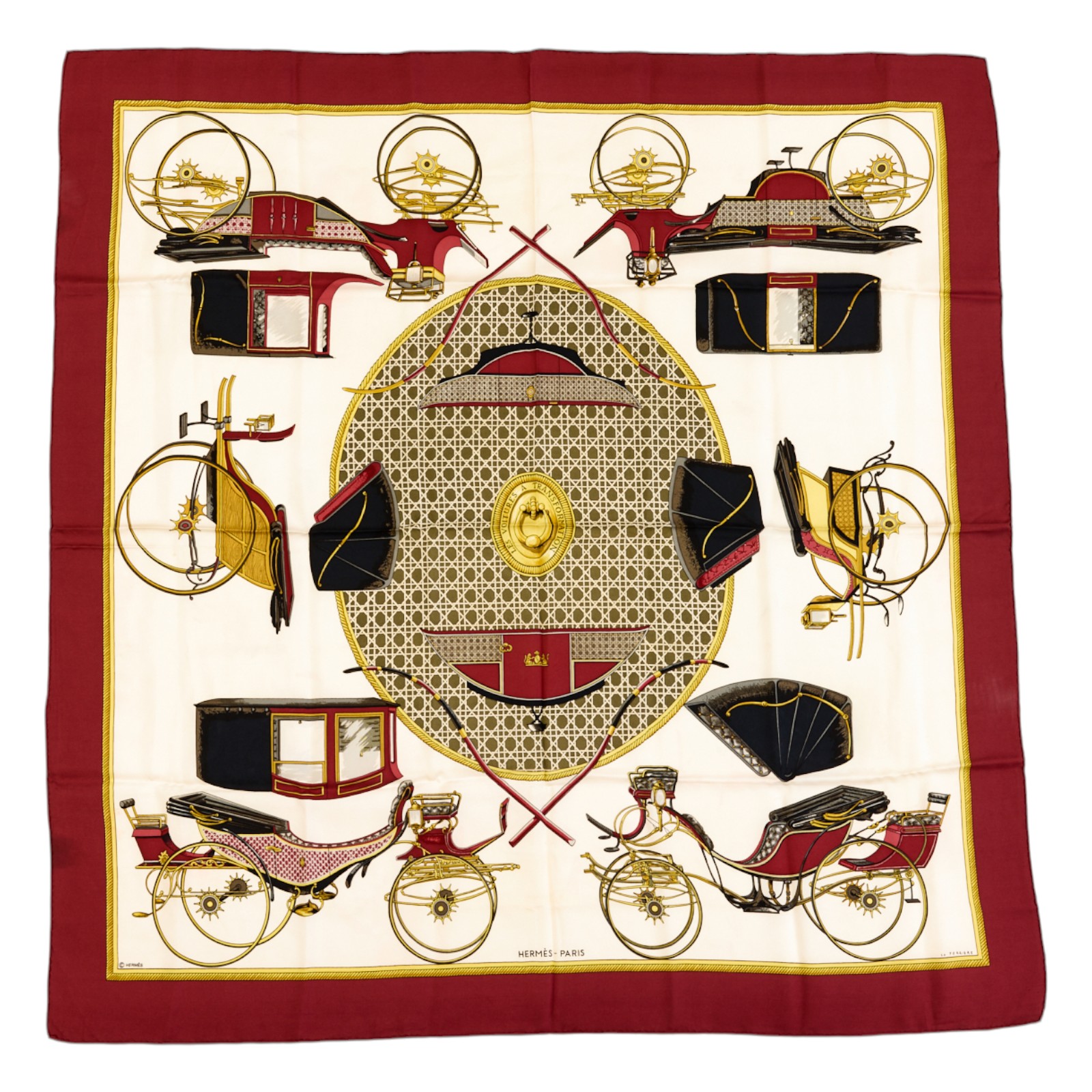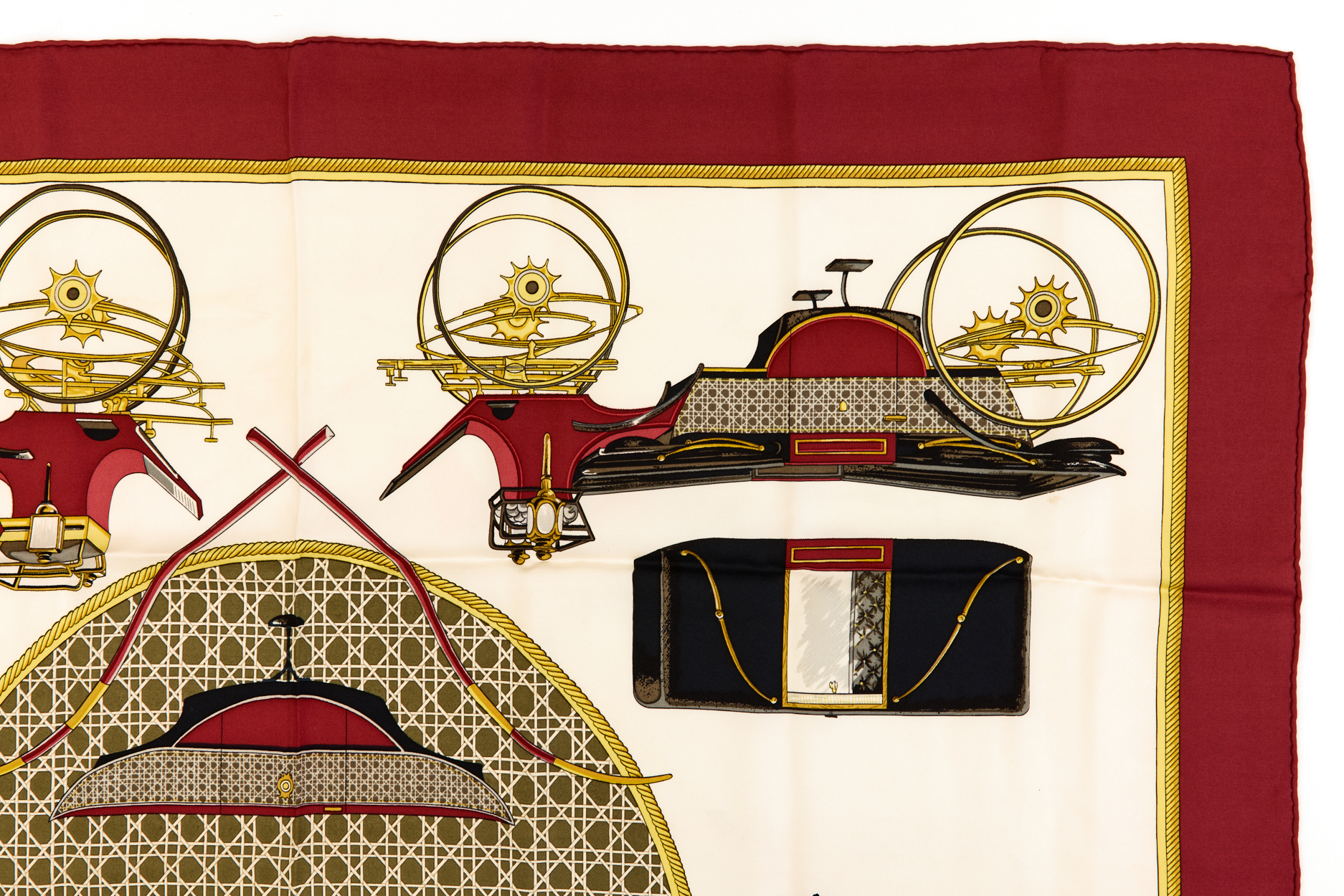 Hermes Silk Scarf Carre 90 “Les Voitures a Transformation” Red Silk Scarf