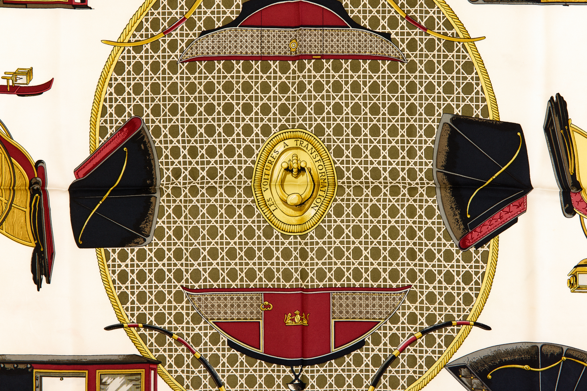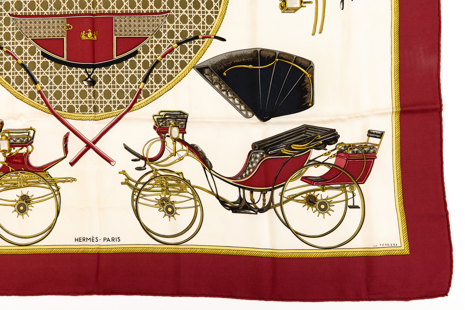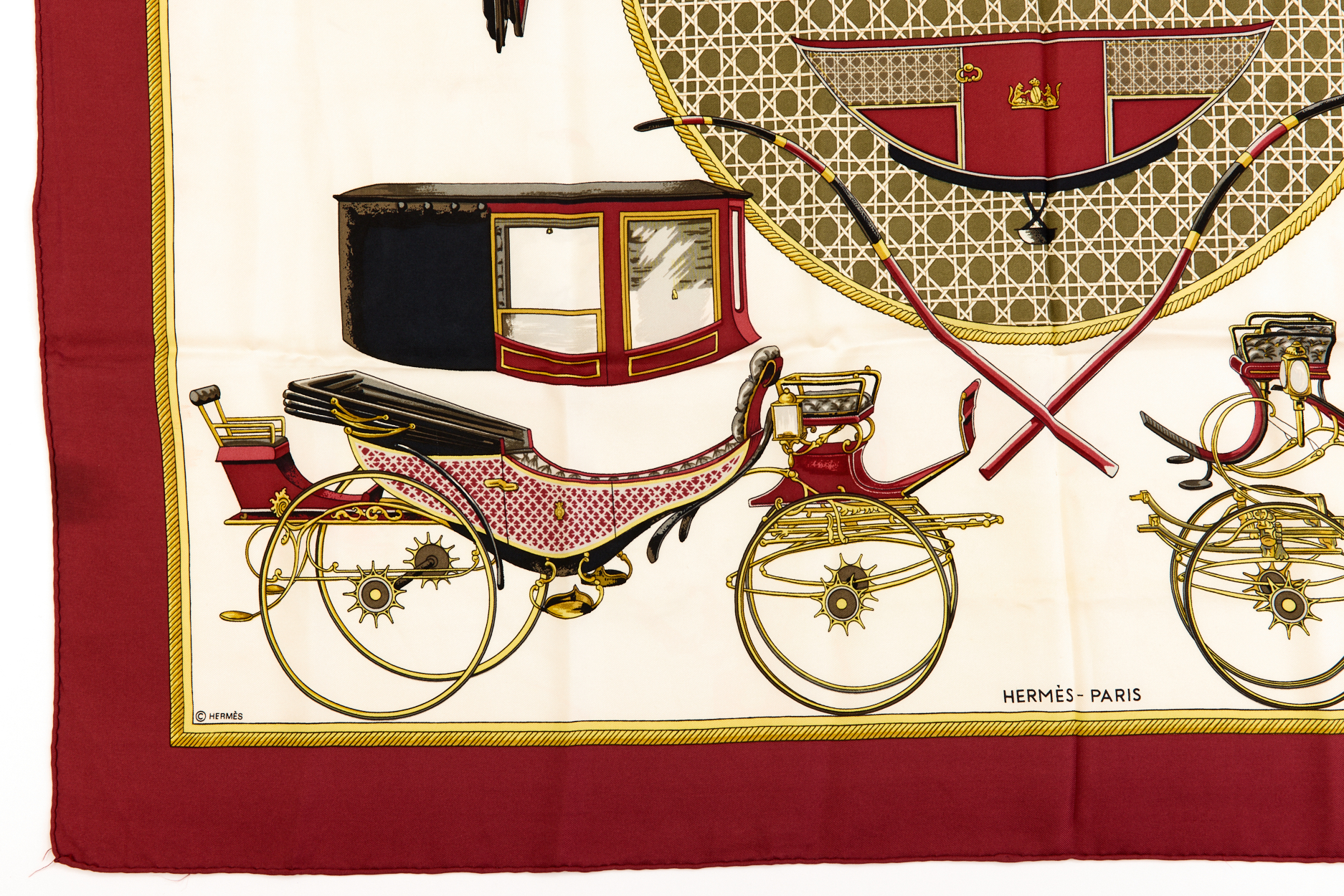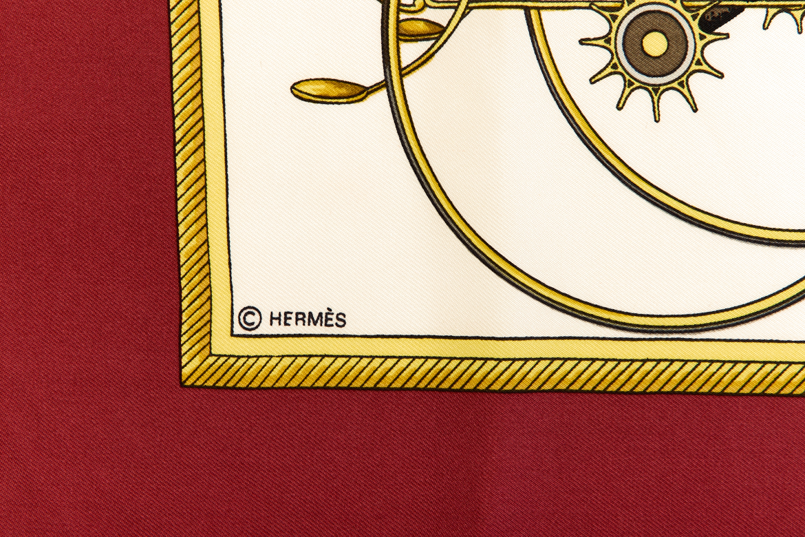 Hermes Silk Scarf Carre 90 “Les Voitures a Transformation” Red Silk Scarf