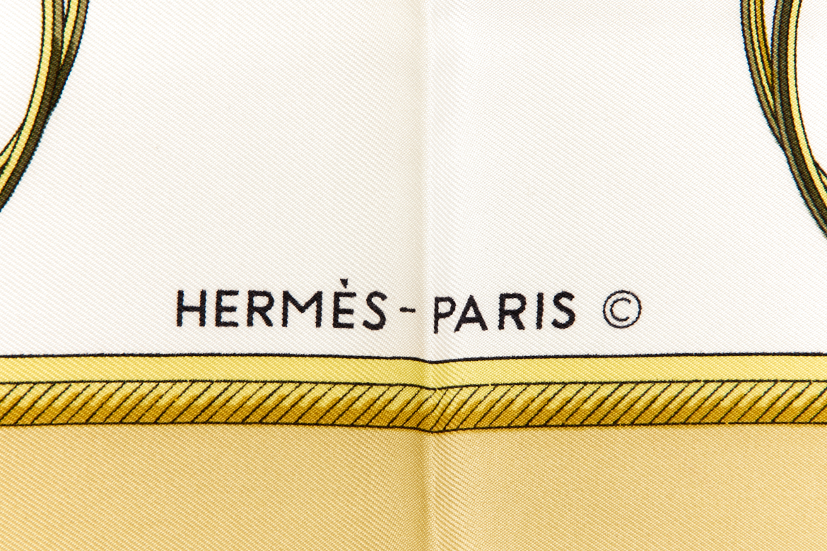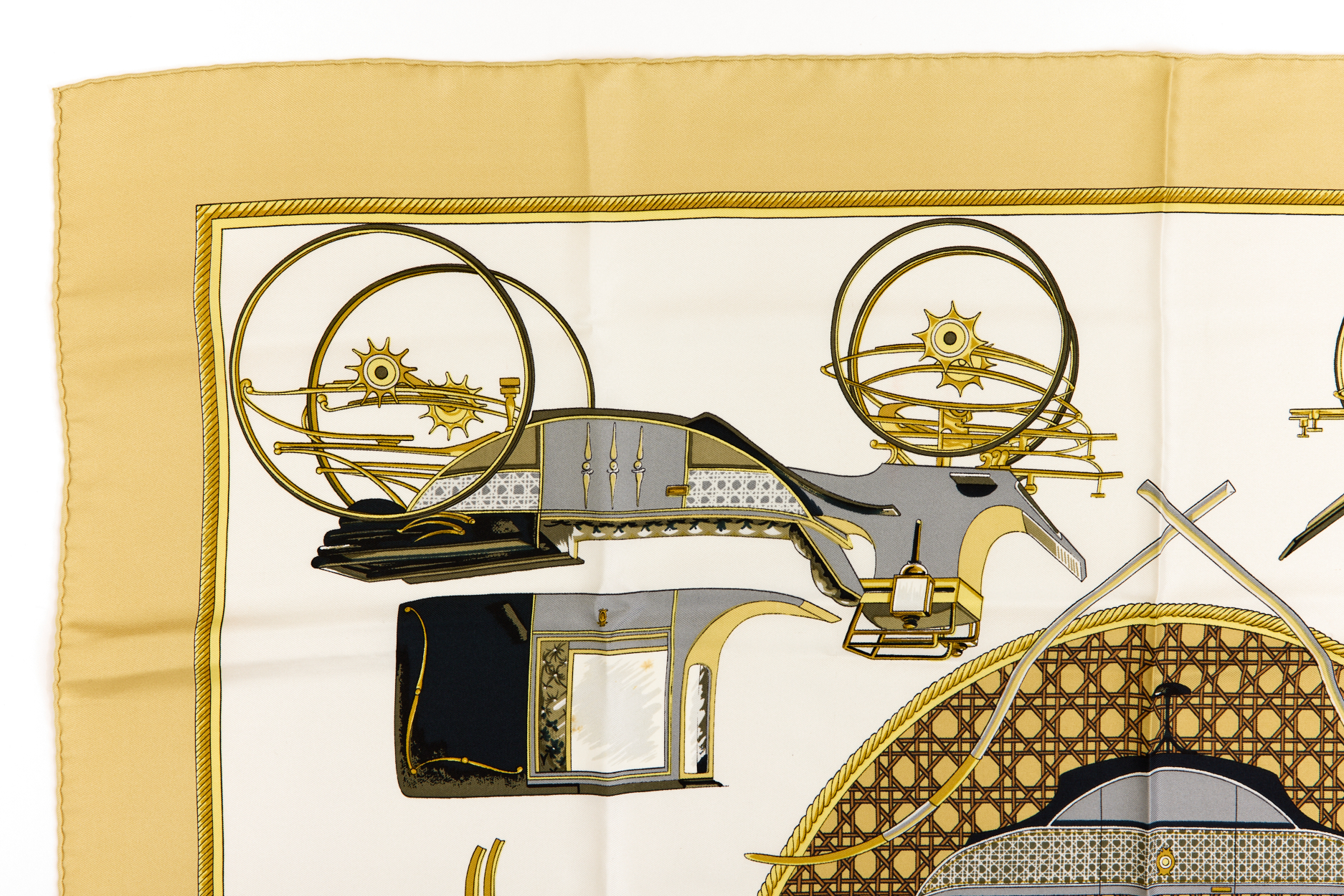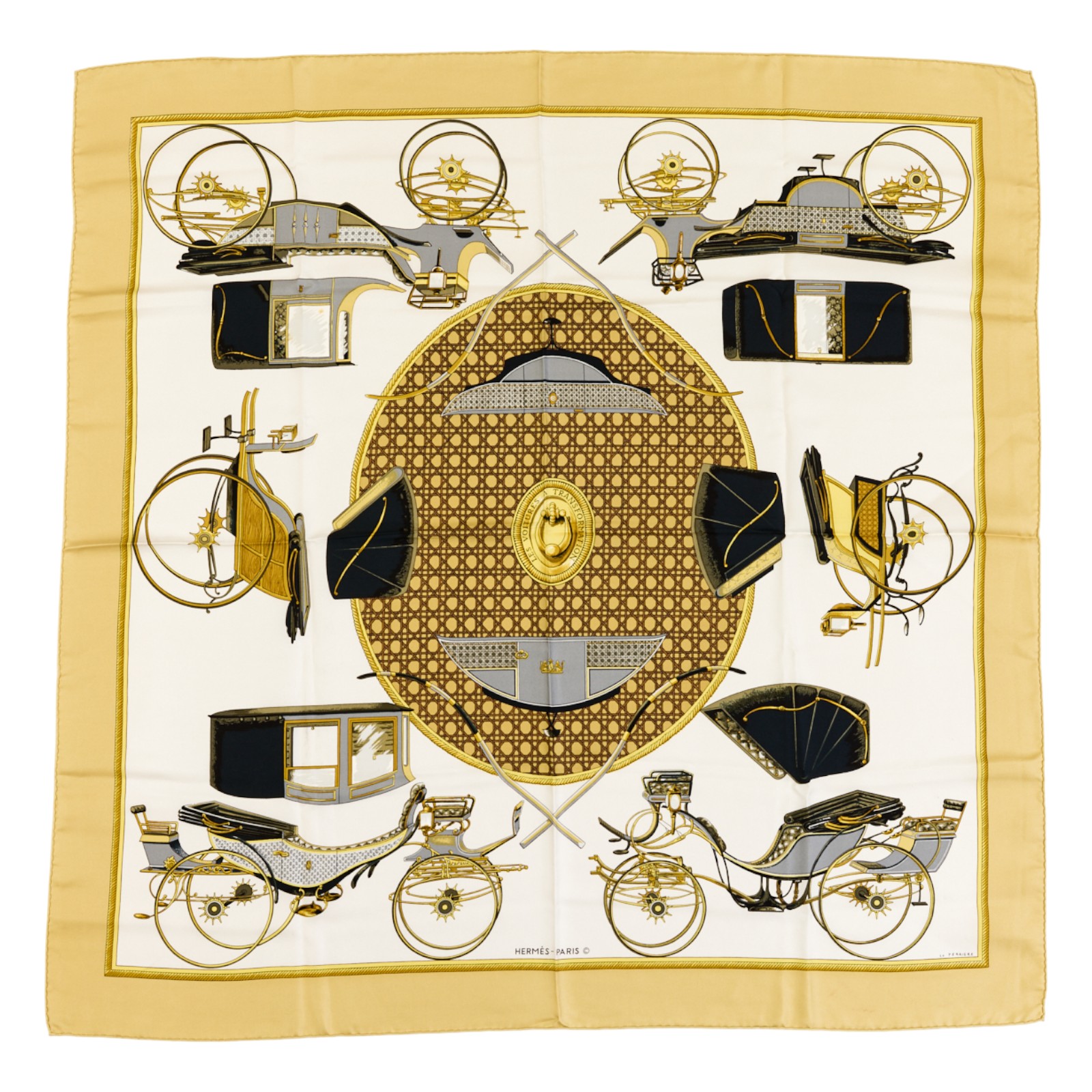 Hermes Silk Scarf Carre 90 “Les Voitures a Transformation” Yellow Silk Scarf