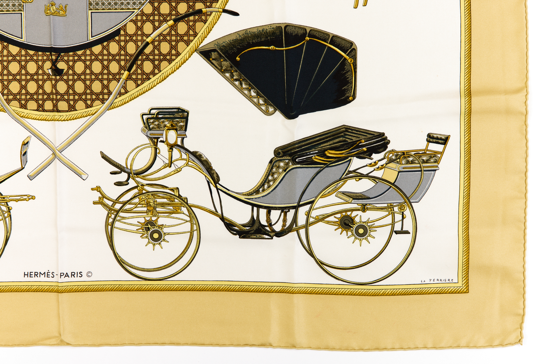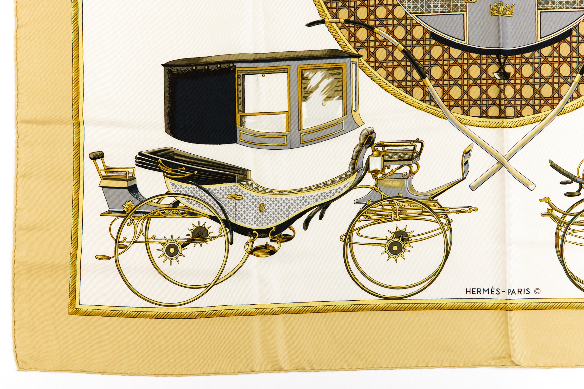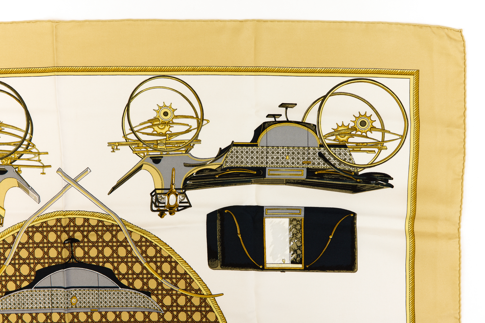 Hermes Silk Scarf Carre 90 “Les Voitures a Transformation” Yellow Silk Scarf