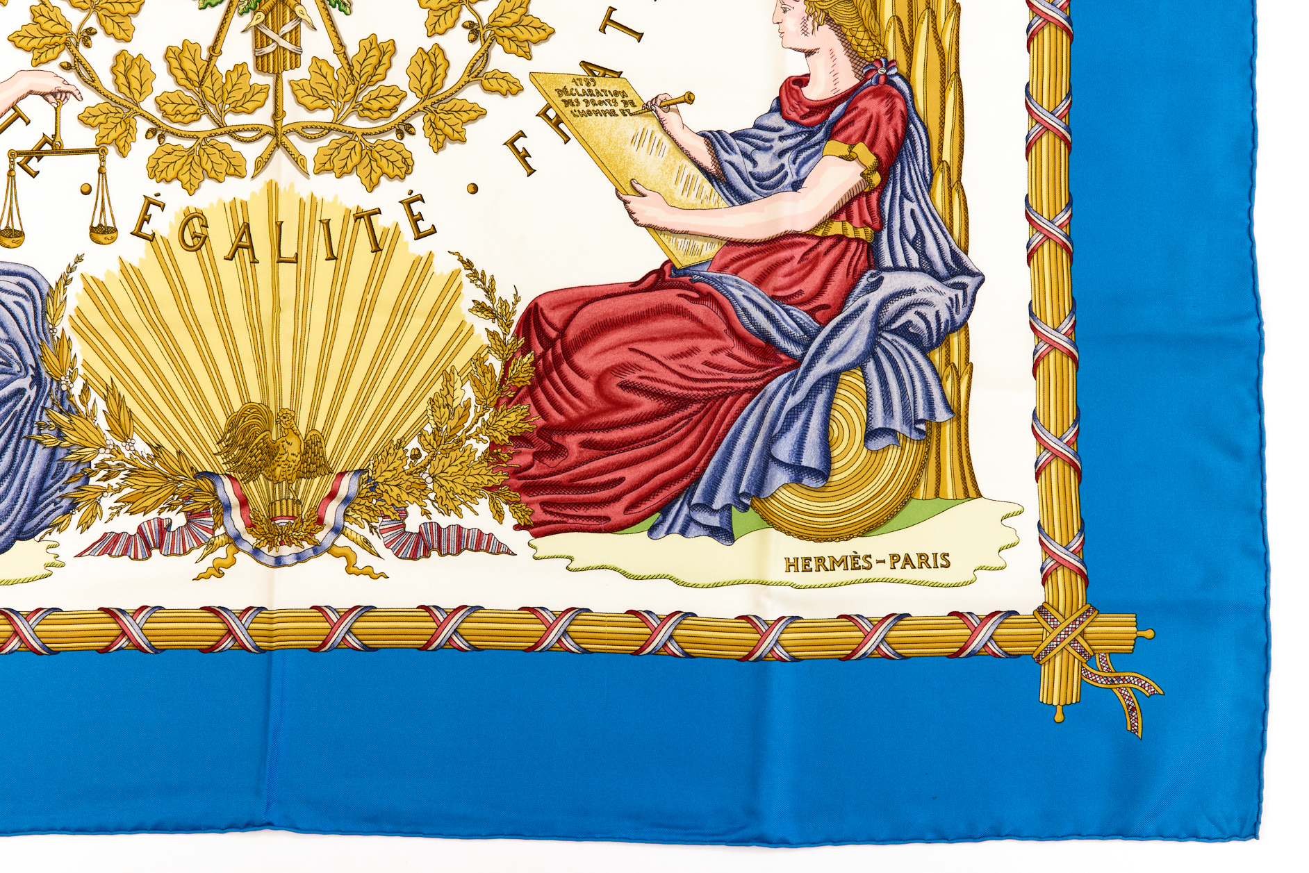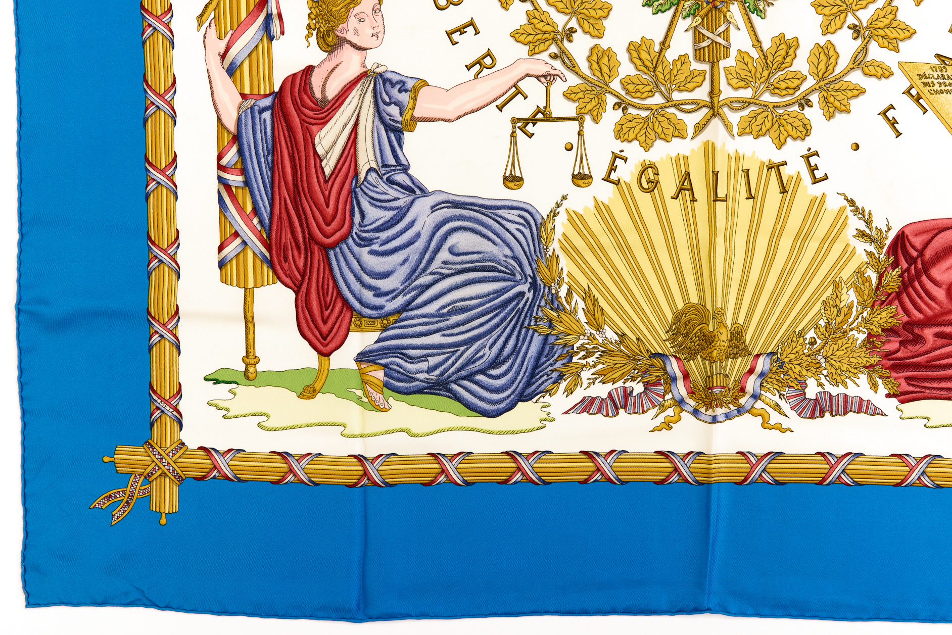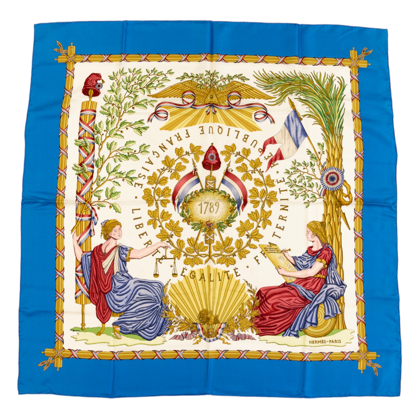 Hermes Silk Scarf Carre 90 “LIBERTE EGALITE FRATERNITE REPUBLIQUE FRANCAISE” Blue Silk Scarf