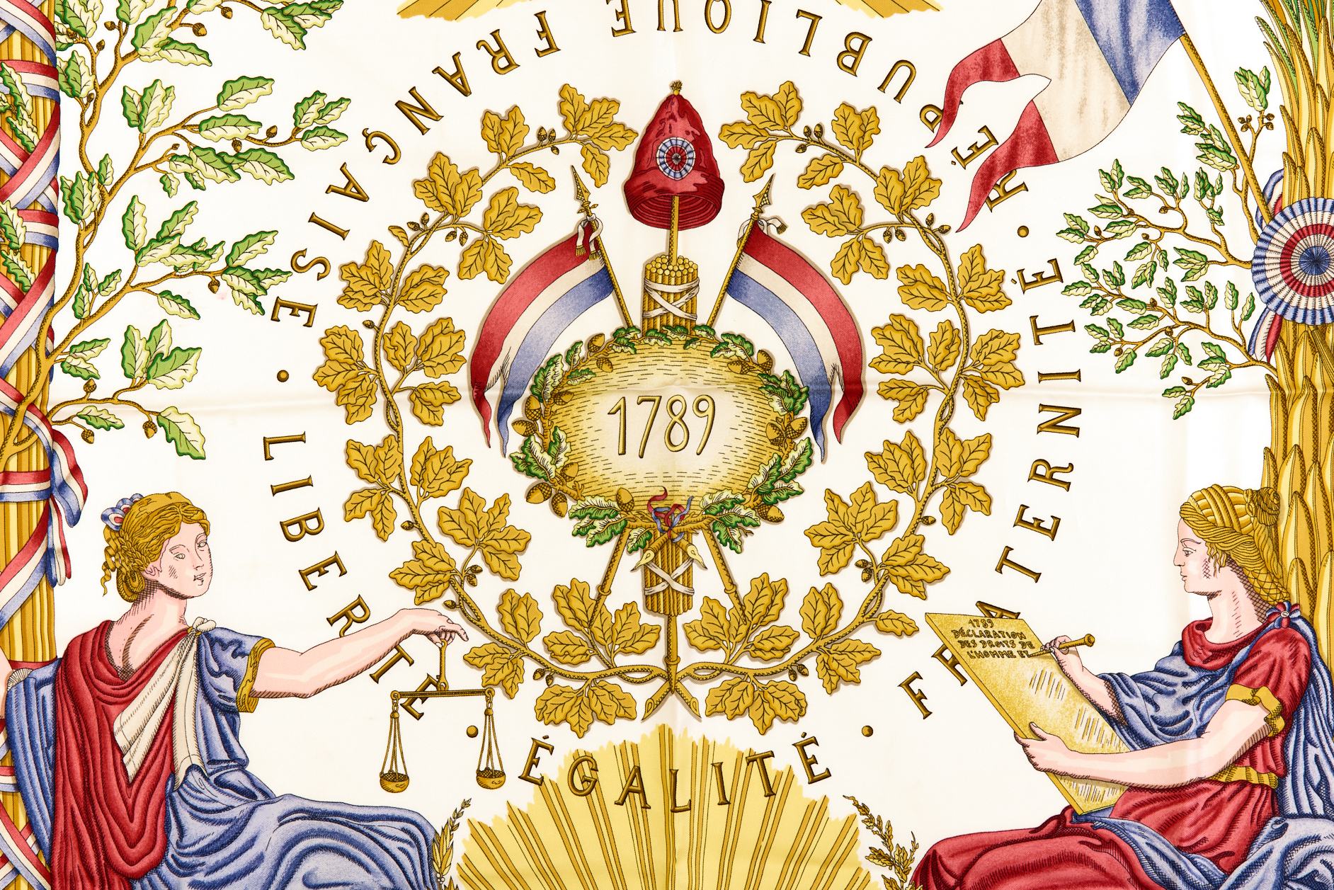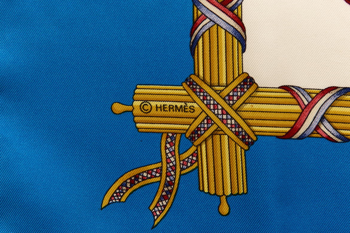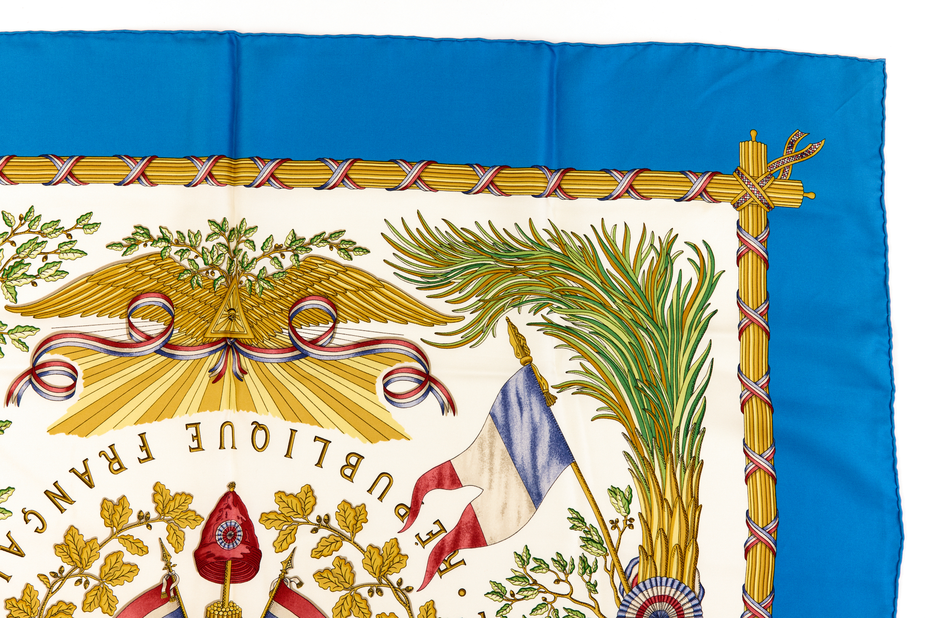 Hermes Silk Scarf Carre 90 “LIBERTE EGALITE FRATERNITE REPUBLIQUE FRANCAISE” Blue Silk Scarf