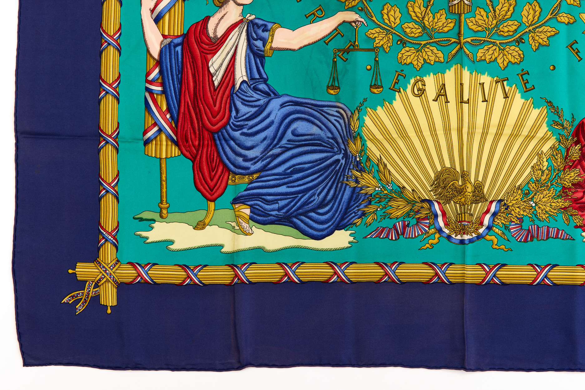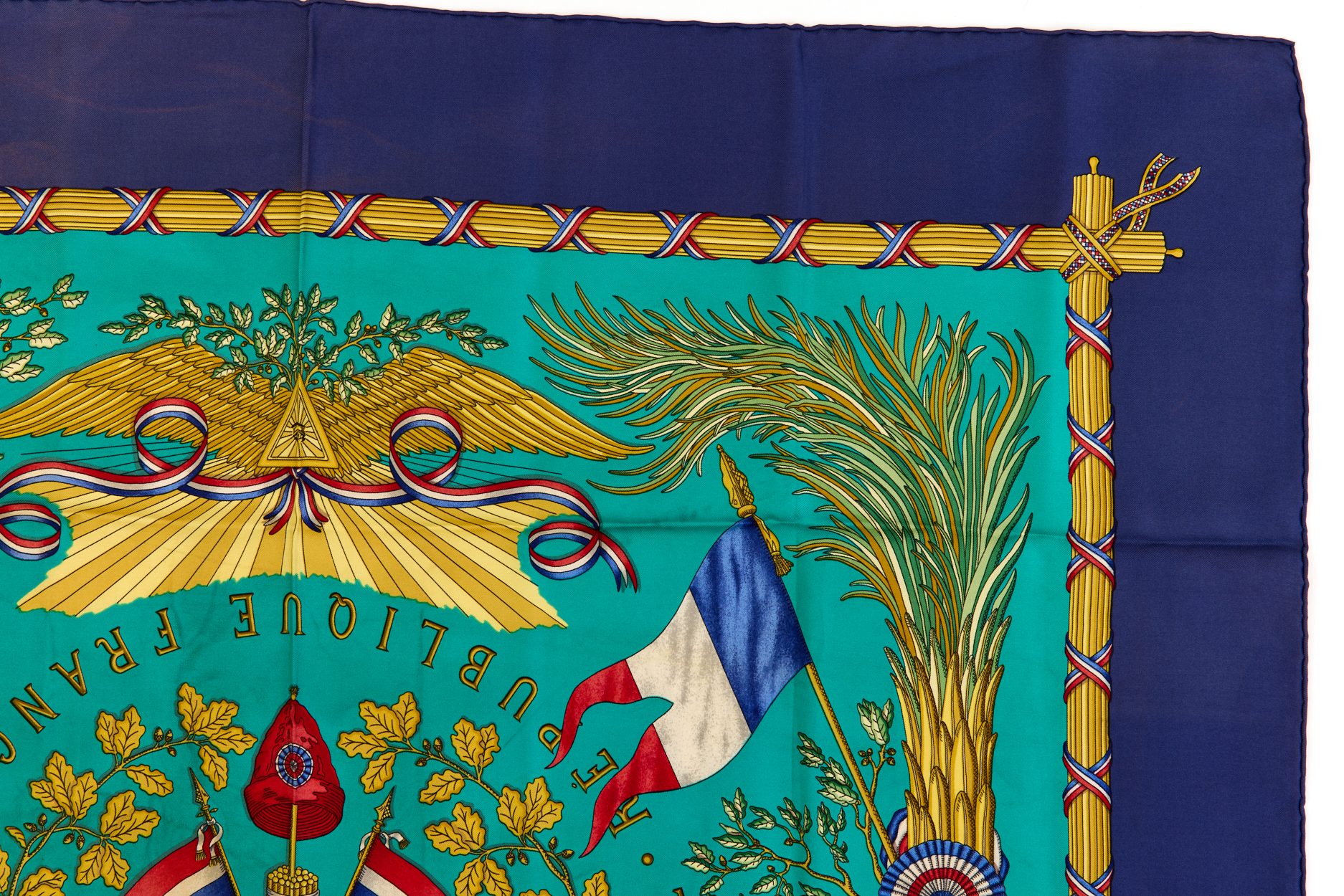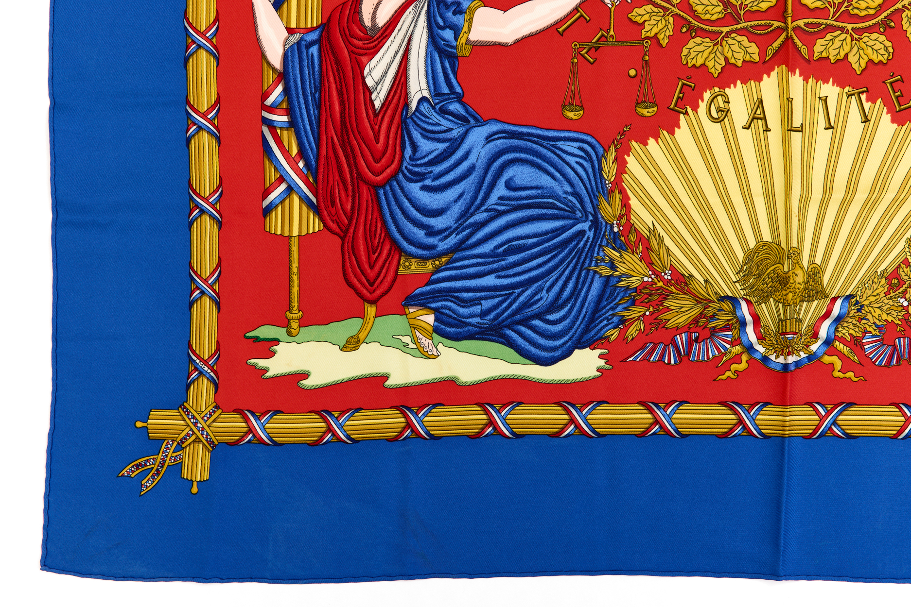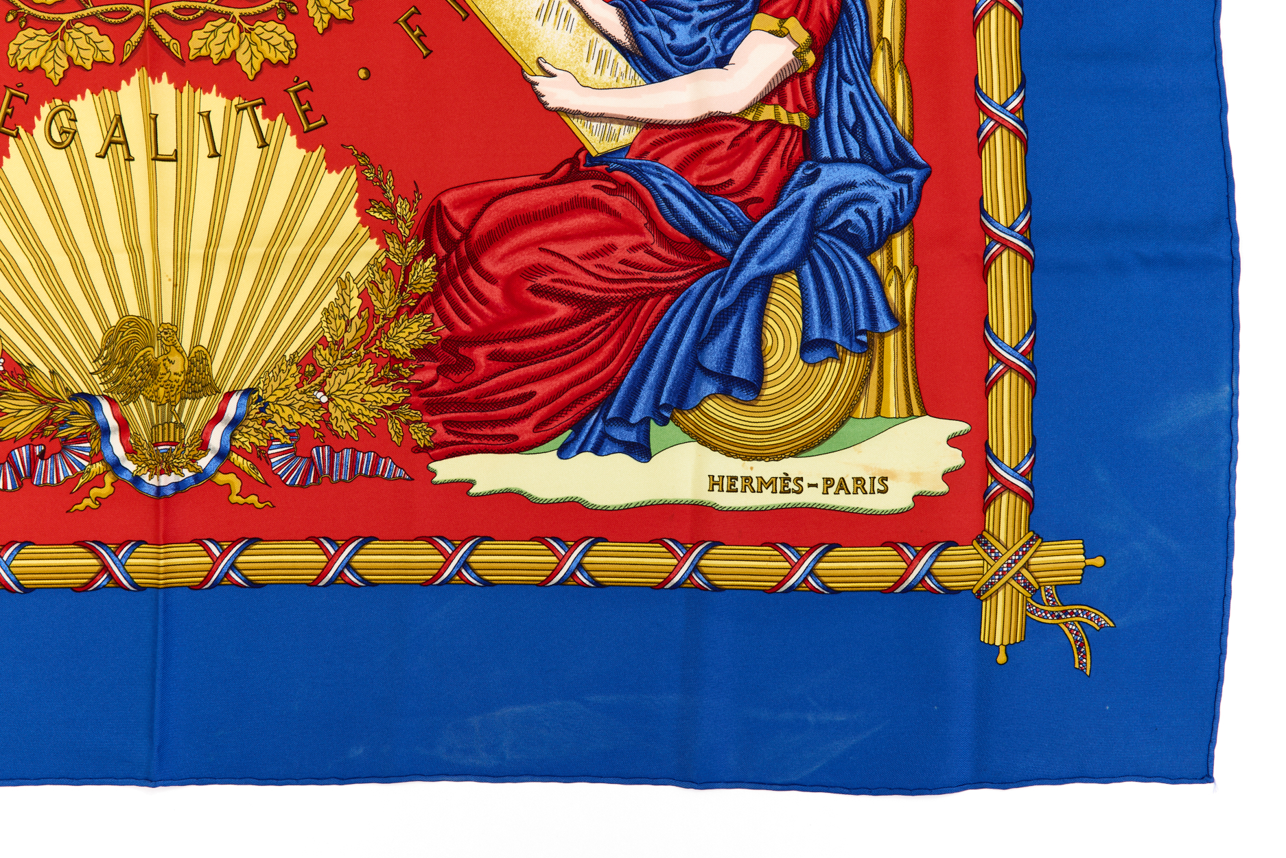 Hermes Silk Scarf Carre 90 “LIBERTE EGALITE FRATERNITE REPUBLIQUE FRANCAISE” Blue Silk Scarf