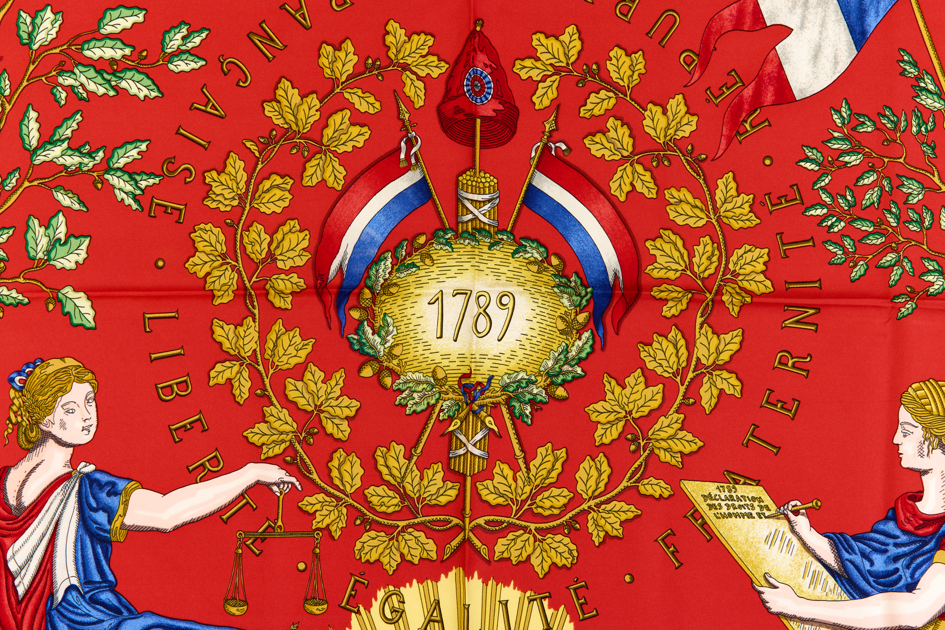 Hermes Silk Scarf Carre 90 “LIBERTE EGALITE FRATERNITE REPUBLIQUE FRANCAISE” Blue Silk Scarf Brand : HERMESDesign by Joachim Metz Issued 1989Item : ScarfSize : 88.5cm * 88.5cmMaterial : 100% SilkCondition Score: B-(Color faded)*For reference. The condition shown in the image takes precedence.*Please see the last two photos to see if the tag is still attached