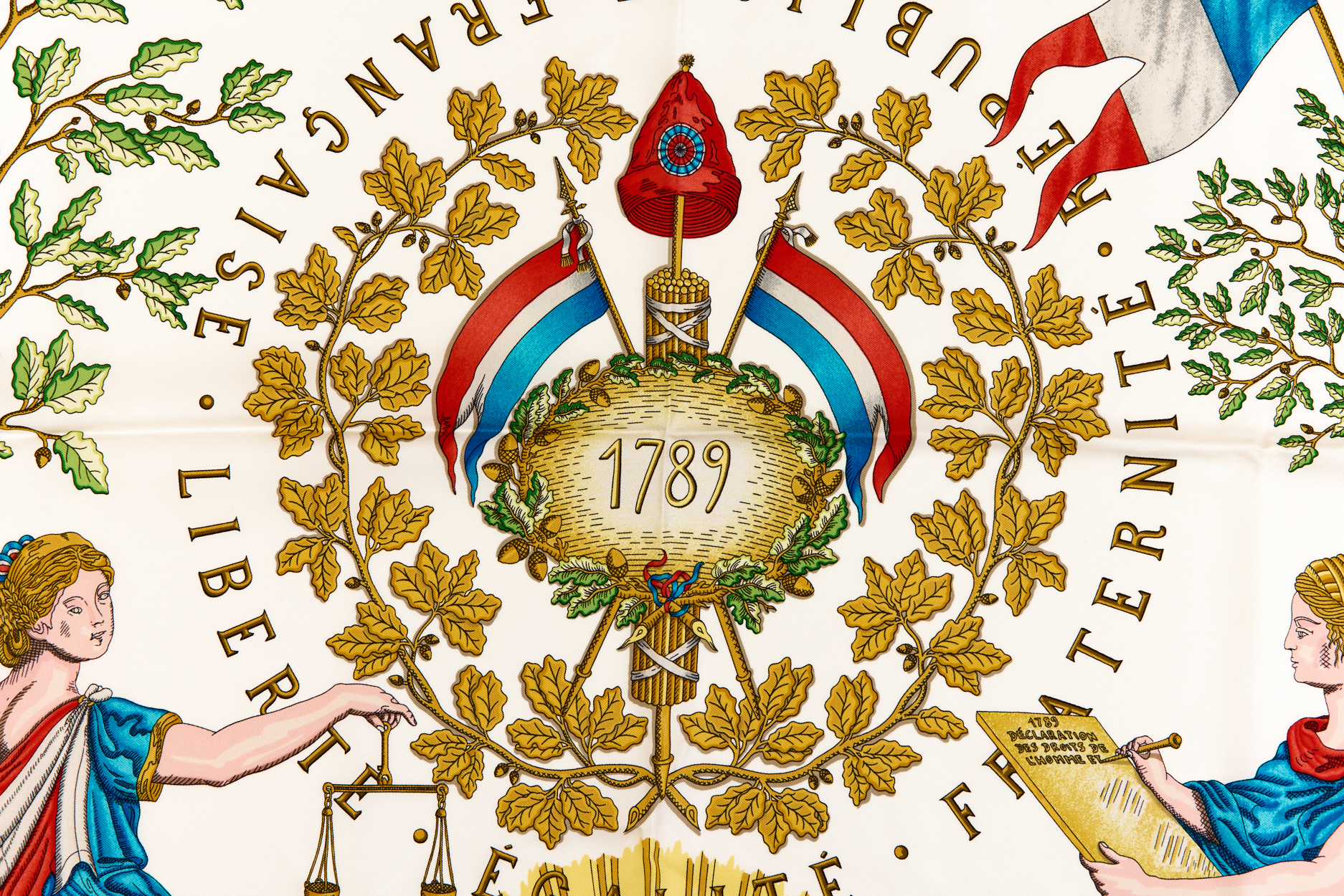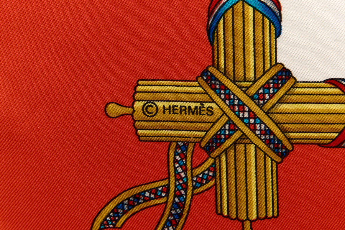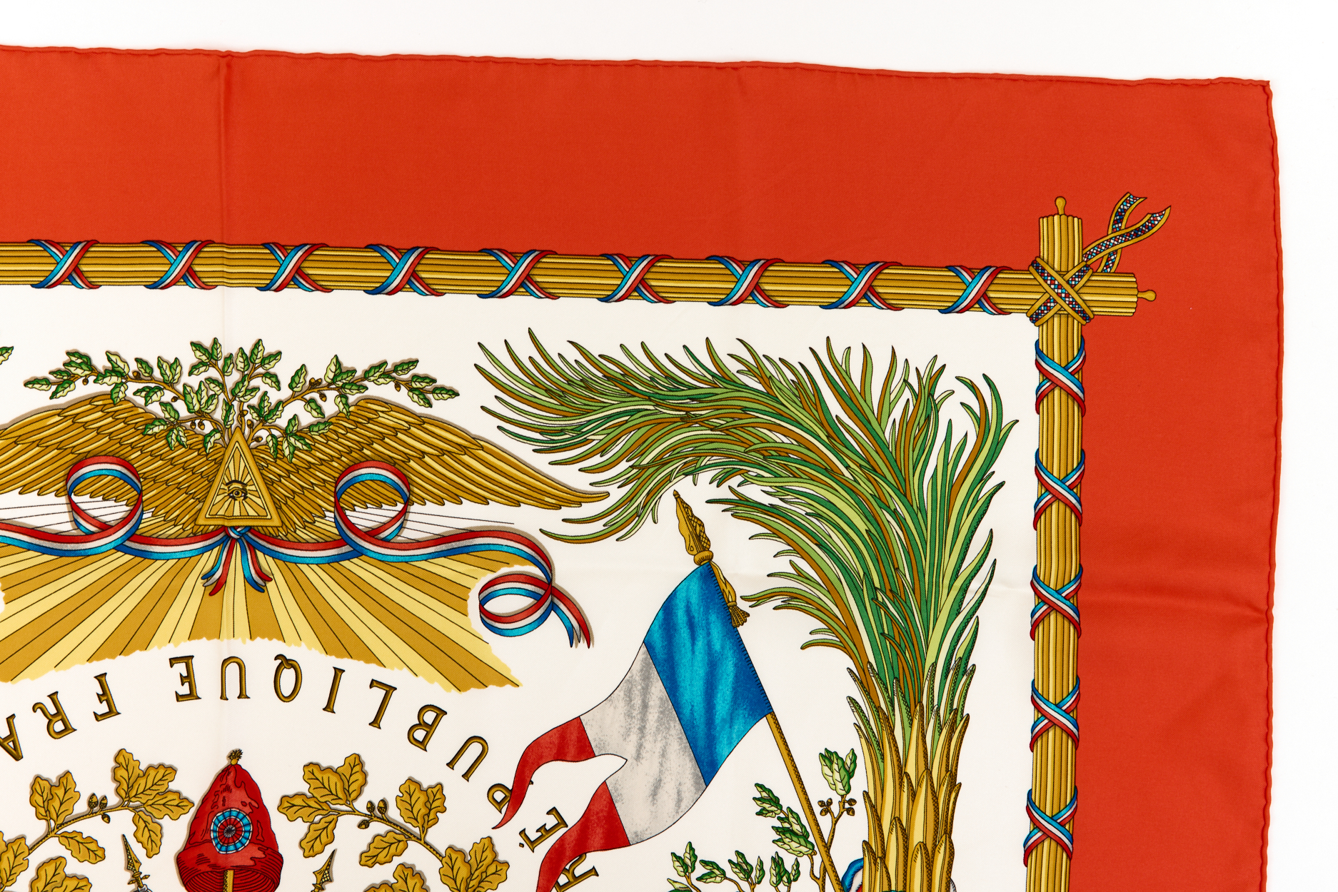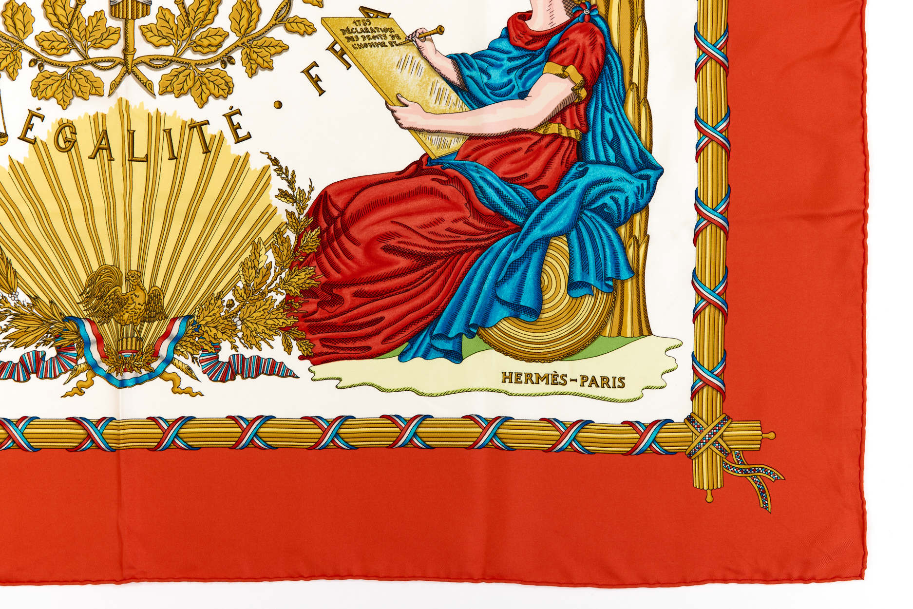 Hermes Silk Scarf Carre 90 “LIBERTE EGALITE FRATERNITE REPUBLIQUE FRANCAISE” Orange Silk Scarf